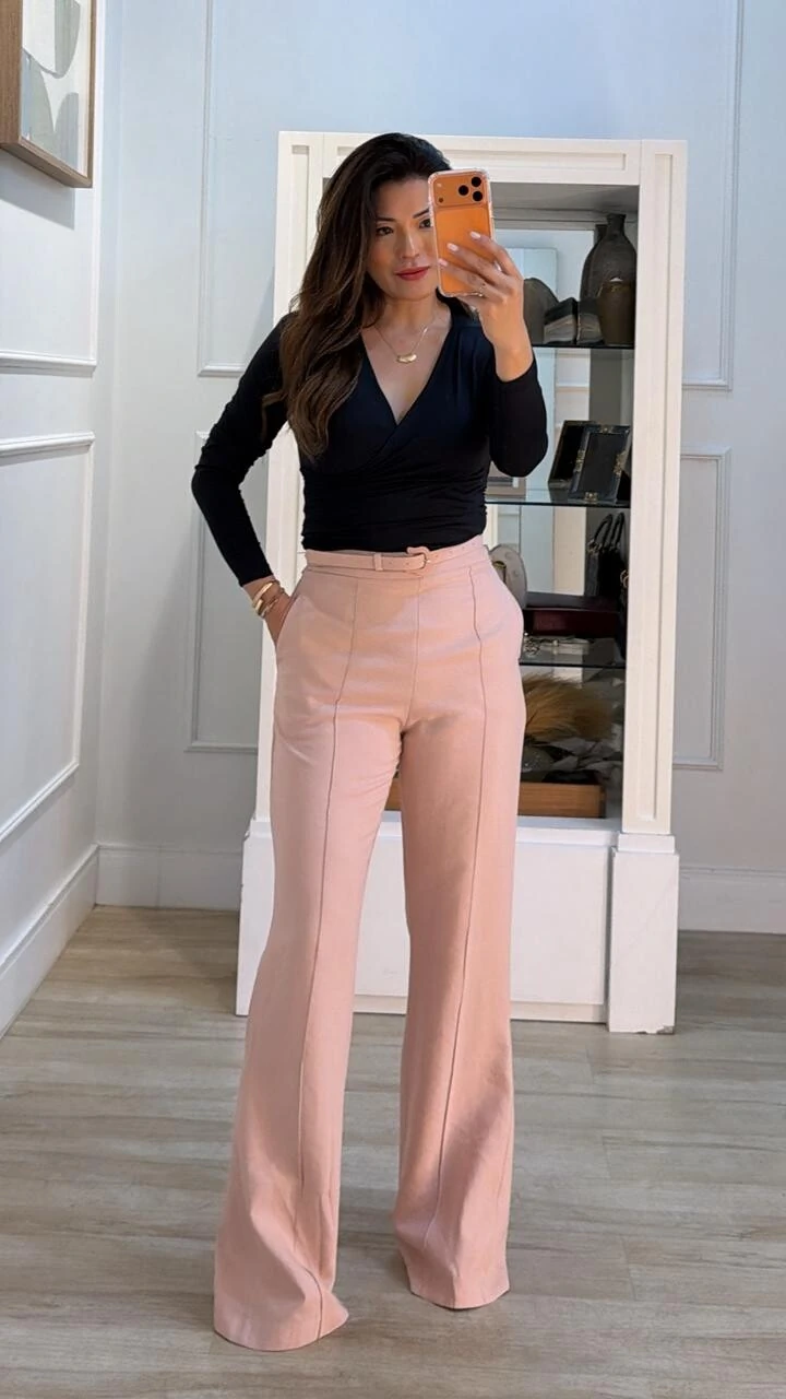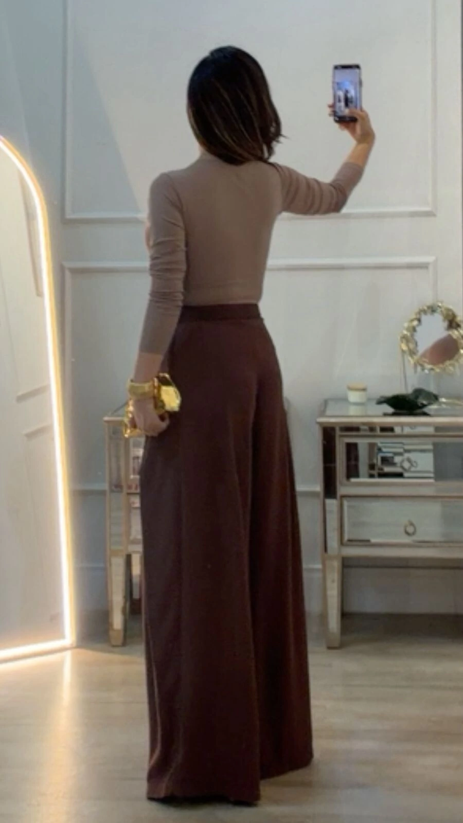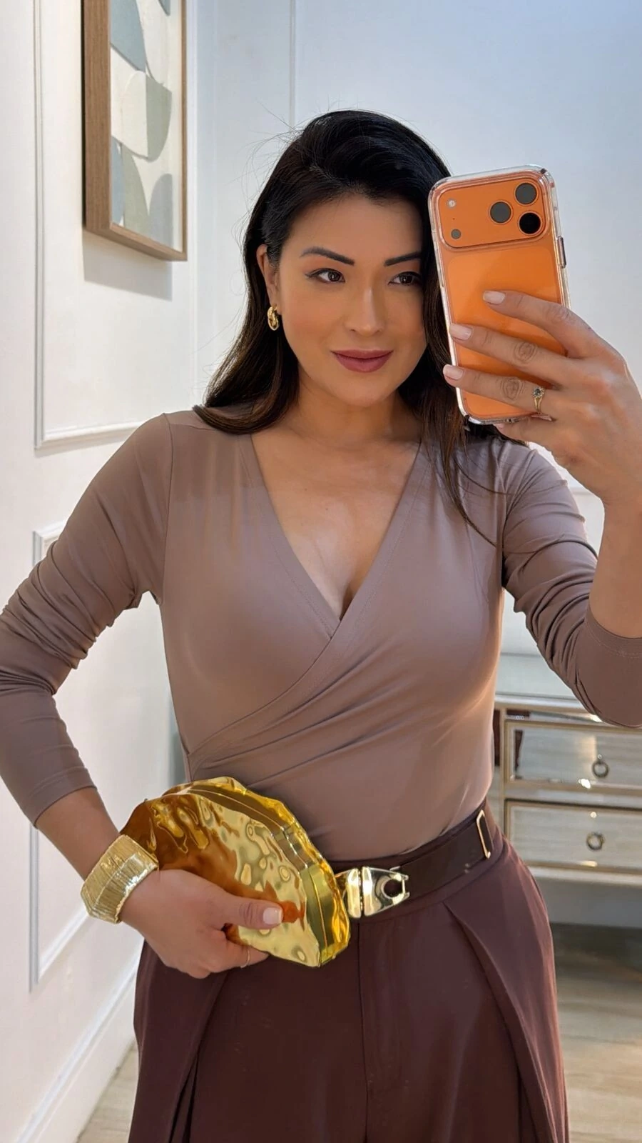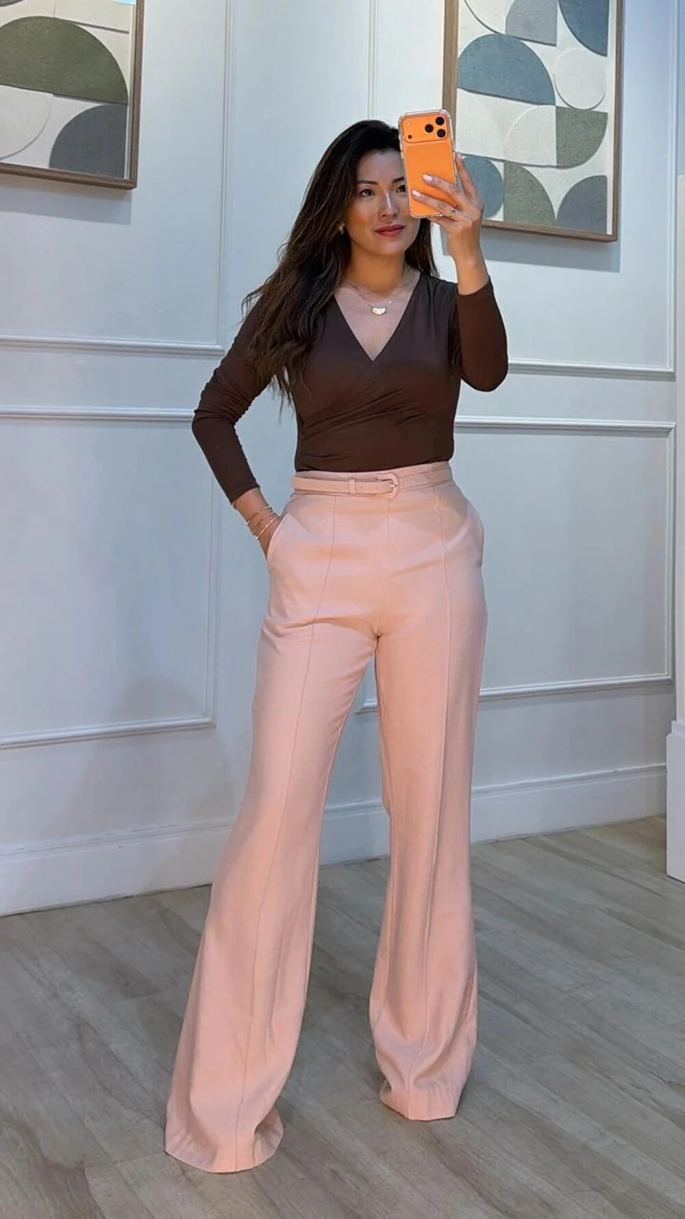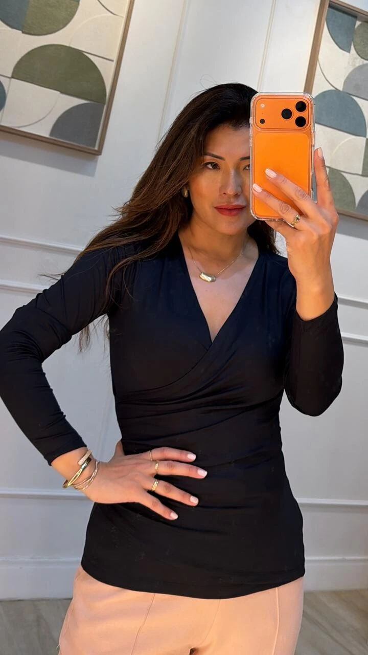 Blusa cachequer confeccionada em malha fria (suplex). Possui mangas longas e decote transpassado com detalhes de pregas.