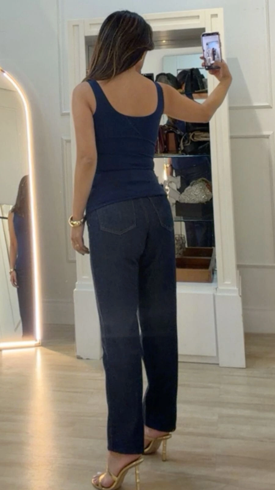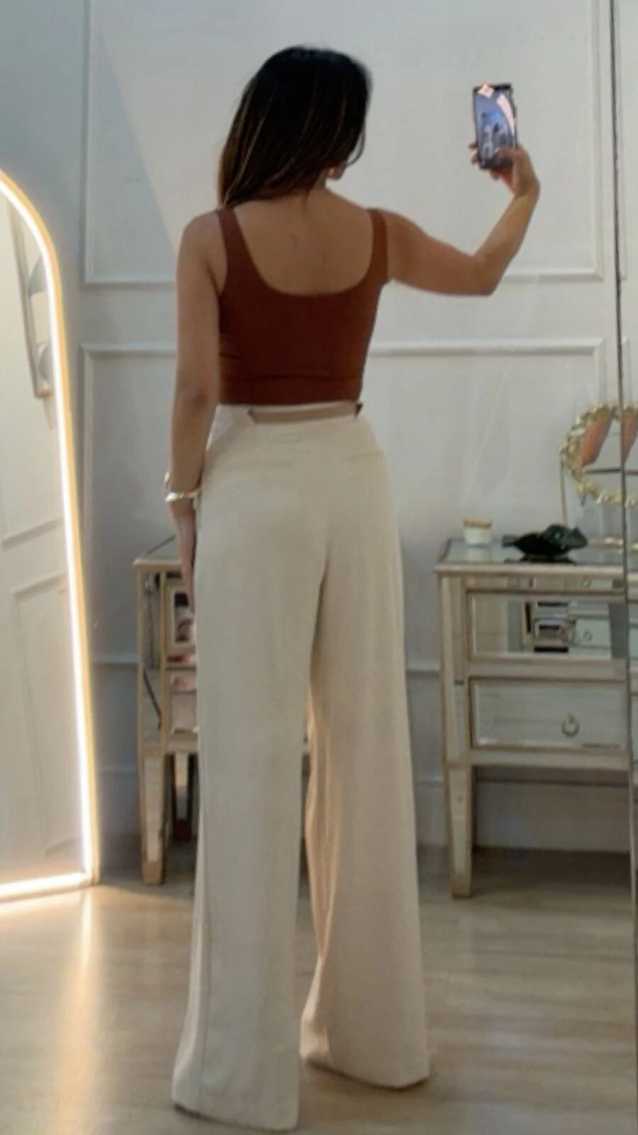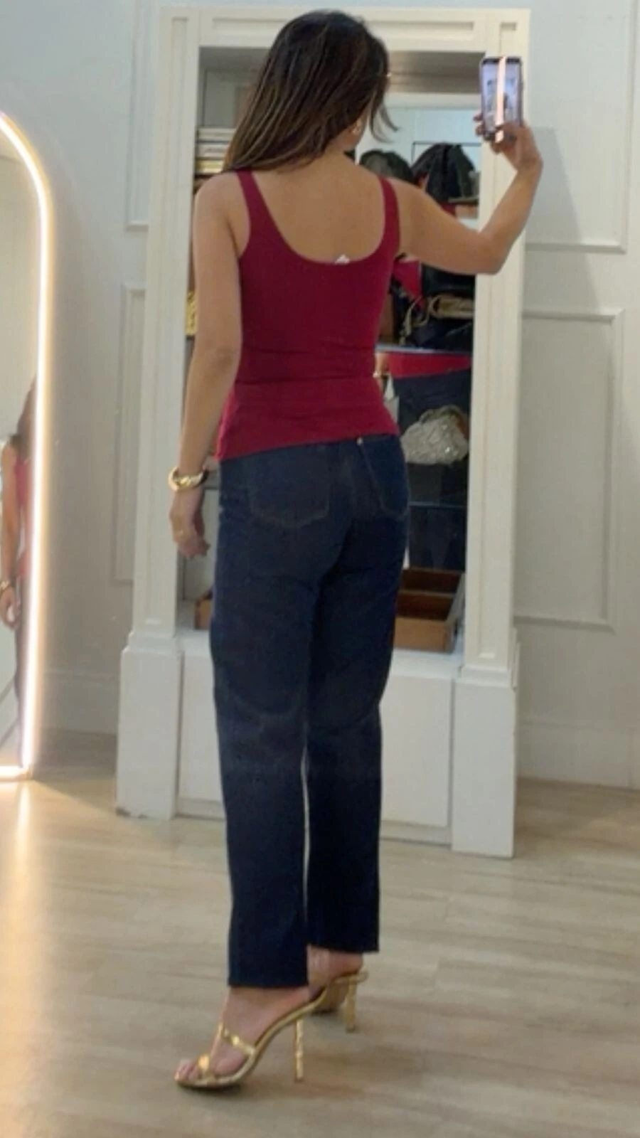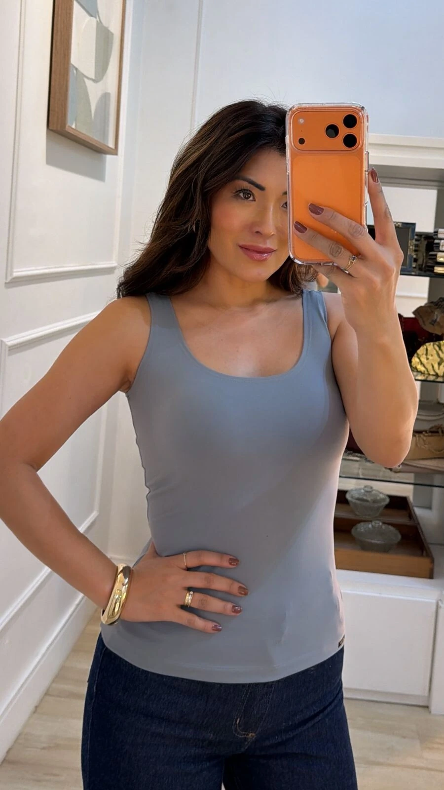 Regata confeccionada em malha. Possui decote em U, alças largas e pesponto.