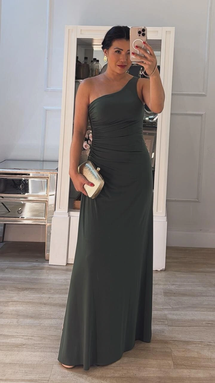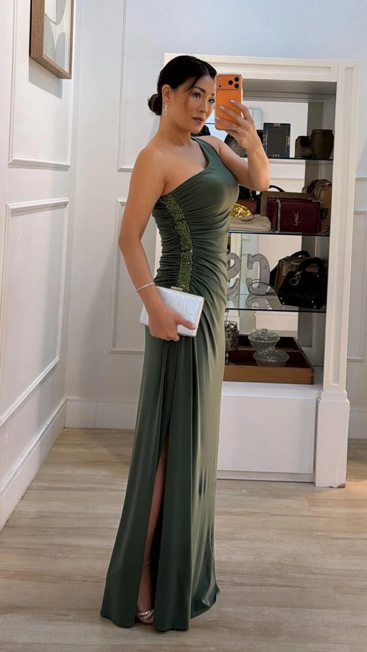 Vestido de festa, comprimento longo. Modelagem um ombro só com detalhe drapeado e paetês. Alça larga, fenda lateral, e forro.