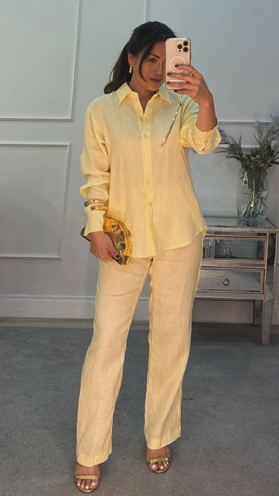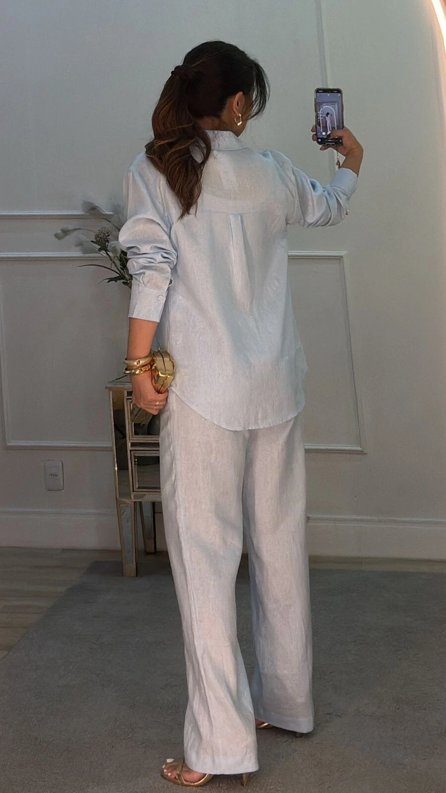 Camisa alongada confeccionada em linho. Possui mangas longas, gola, botões frontais e nos punhos.