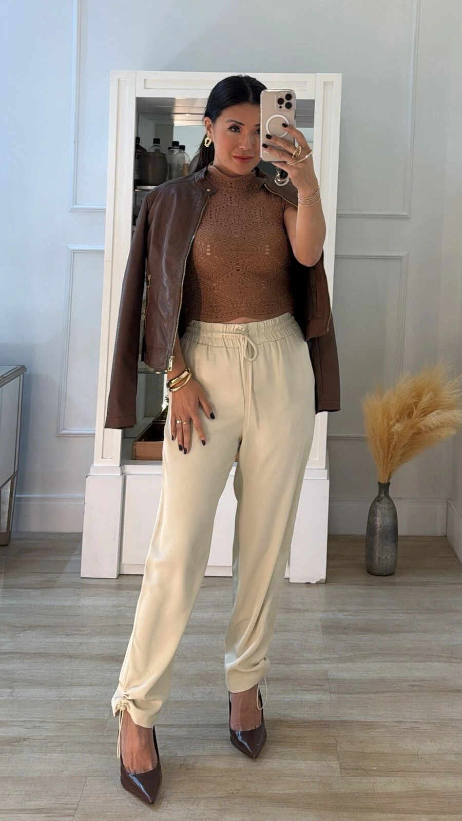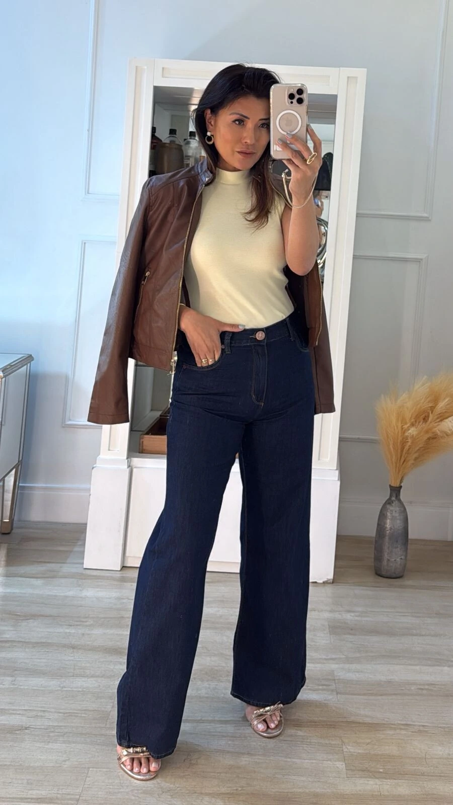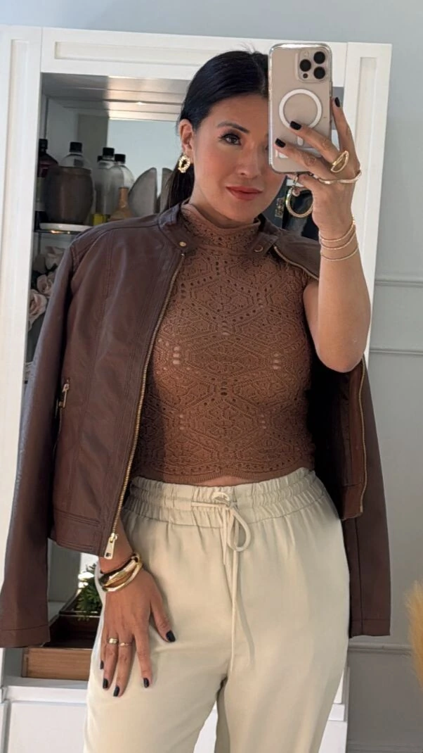 Jaqueta confeccionada em couro eco. Possui gola transpassada com fechamento por botão de pressão dourado, mangas longas, recorte, pesponto, bolsos frontais, forro, fechamento frontal da peça e dos bolsos por zíper dourado.