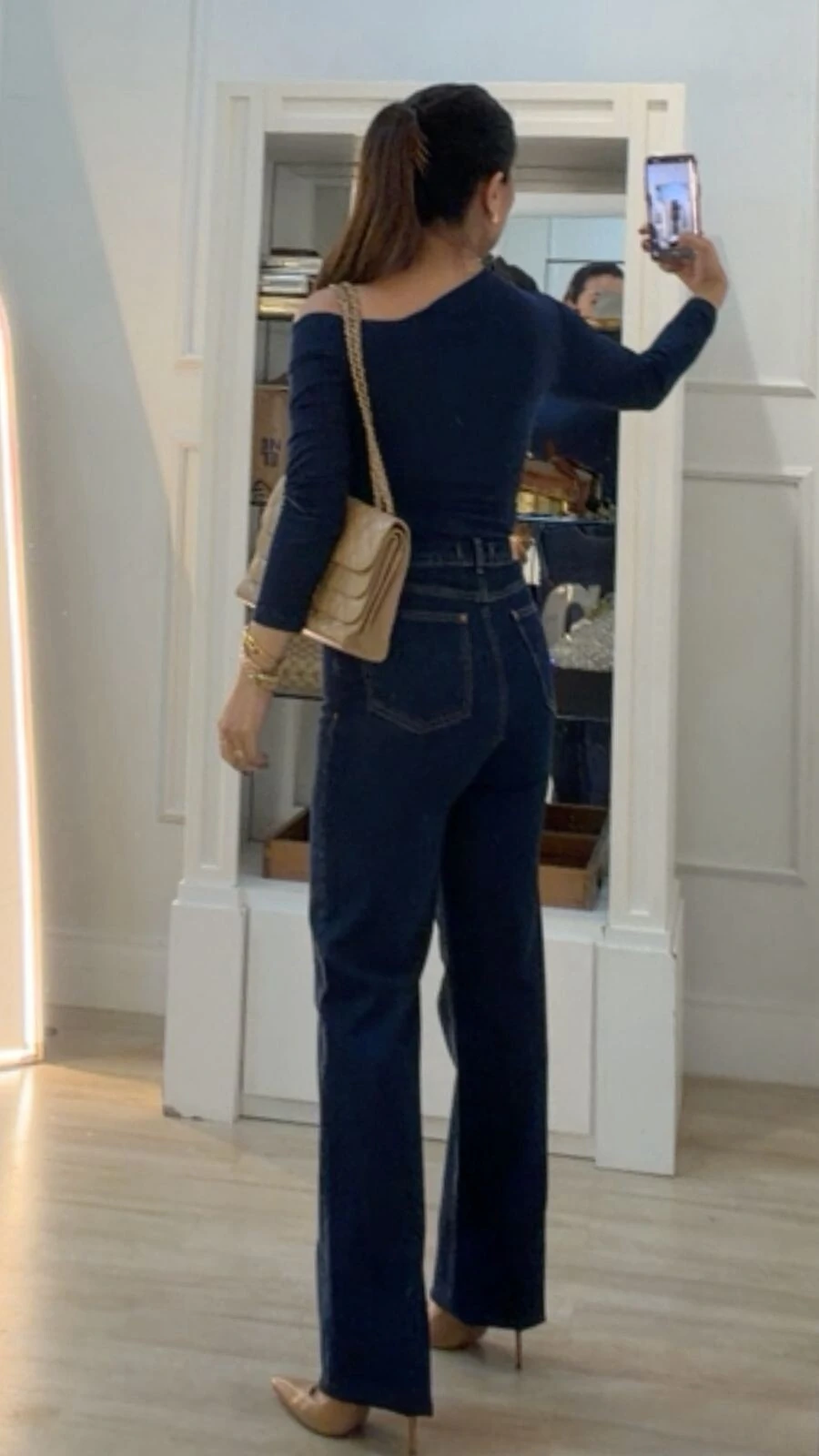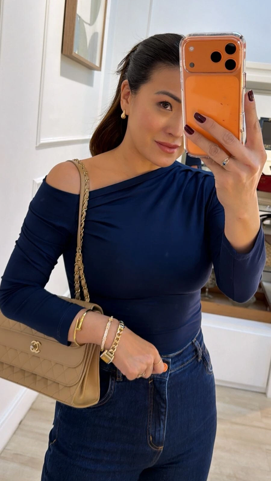 Blusa de malha. Possui decote assimétrico, mangas7/8, detalhe de pregas acima do busto e pesponto.