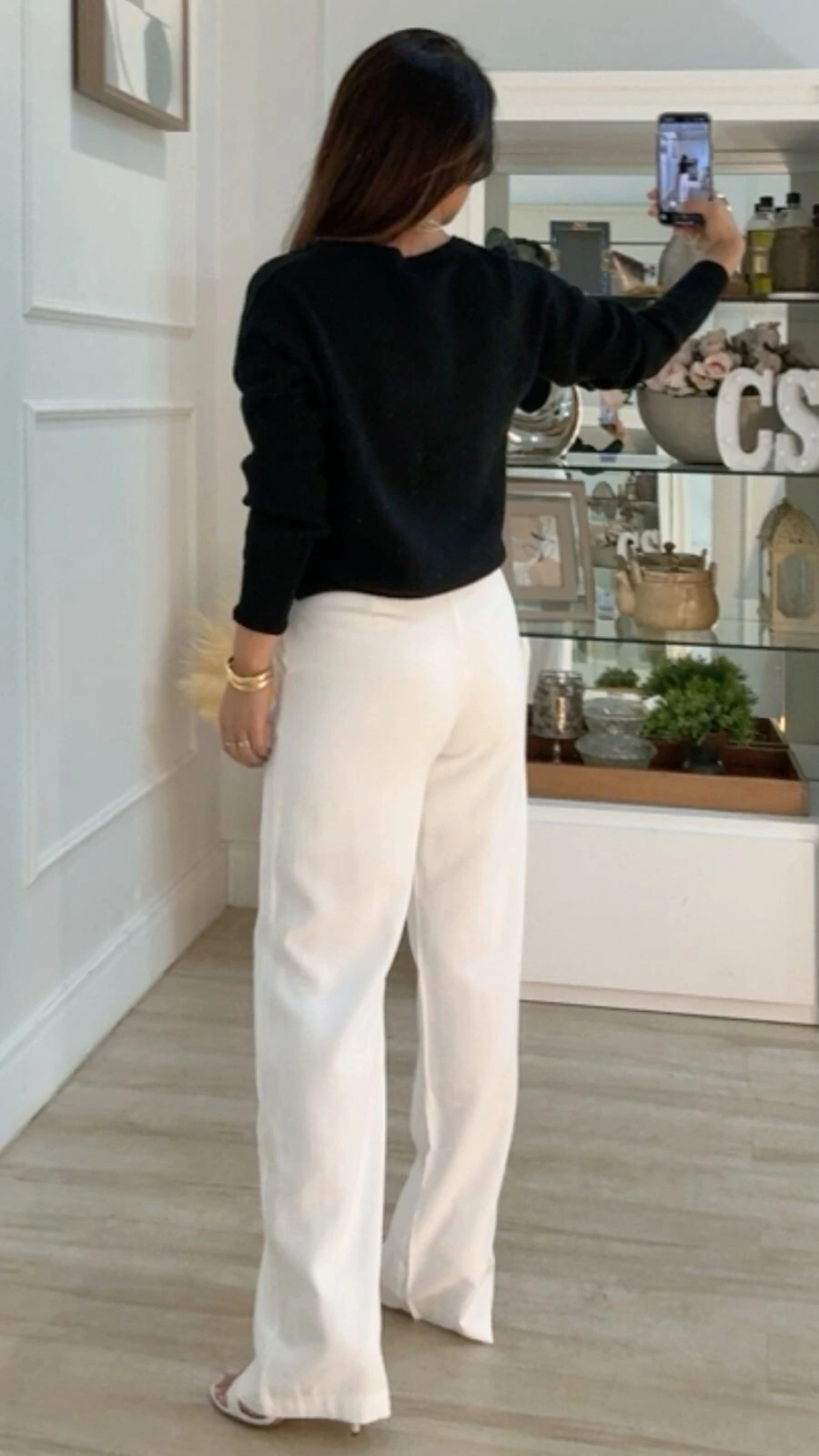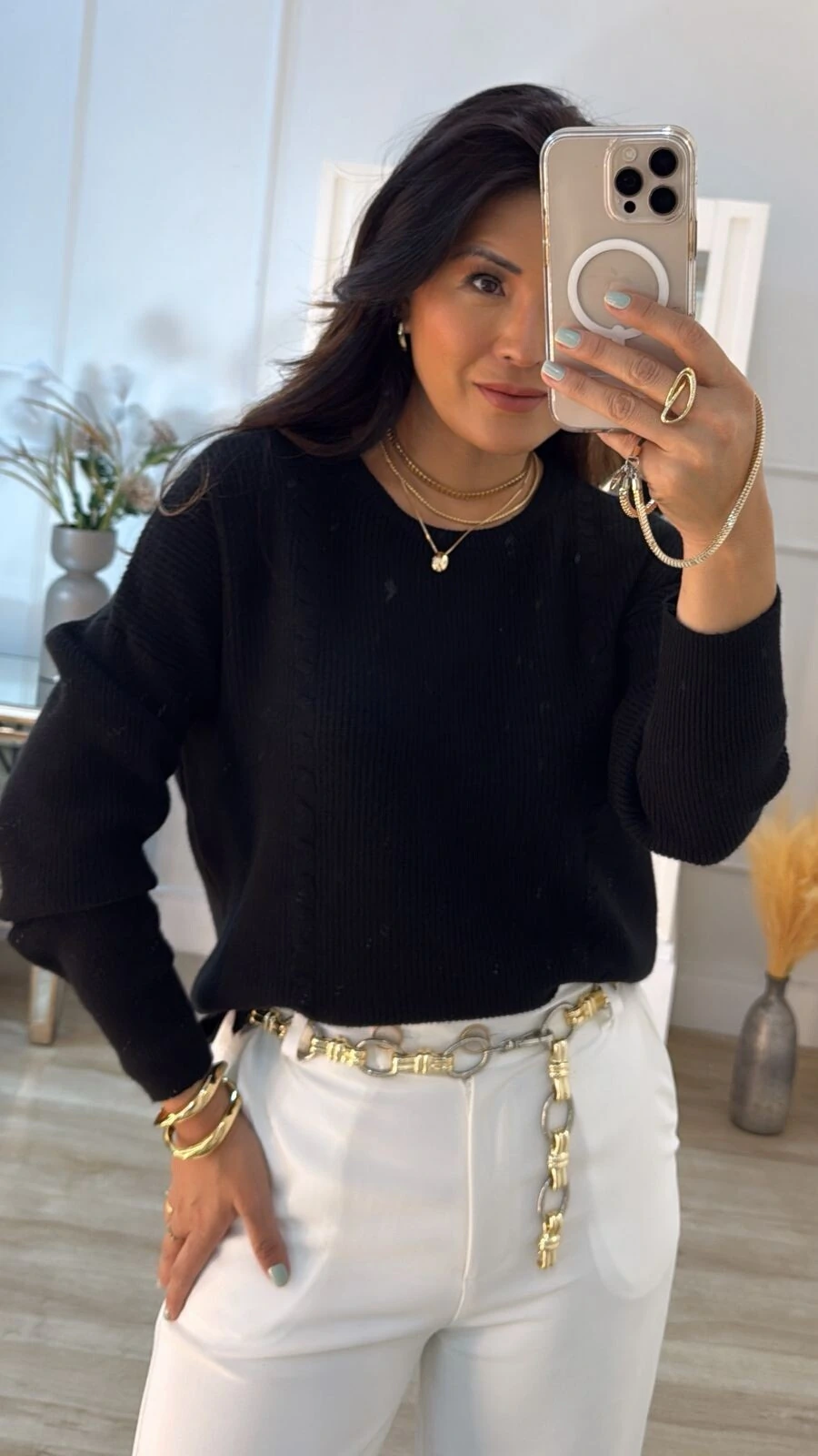 Blusa confeccionada em tricot canelada. Possui gola careca, mangas longas, fendas laterais, barrado posterior maior, trançados frontais, gola, punhos e barrado canelados.