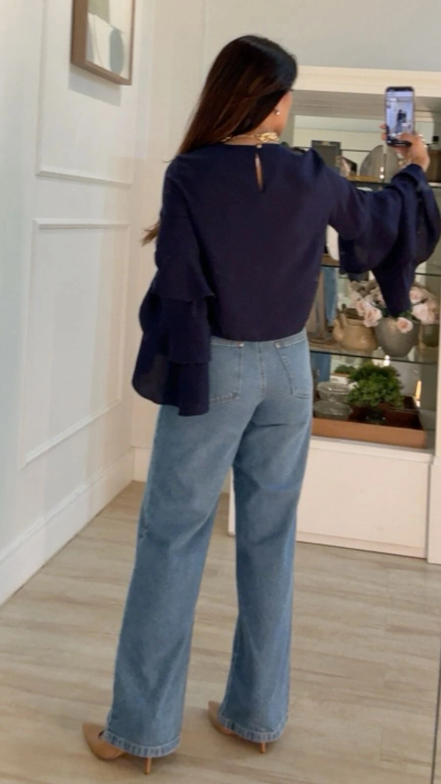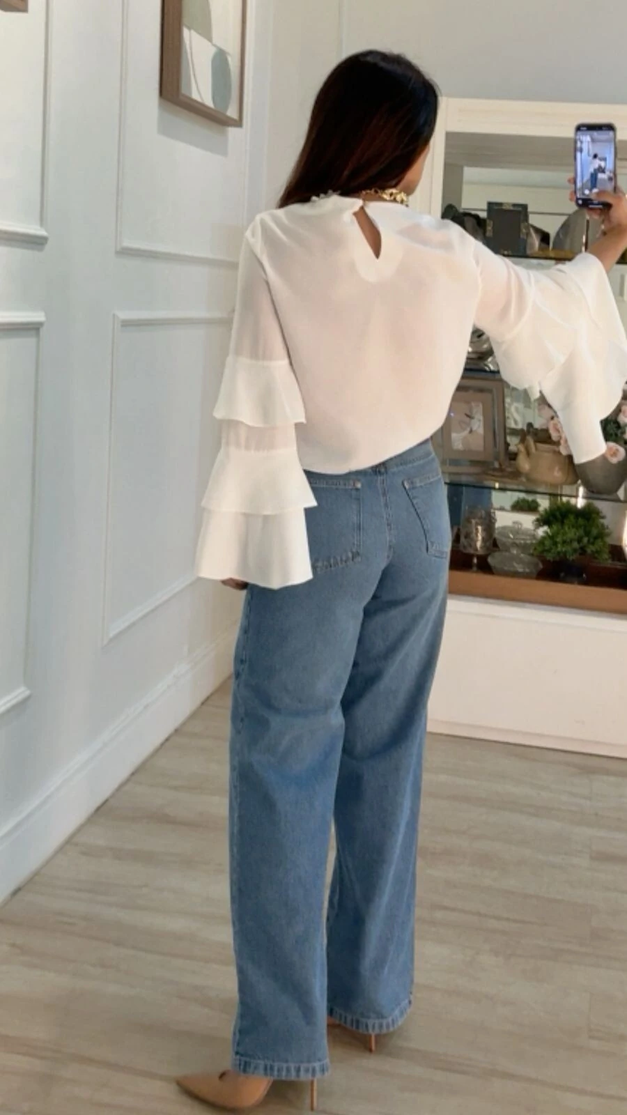 Blusa confeccionada em crepe. Possui gola careca, mangas longas evasê com babados triplos,, no posterior recorte em gota com botão dourado.