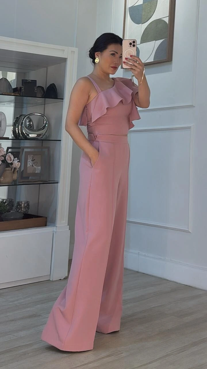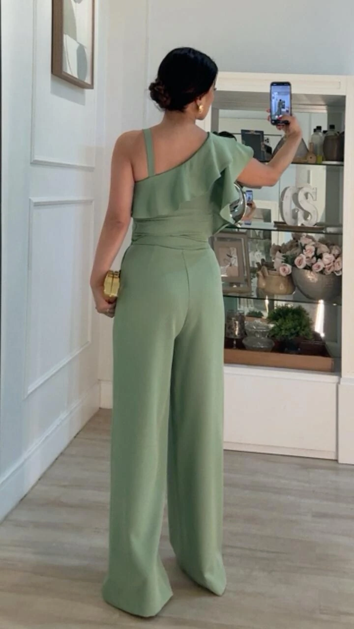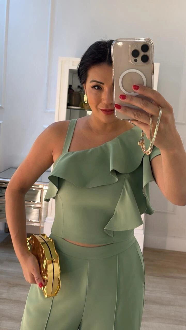 Conjunto blusa cropped e calça pantalona confeccionado em alfaiataria. Blusa cropped: possui ombro com alça fina e outro com manga curta com babado, decote assimétrico, forro e fechamento da peça por zíper lateral. Calça pantalona: possui na parte frontal bolsos faca e vivo, fechamento da peça por zíper lateral.