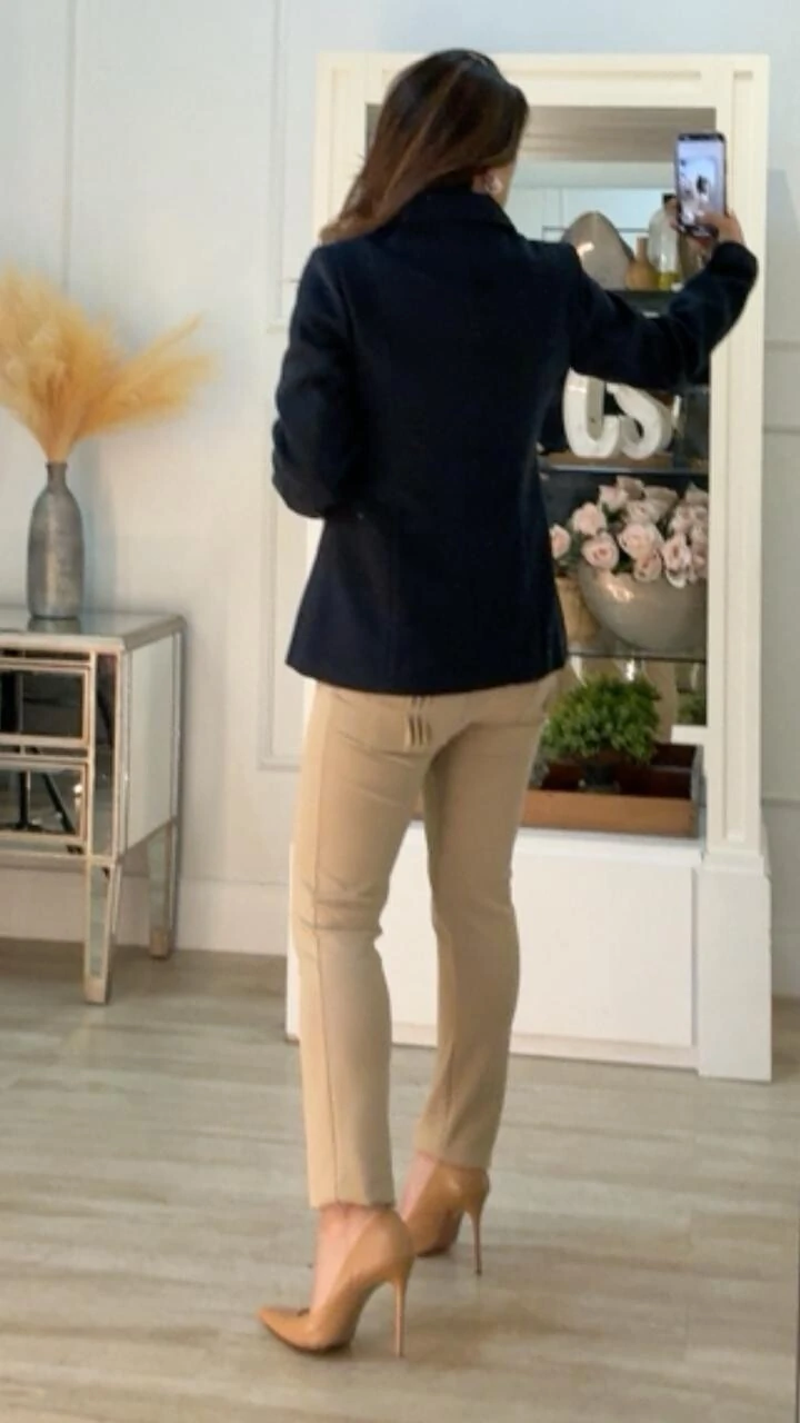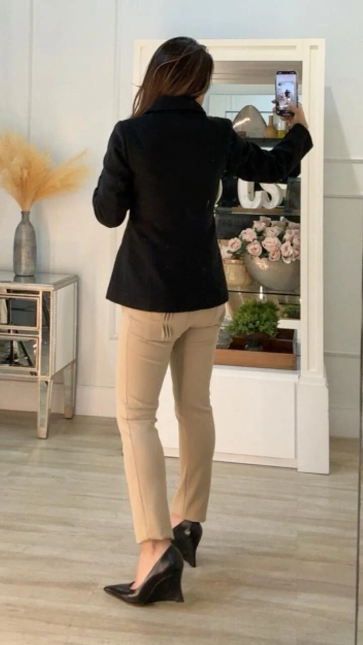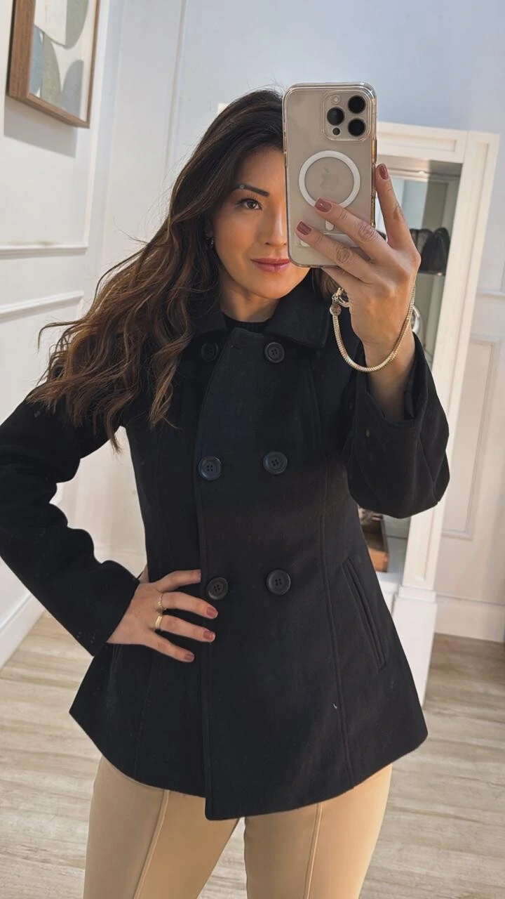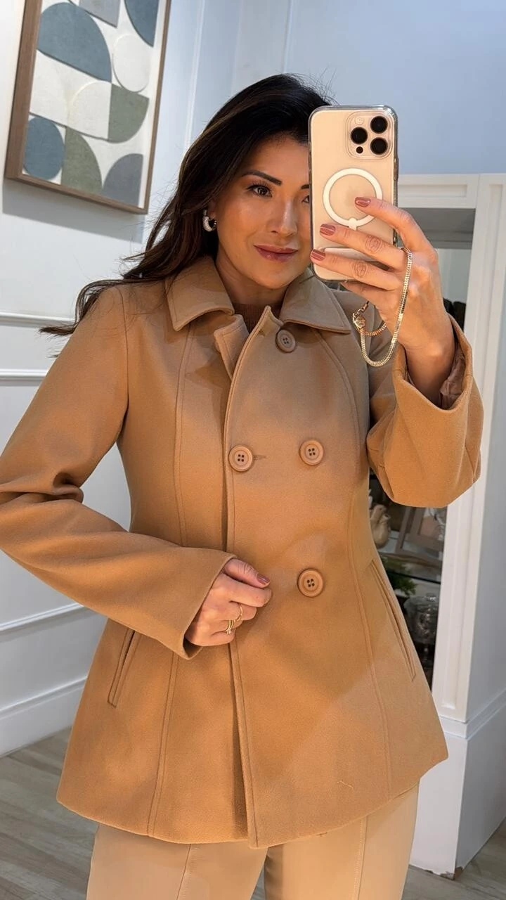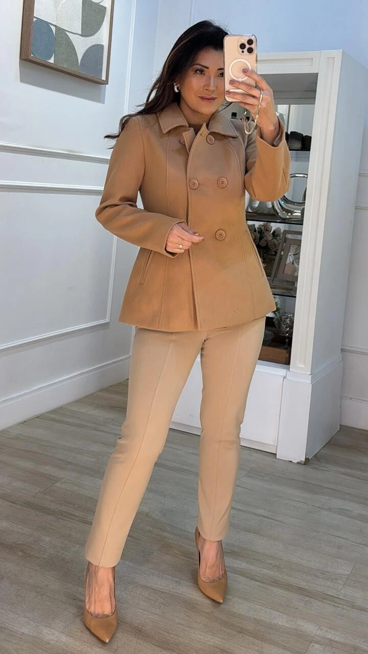 Casaco confeccionado em lã batida. Possui forro, mangas longas, gola, bolsos faca e fechamento da peça por botões duplos frontais.