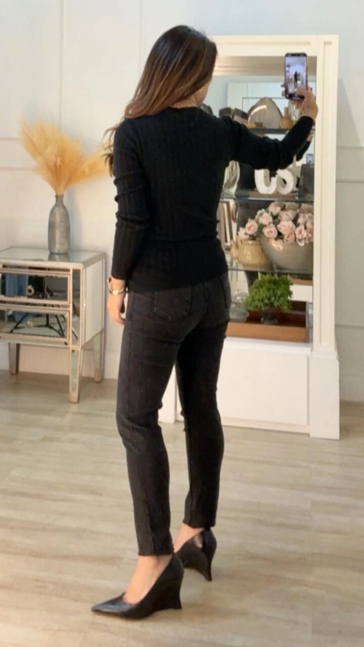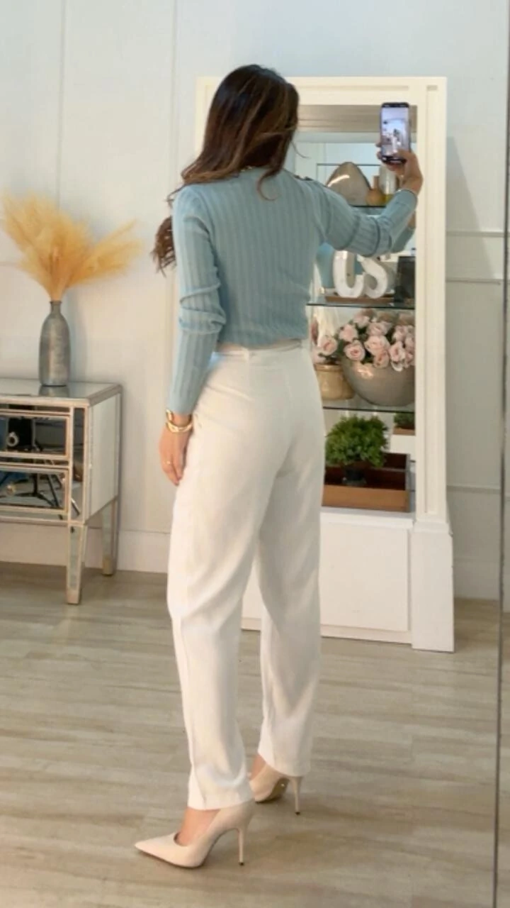 Blusa confeccionado em tricot com canelados largos. Possui gola careca, mangas longas, detalhes texturizados, canelado na gola, punhos e barrado.
