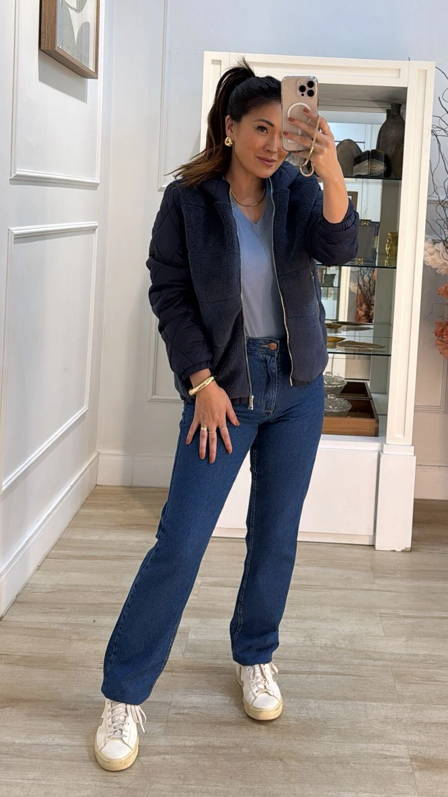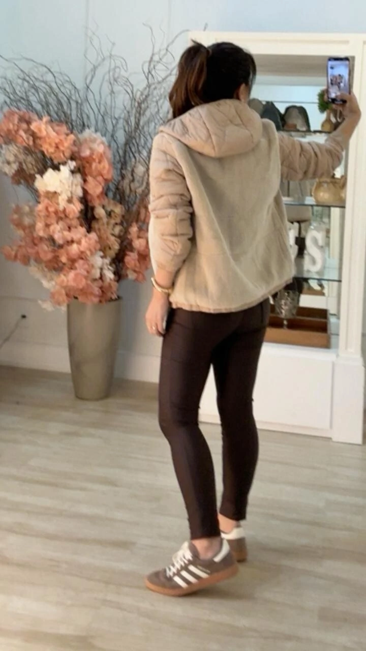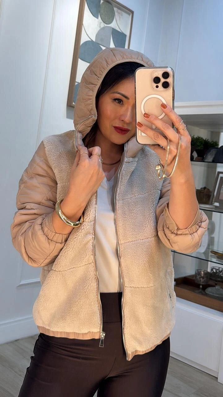 Jaqueta puffer nylon com teddy. Possui forro, capuz com elástico, mangas longas, pespontos em losangos, bolsos frontais, zíper para fechamento frontal da peça e nos bolsos.