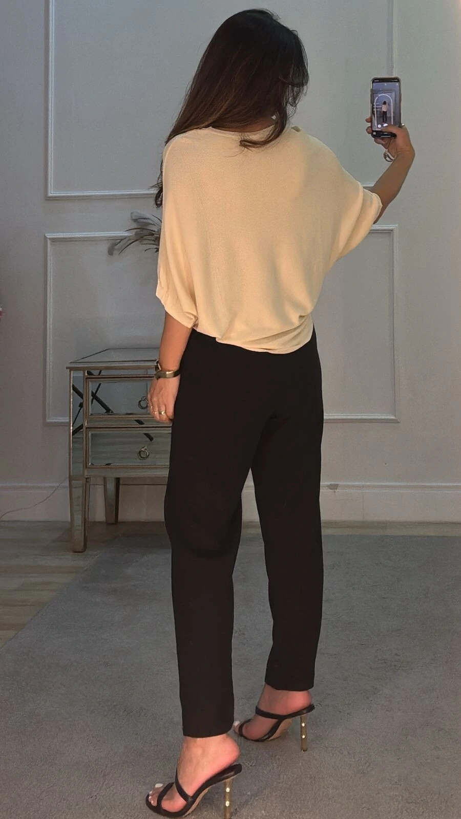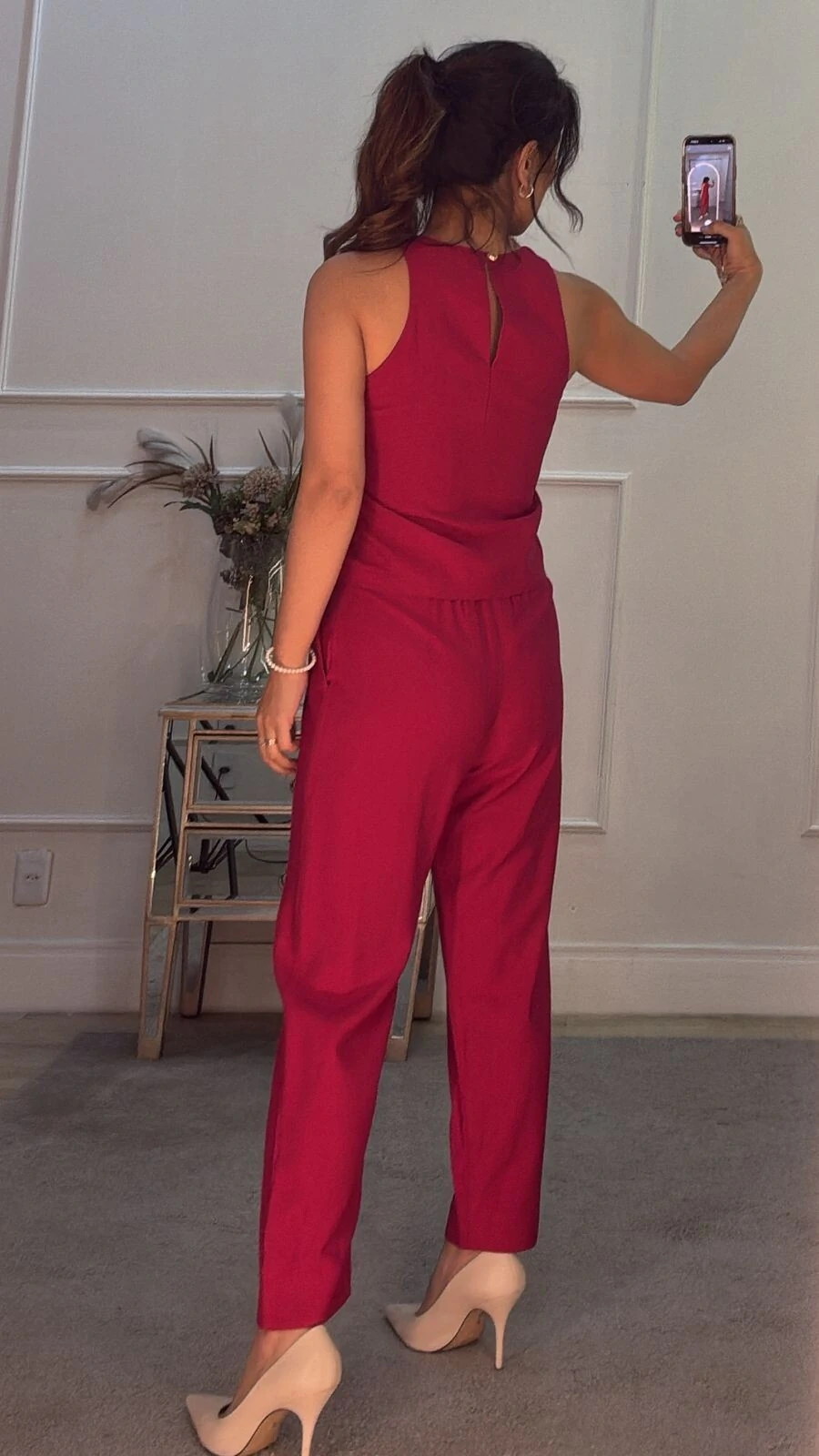 Calça confeccionada em viscose. Possui pala larga detalhe ondulado com elástico franzido posterior, bolsos frontais, pesponto, fechamento frontal da peça por botões forrados e zíper.