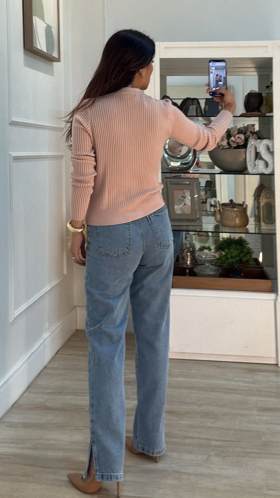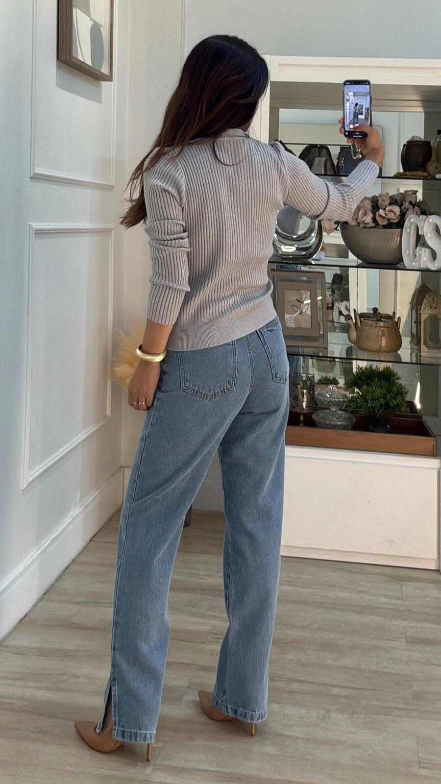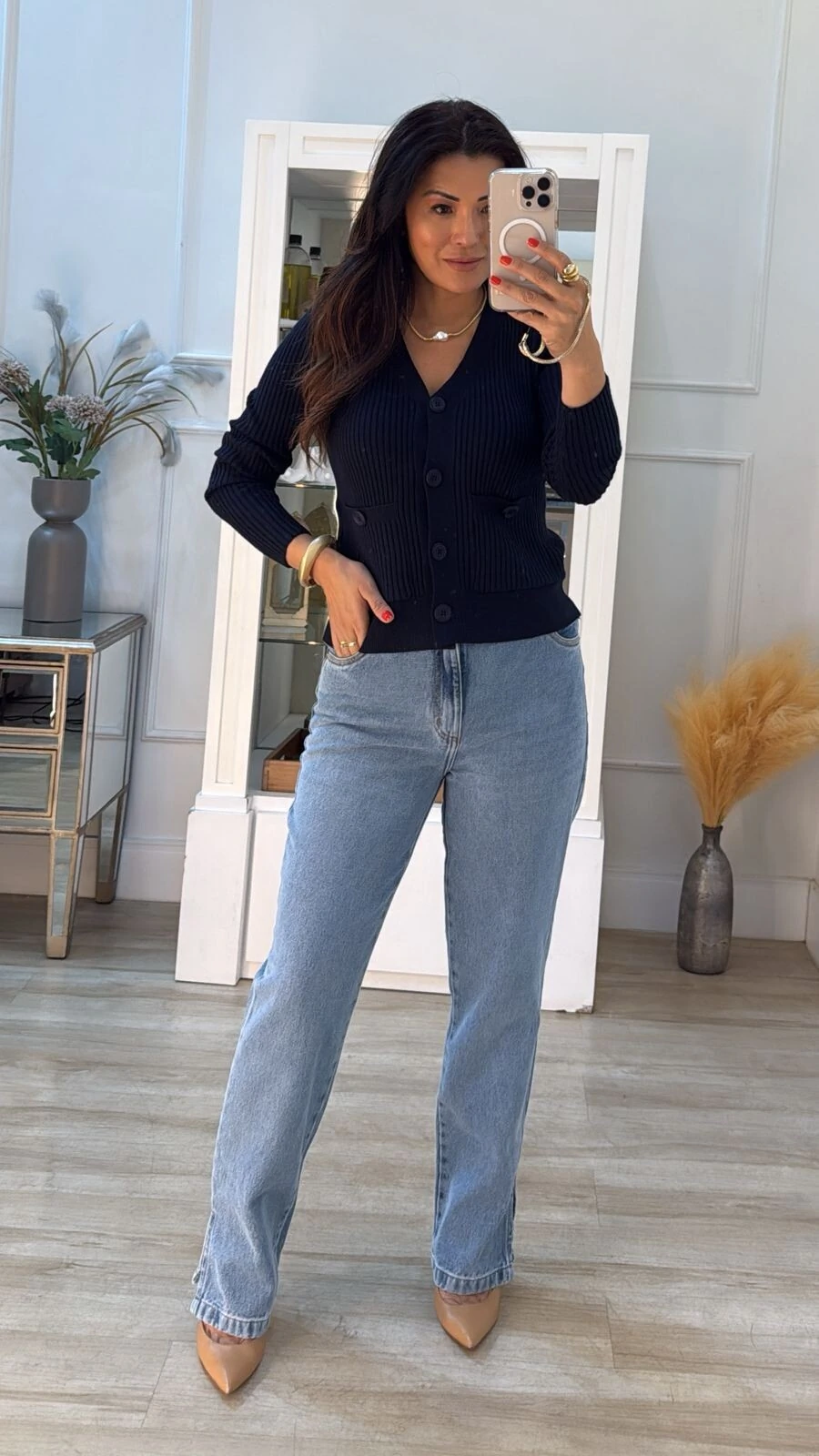 Cardigan curto confeccionado em tricot canelado. Possui mangas longas, decote V, bolsos quadrados, botões para fechamento frontal da peça.