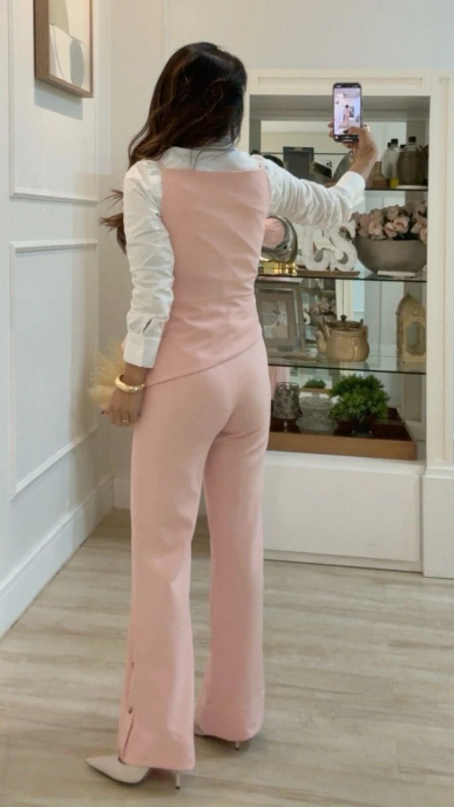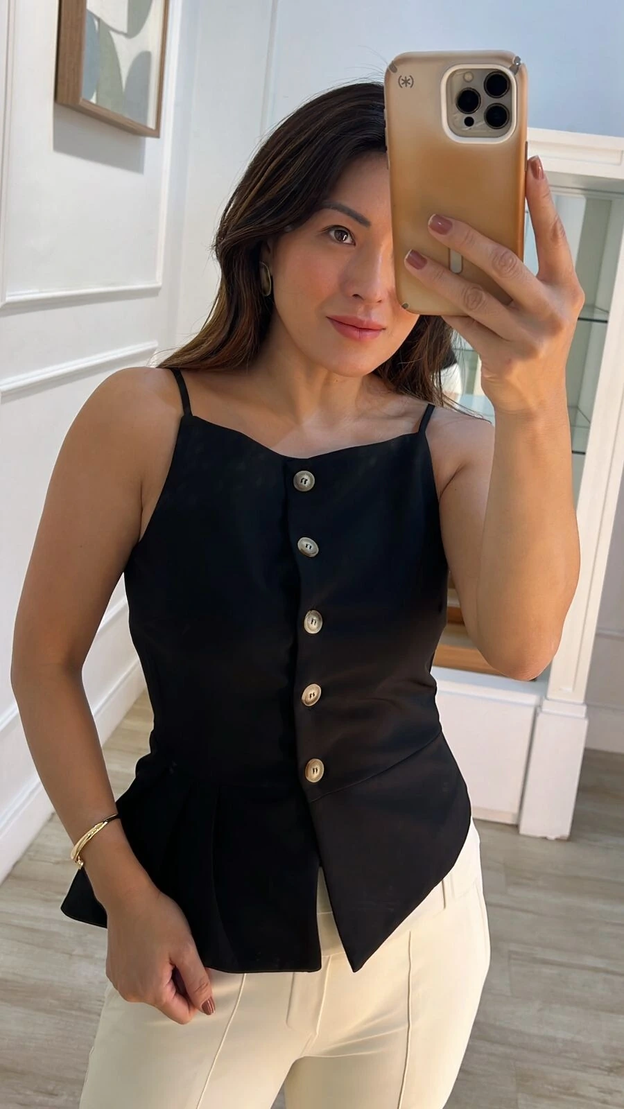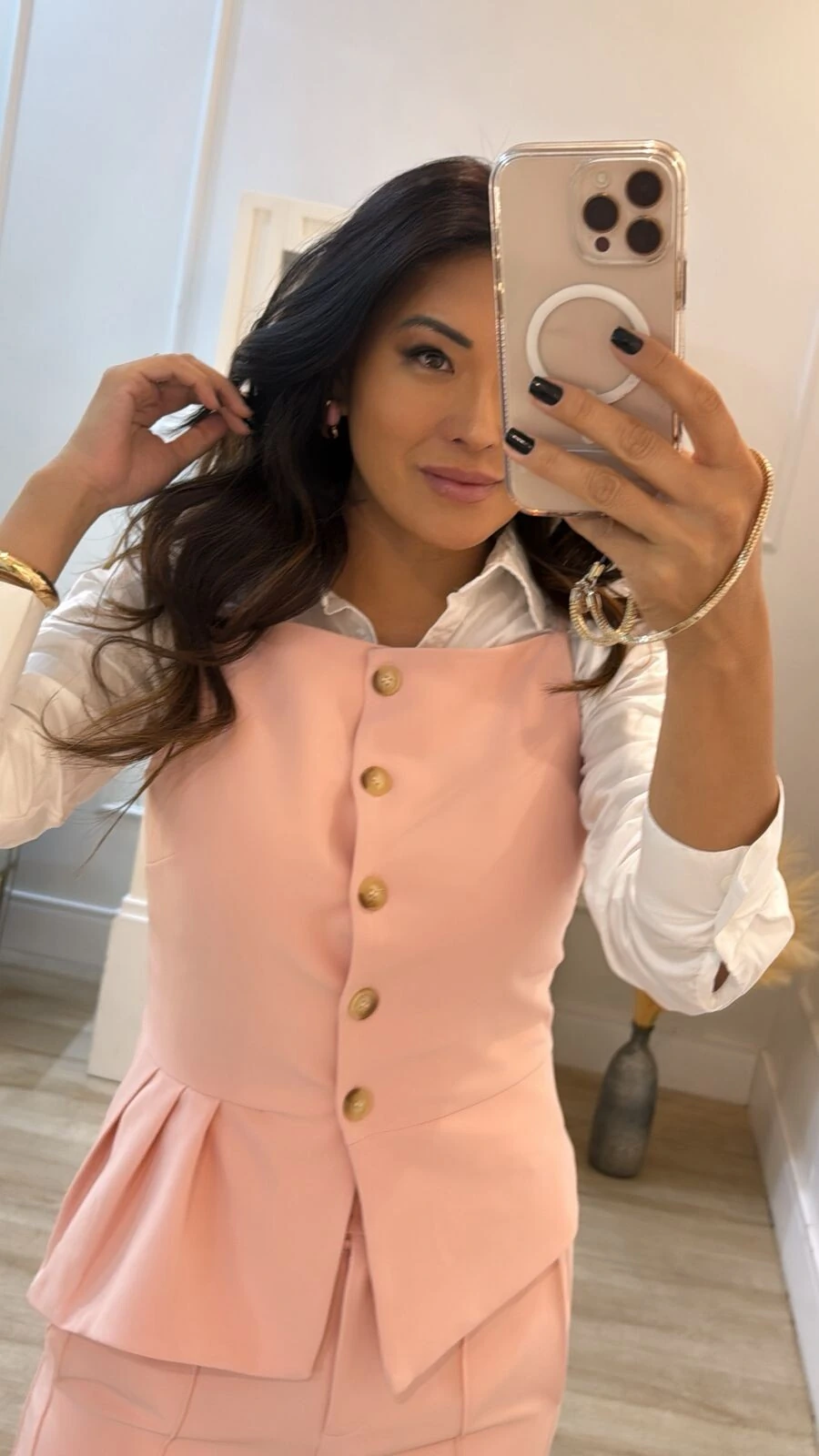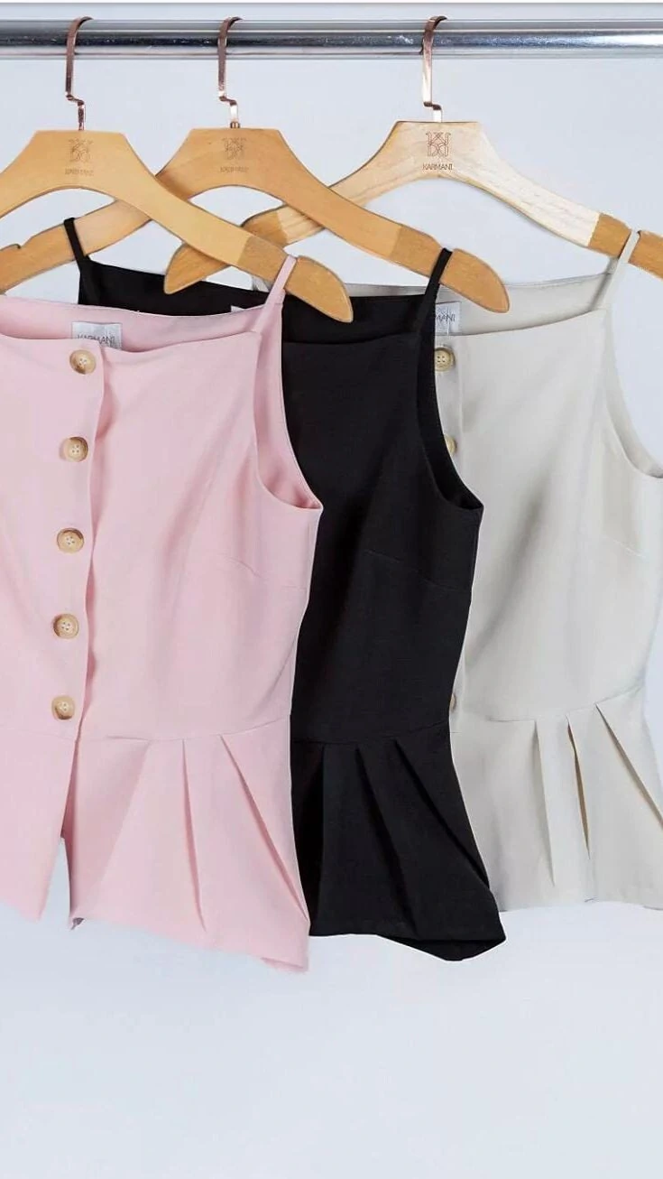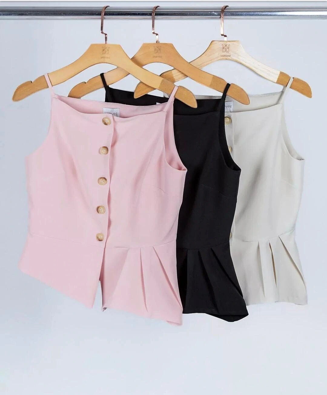 Colete confeccionado em alfaiataria. Possui forro, alças finas, decote reto, barrado assimétrico com pregas e fechamento da peça por botões frontais.