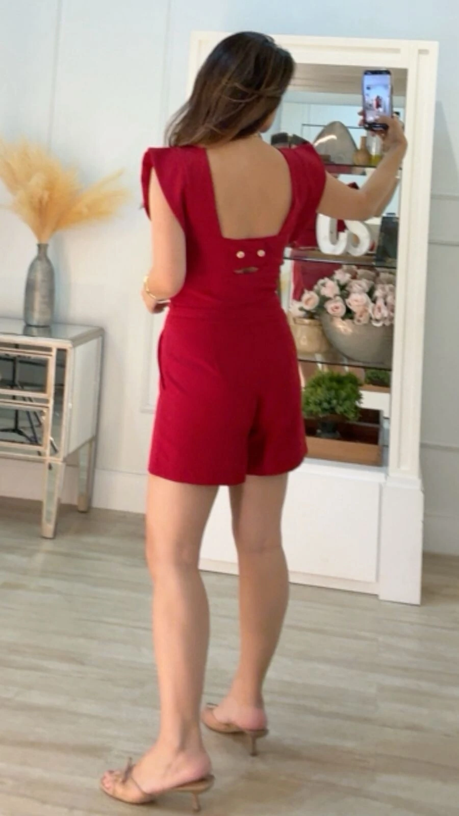 Cropped confeccionado em alfaiataria. Possui decote em u, alças largas, recorte vazado posterior com detalhe de botões duplos em espiral dourados, fechamento lateral da peça por zíper, e forro.