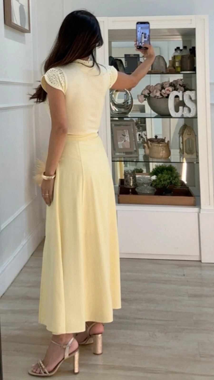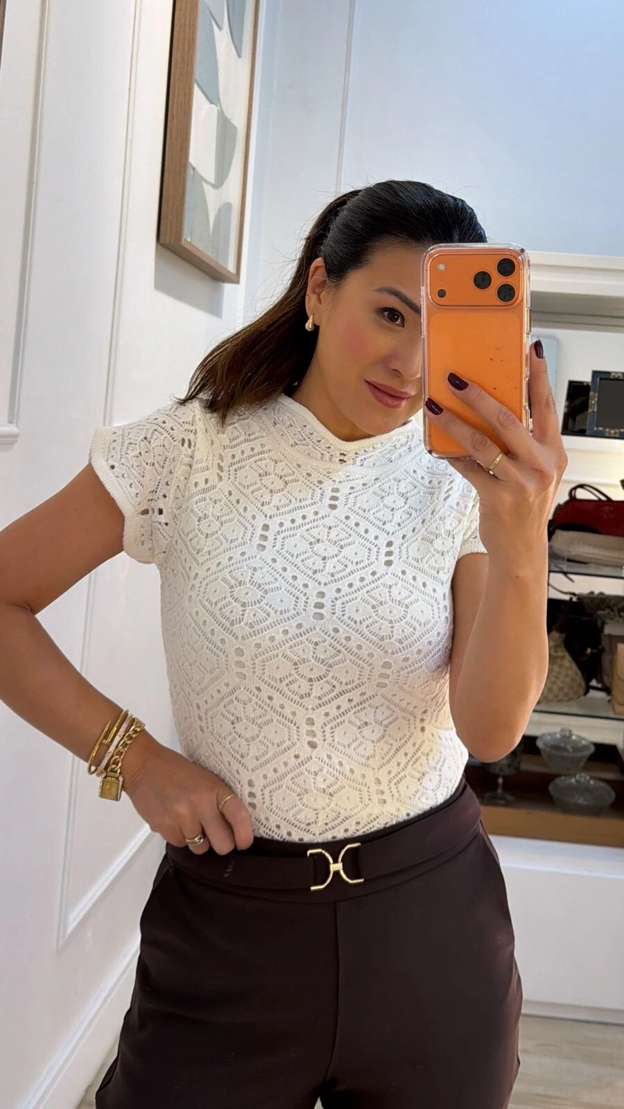 Blusa confeccionada em tricot. Possui gola alta, mangas curtas, detalhe de nervura em losango frontal e entremeios, punhos e barrado canelados, forro frontal.