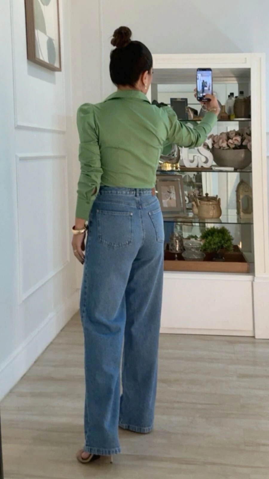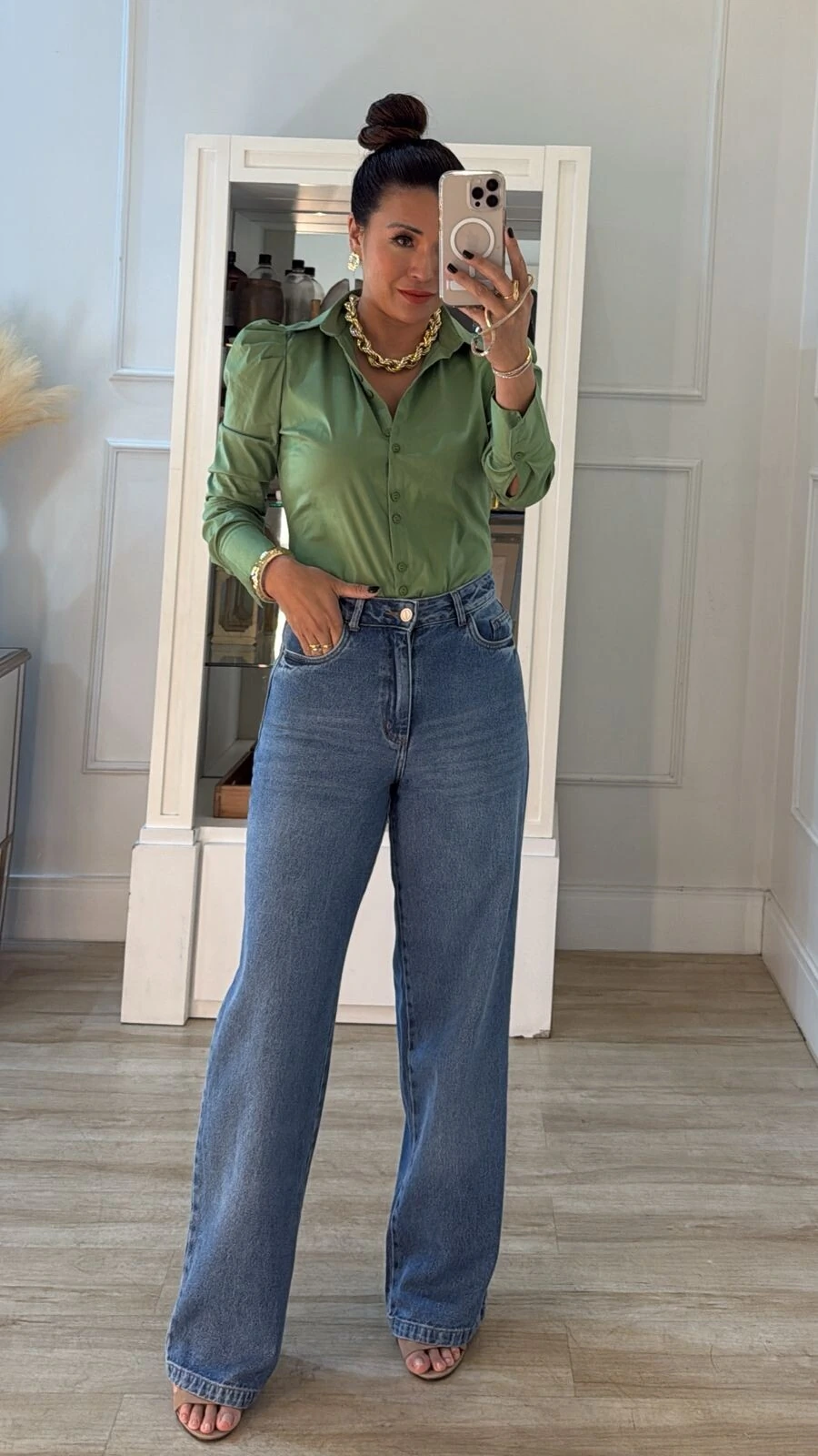 Camisa tricoline. Possui gola, mangas longas princesa, punhos largos, pesponto, fechamento pela parte frontal da peça e dos punhos por botões.