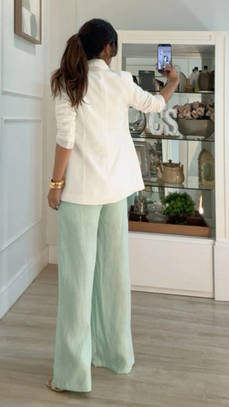 Blazer confeccionado em viscose. Possui gola, decote v, ombreiras, mangas longas, bolsos fake frontal com lapela, fechamento frontal da peça por botão, e forro.