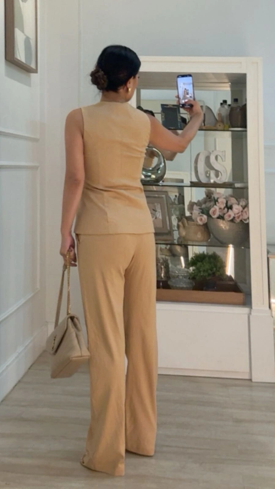Calça pantalona confeccionado em viscose com linho. Possui pala larga com passantes, bolsos e pregas frontais, bolsos posteriores fake, pesponto, fechamento frontal da peça por gancho e zíper, forro e cinto corda detalhe trançado.