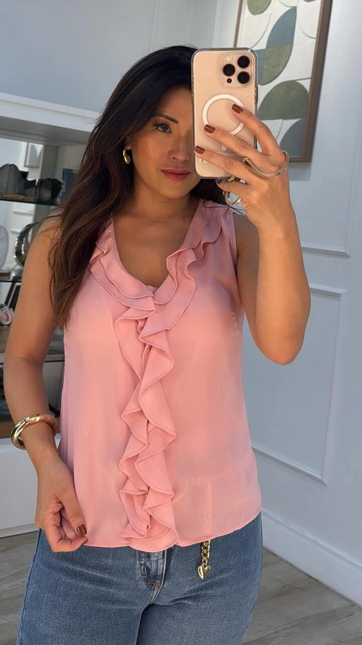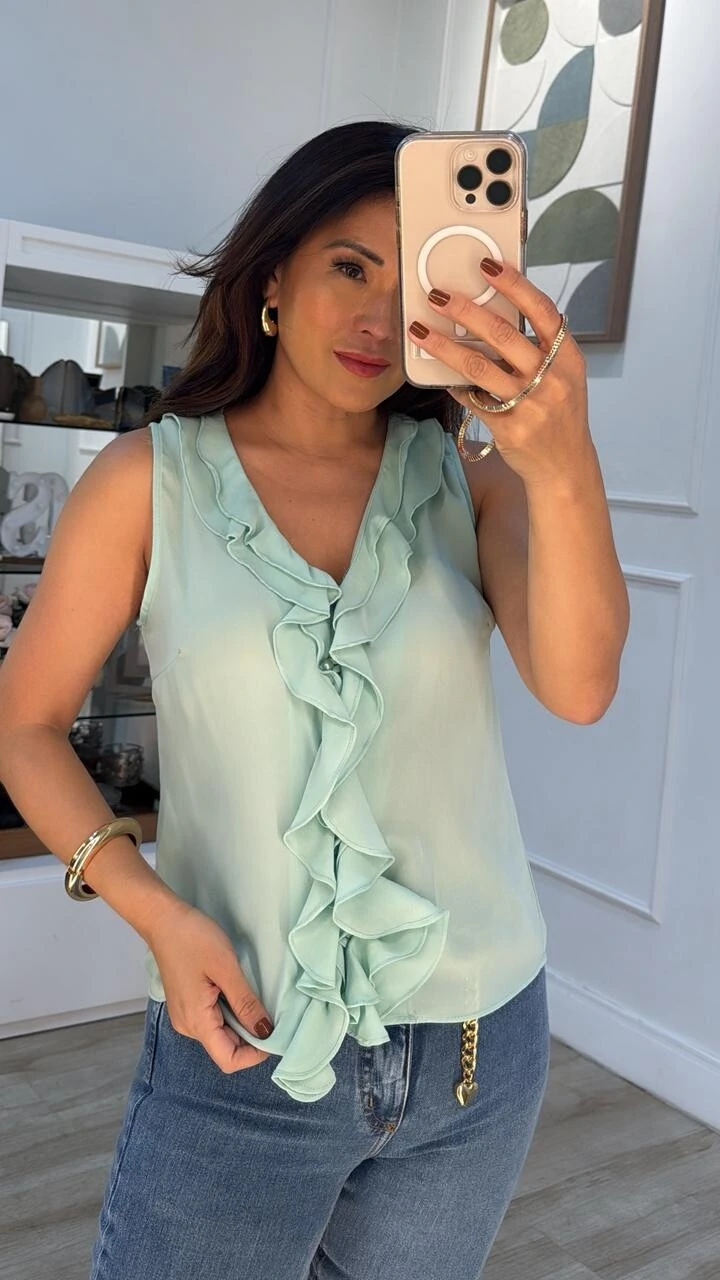 Blusa regata confeccionada em crepe. Possui decote v, alças largas, detalhe de babado duplo, pesponto, fechamento frontal da peça por botões.