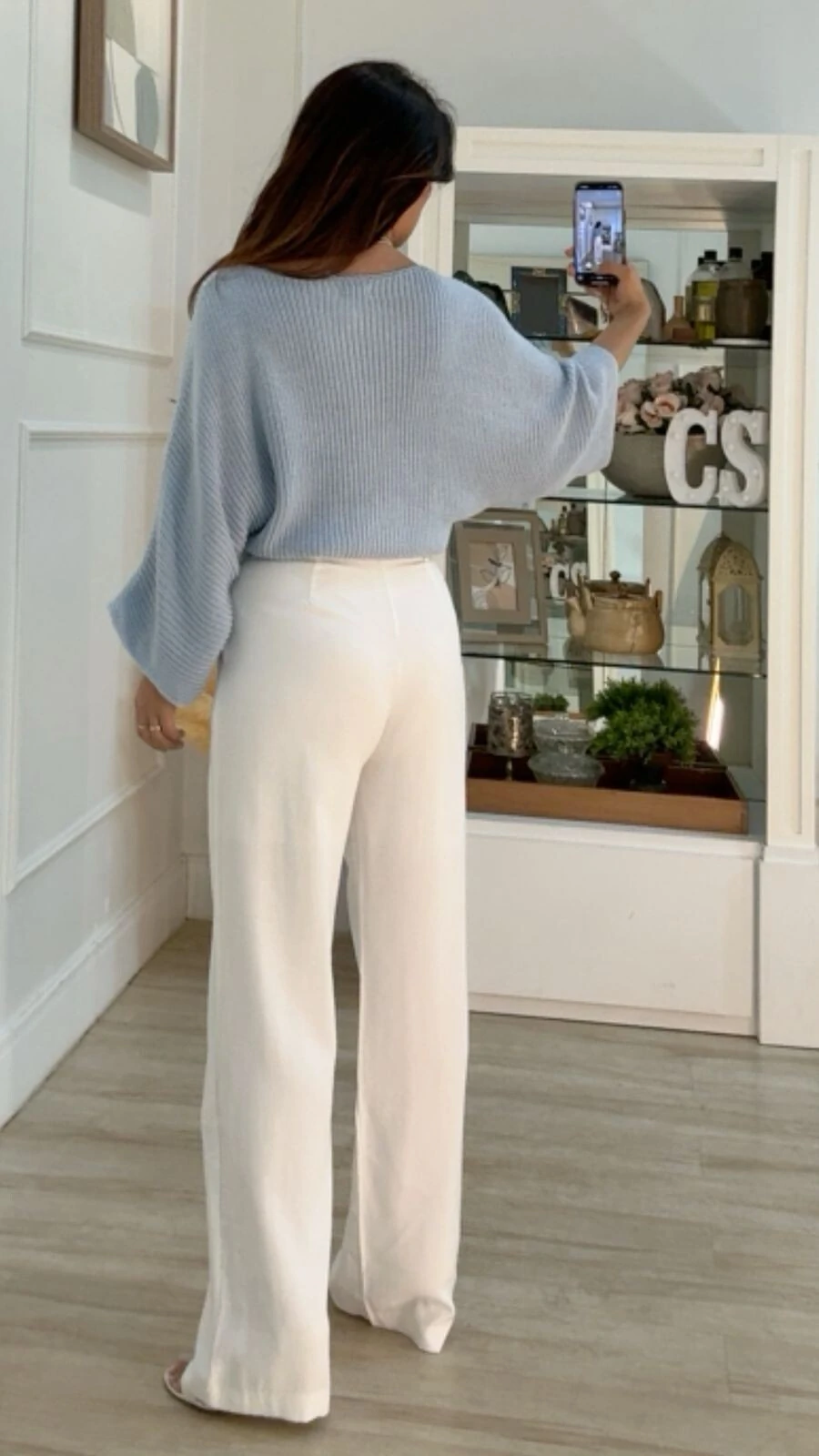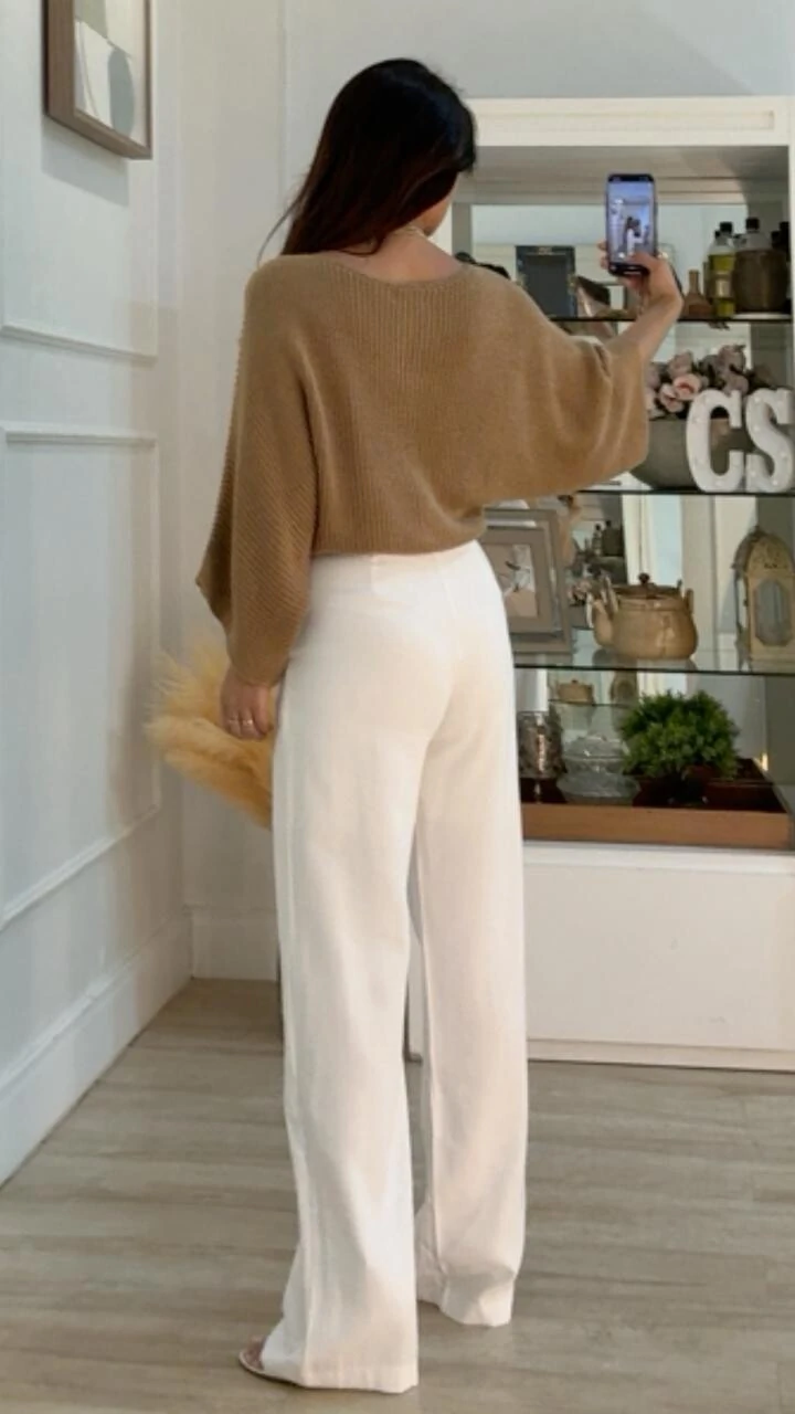 Blusa cropped confeccionada em tricot. Possui gola canoa e mangas amplas 7/8 . Modelagem ampla.