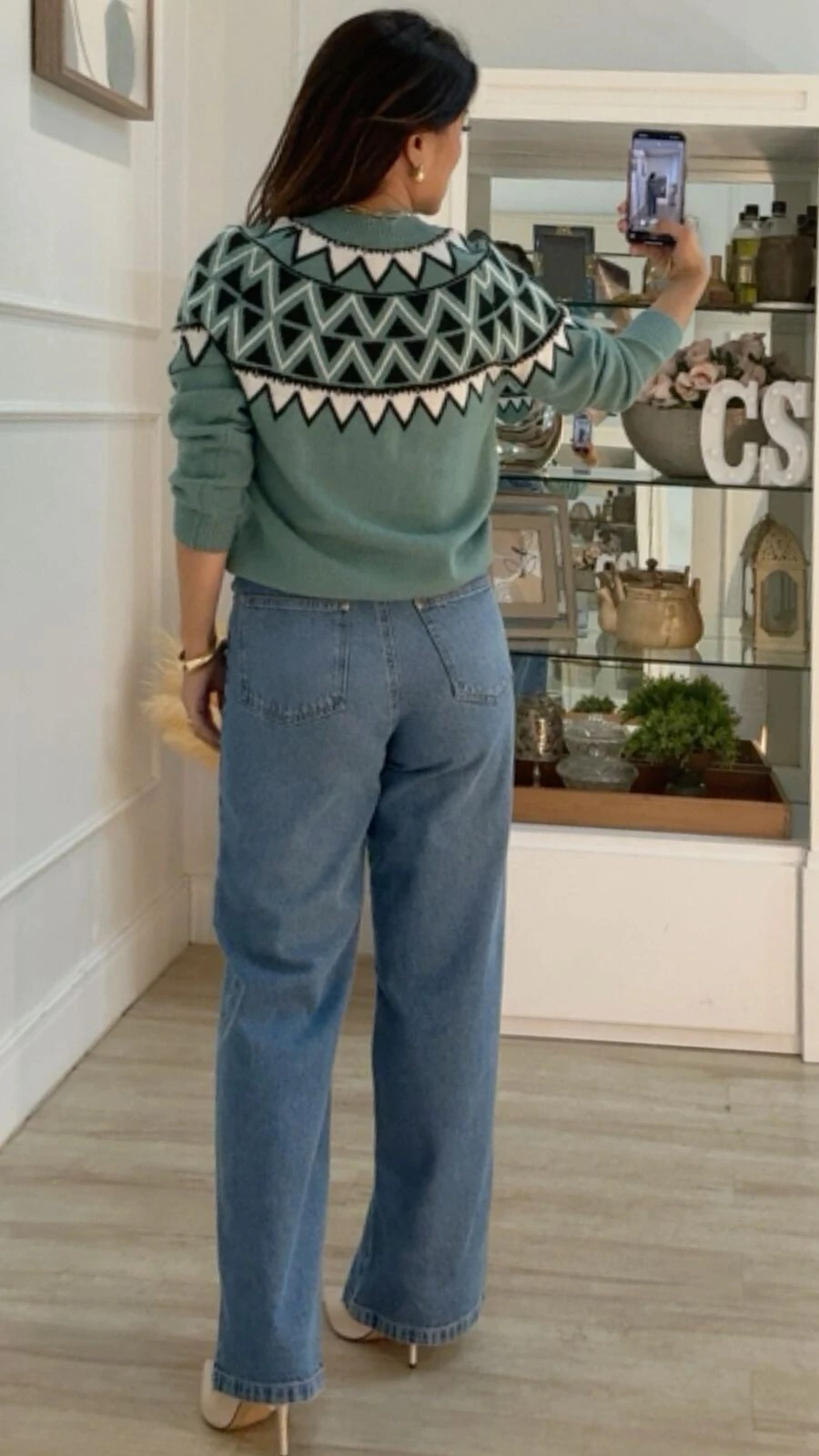 Blusa estampada confeccionada em tricot. Possui gola careca, mangas longas e detalhe canelado na gola, punhos e barrado