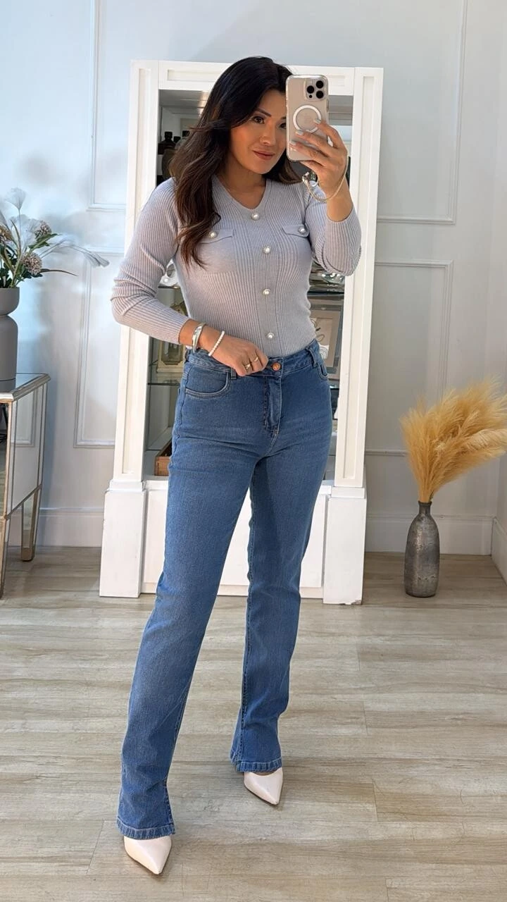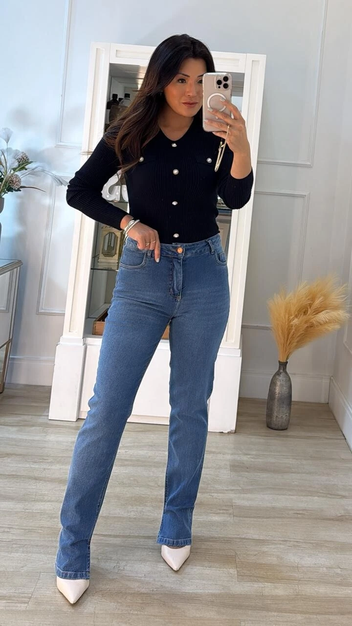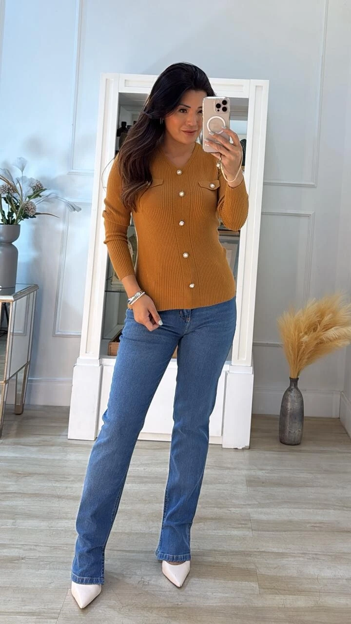 Suéter confeccionado em tricot canelado. Possui decote com leve V, mangas longas, bolsos fake frontais e botões (não funcionais) em flor com pérola.
