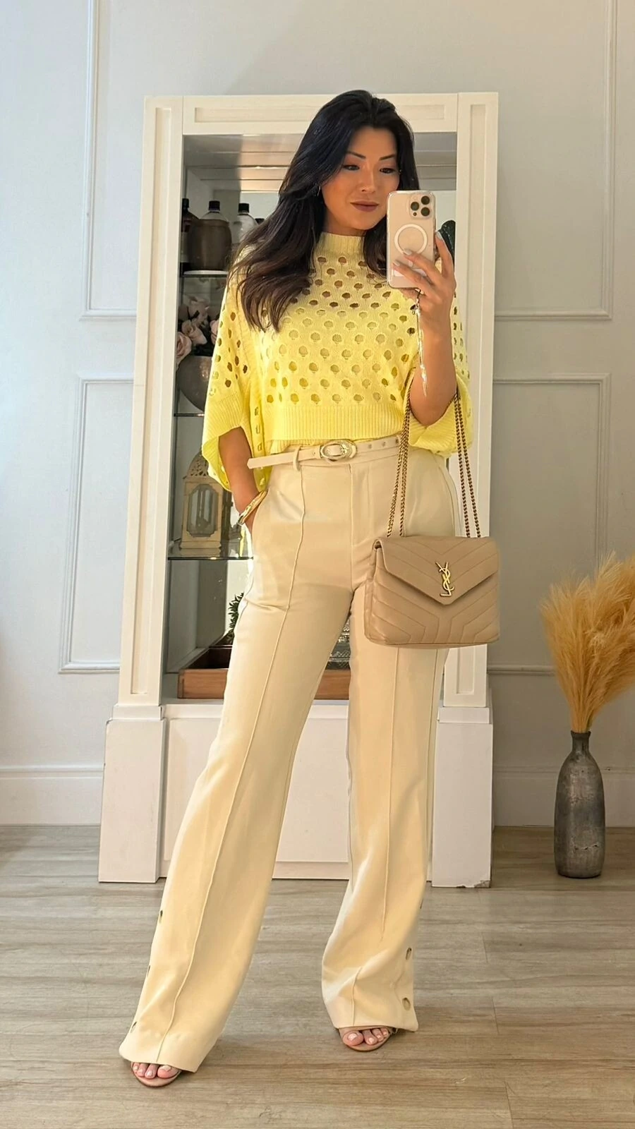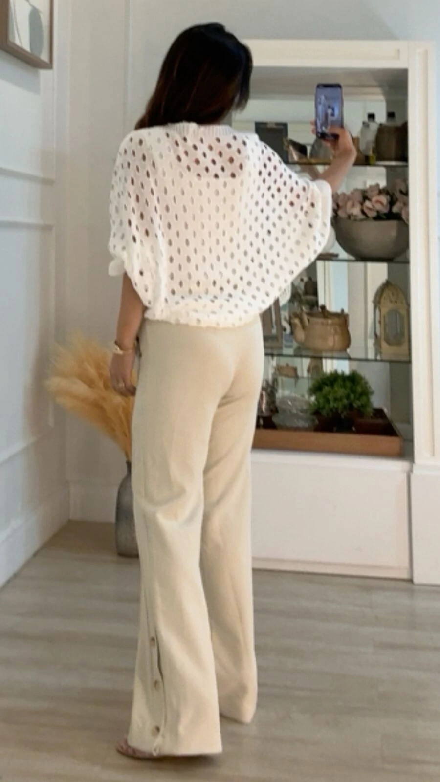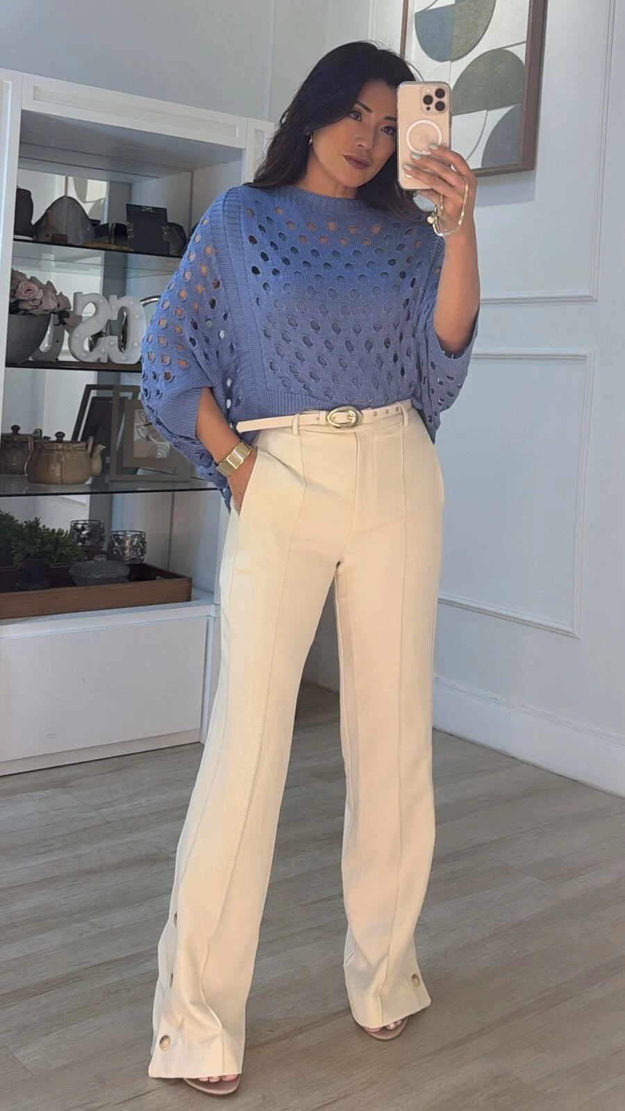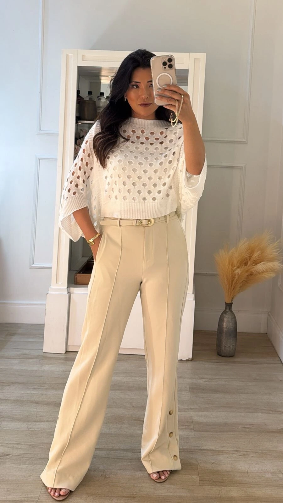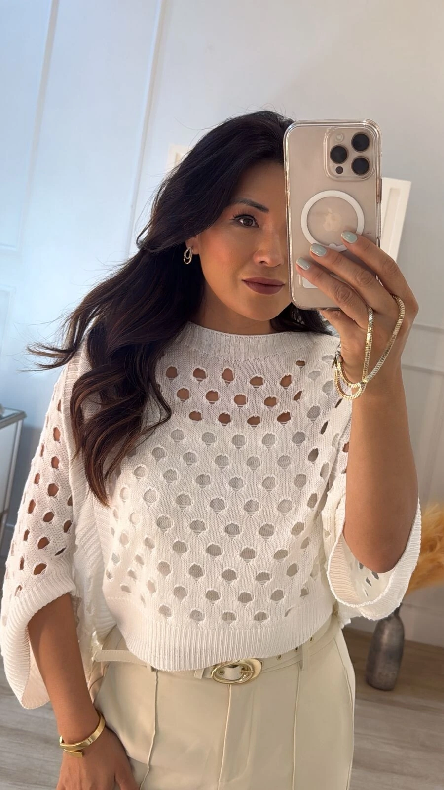 Poncho curto confeccionado em tricot com entremeios. Possui gola canoa, mangas 7/8, e posterior alongado. Regata fixa com alças alças largas e decote quadrado.