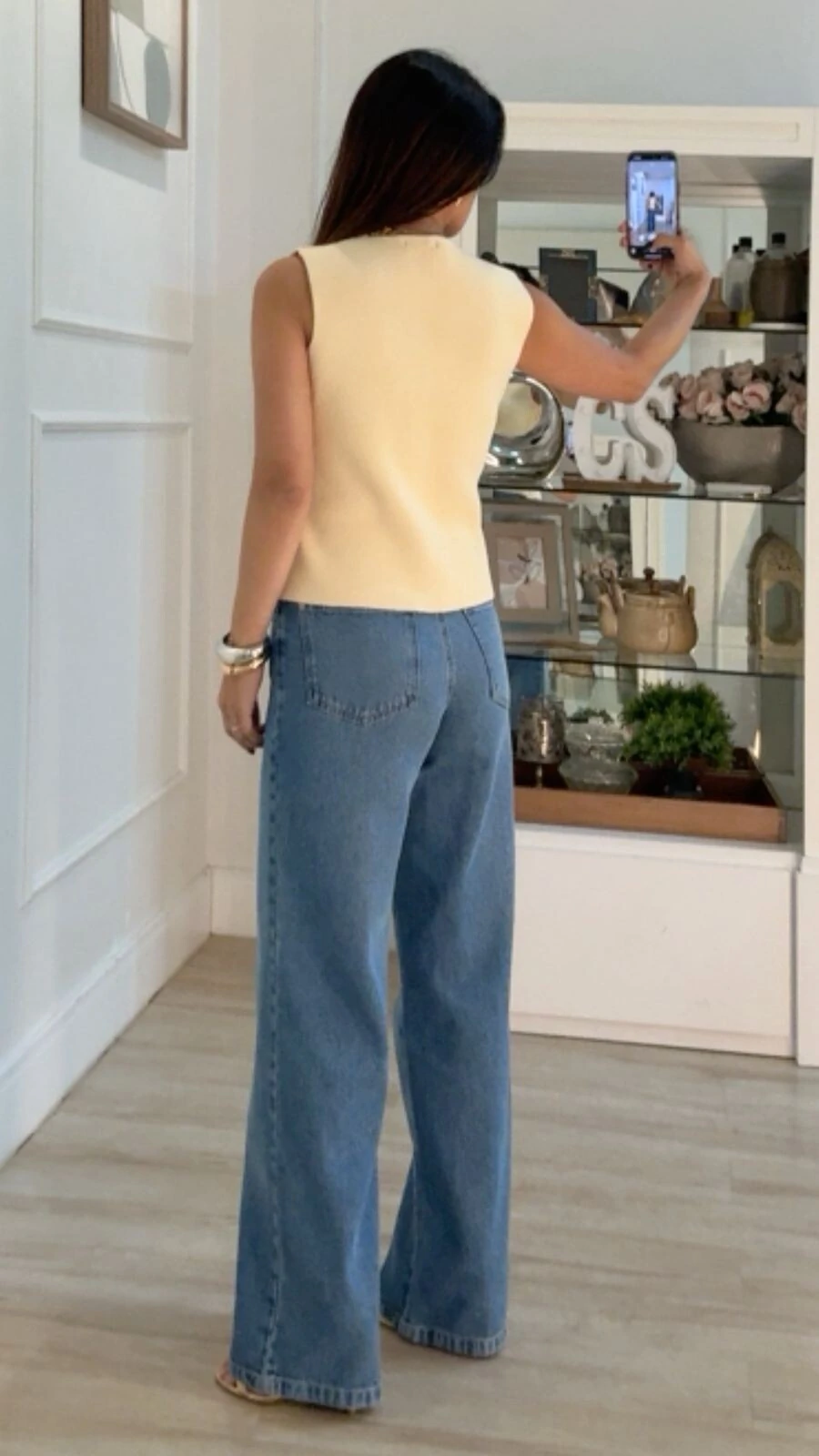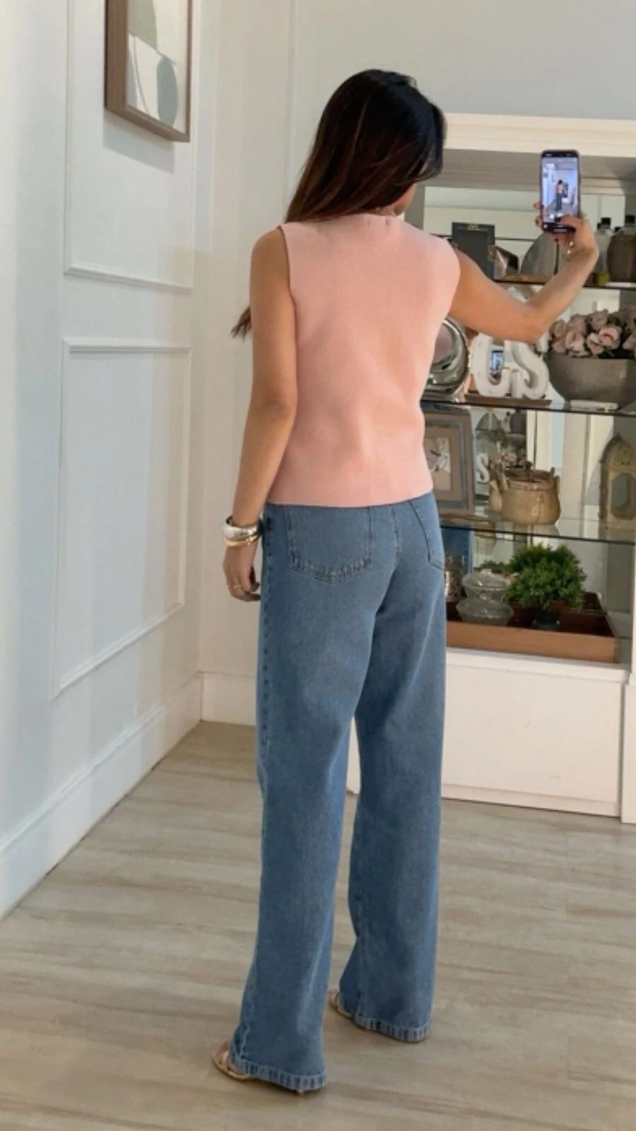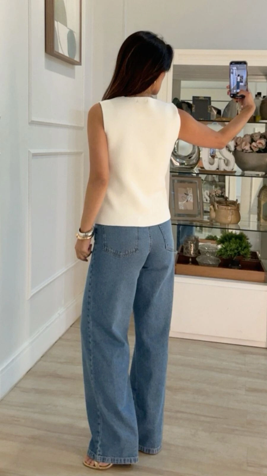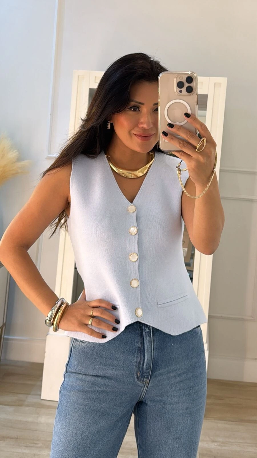 Colete confeccionado em tricot. Possui alças largas, decote V, bolsos fake frontais, e fechamento da peça por botões resinados com detalhe dourado.