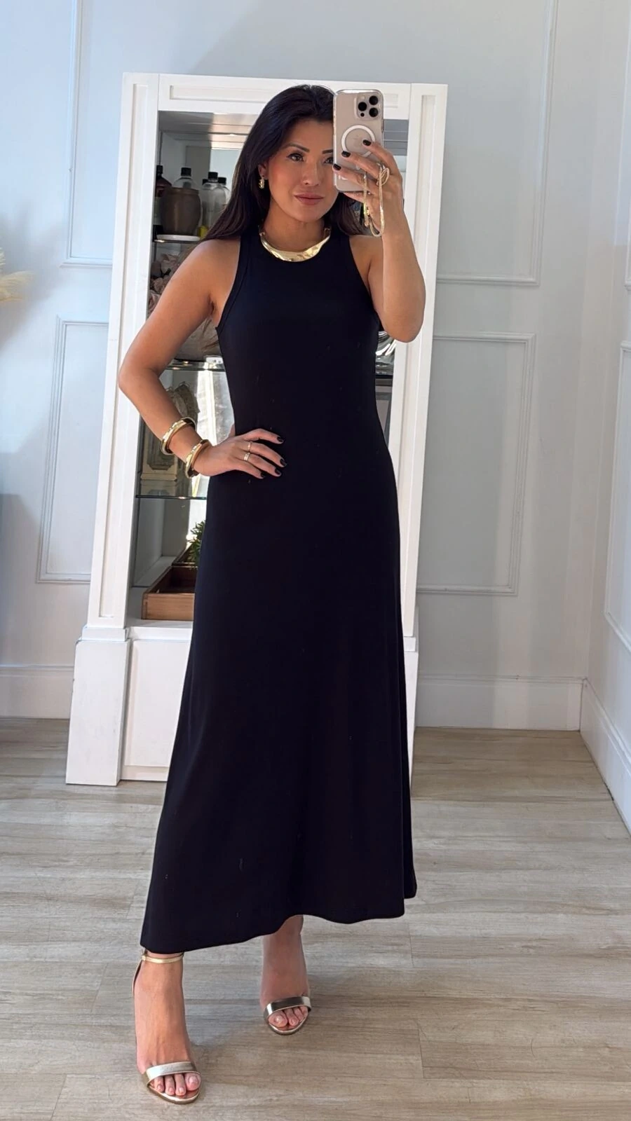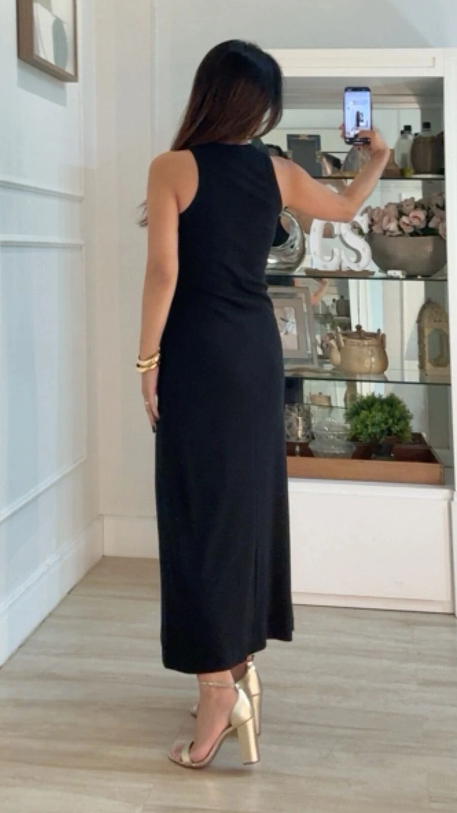 Vestido midi cavado confeccionado em malha canelada. Possui gola careca, alças largas, pesponto, detalhe faixa larga drapeada.