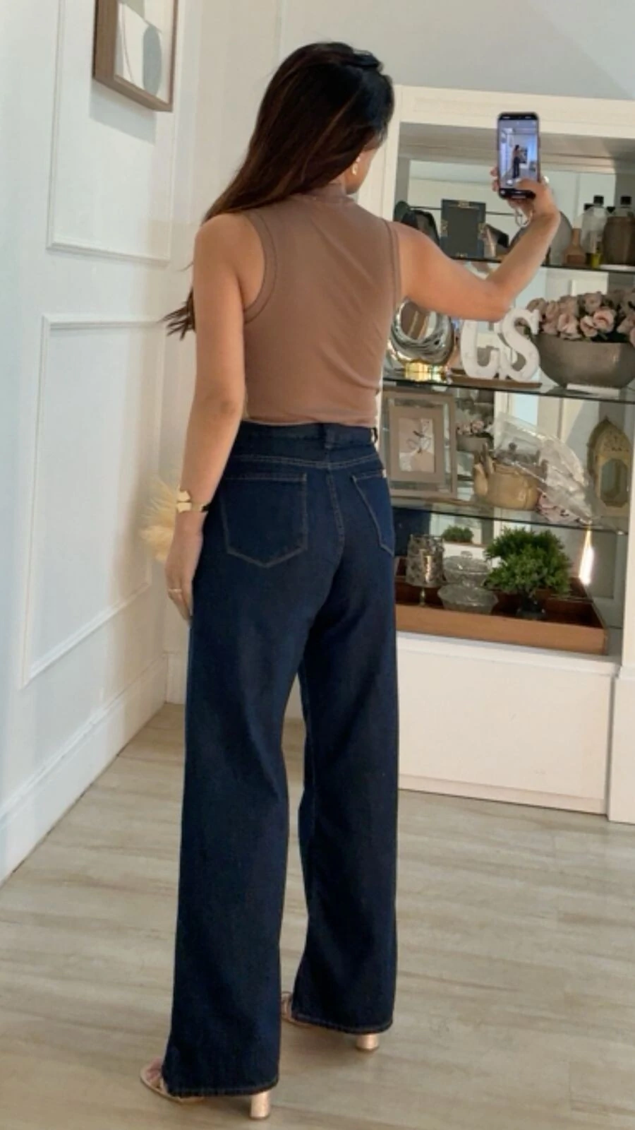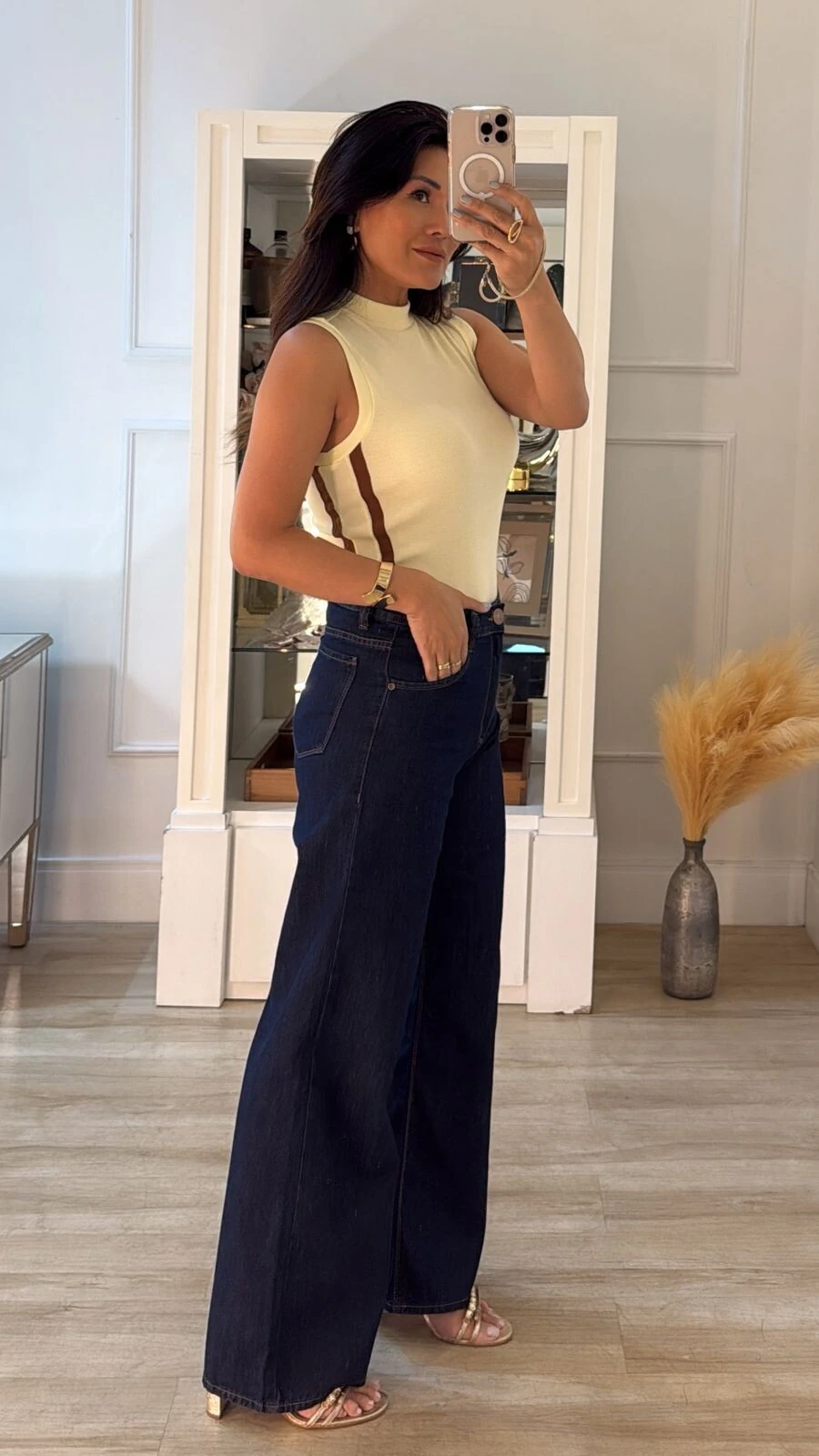 Blusa regata confeccionada em malha canelada. Possui gola alta, alças largas cavadas, dupla faixa lateral e pesponto.
