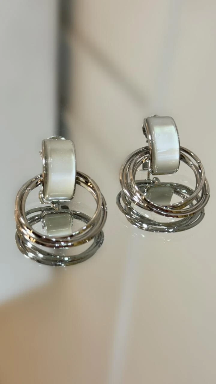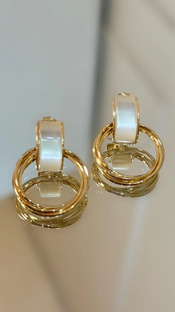 Brinco grande detalhe resinado e argolas múltiplas fecho por tarraxa.