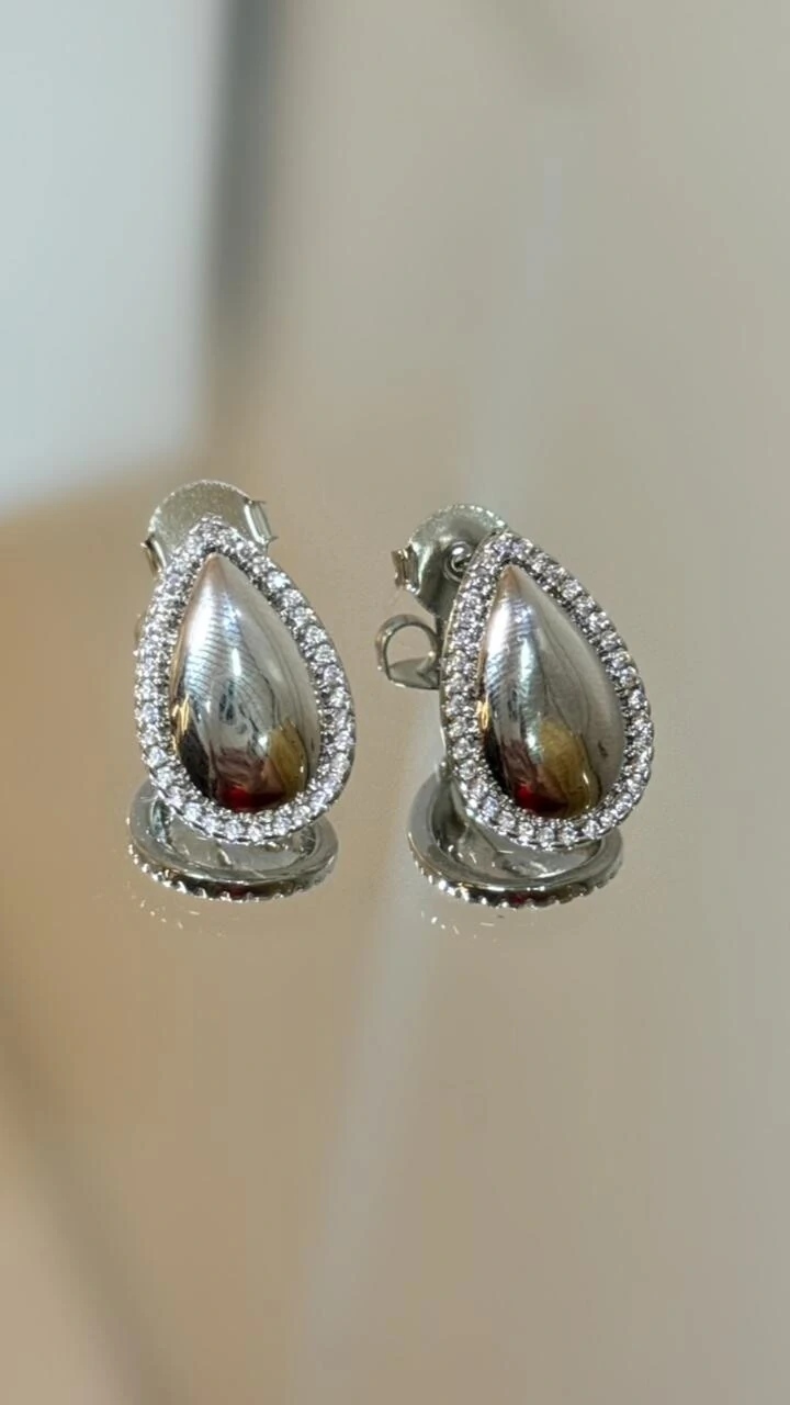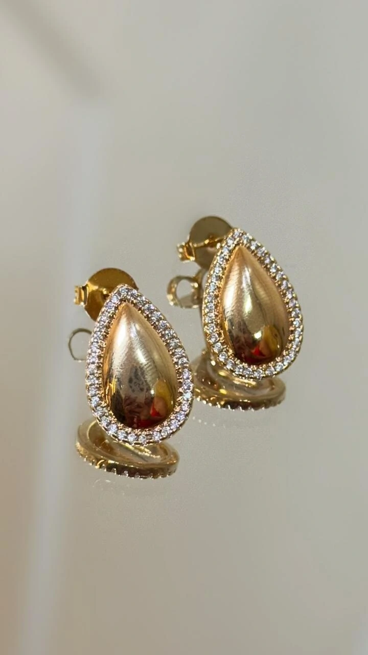 Brinco gota média com bordas cravejadas em strass fecho por tarraxa.