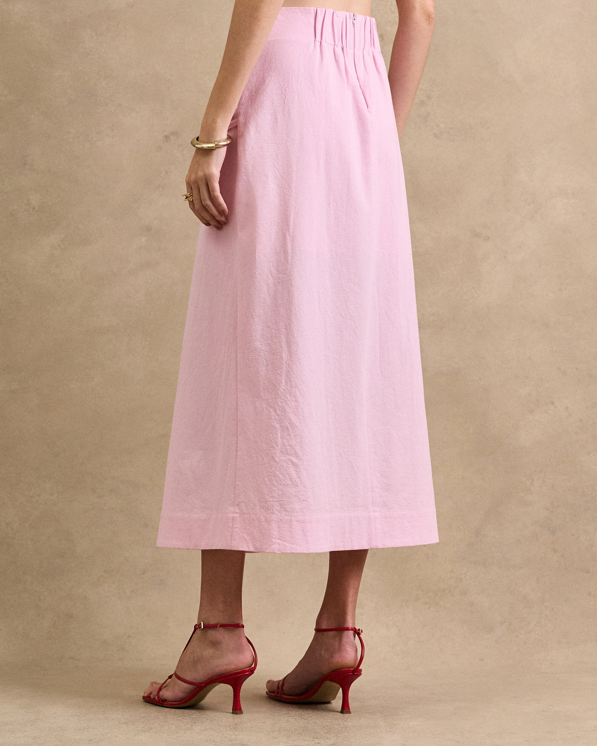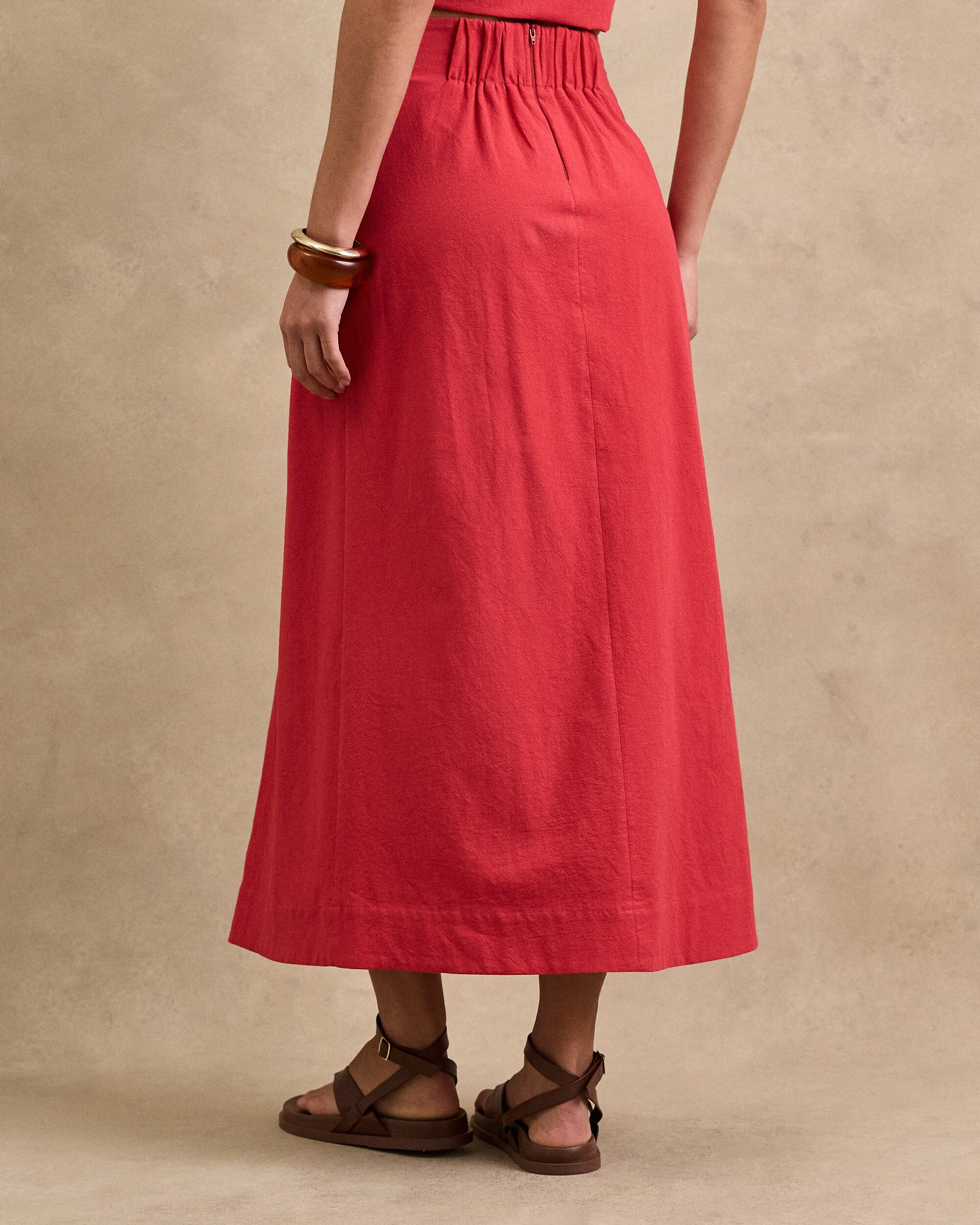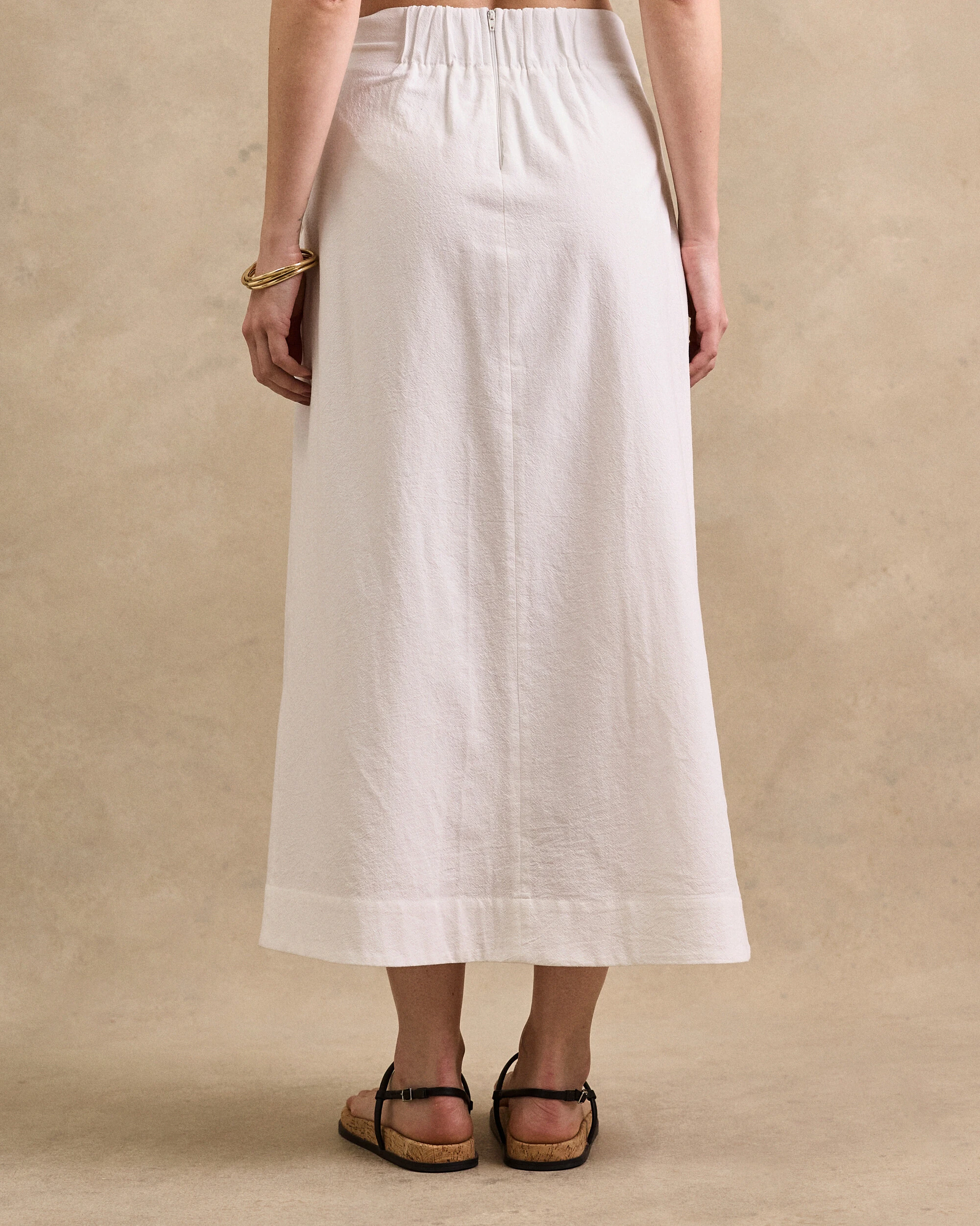 Saia midi confeccionada em algodão. Possui elástico franzido no posterior da pala, corda tripla detalhada lateral, pesponto, forro e fechamento pela parte posterior da peça por zíper.