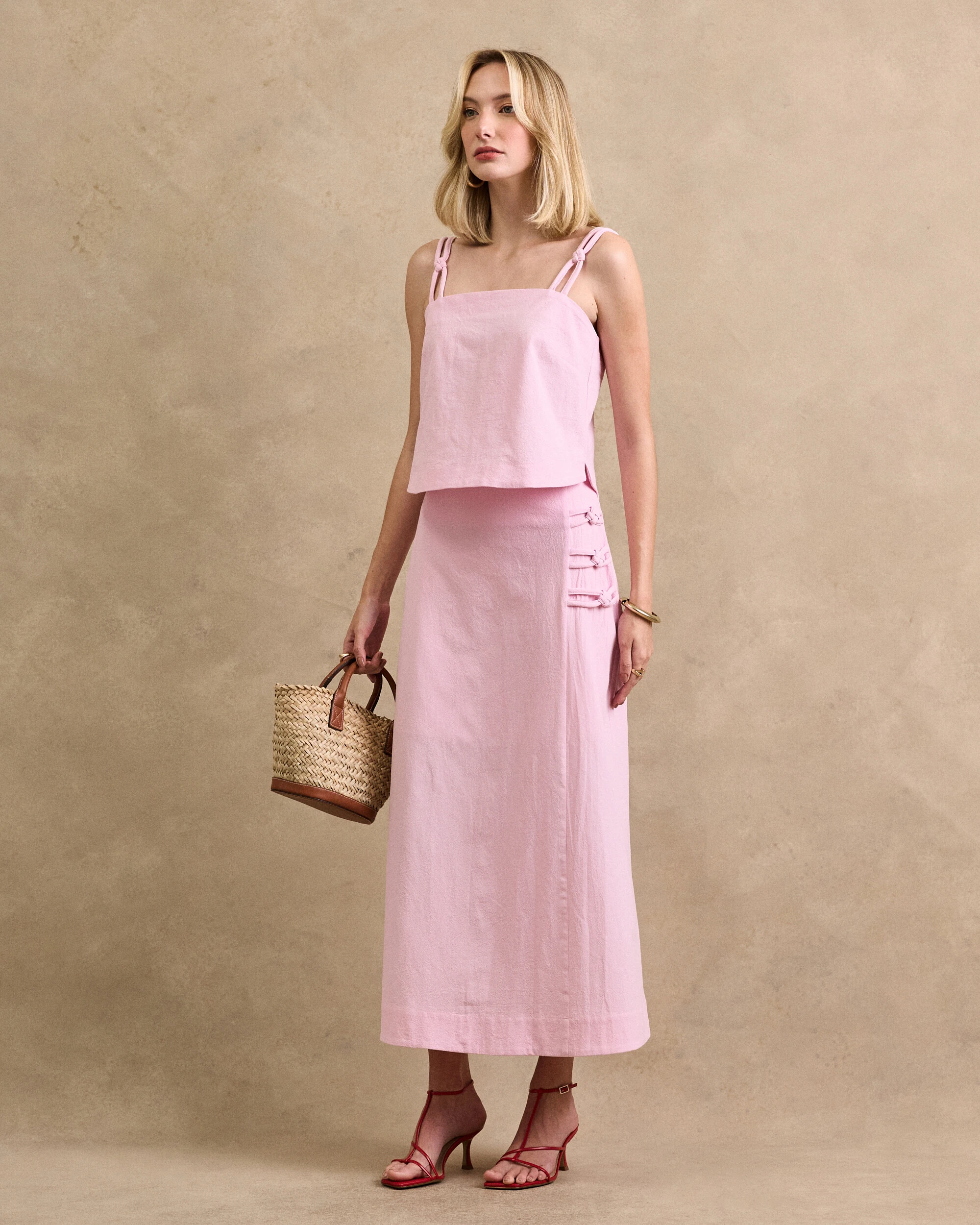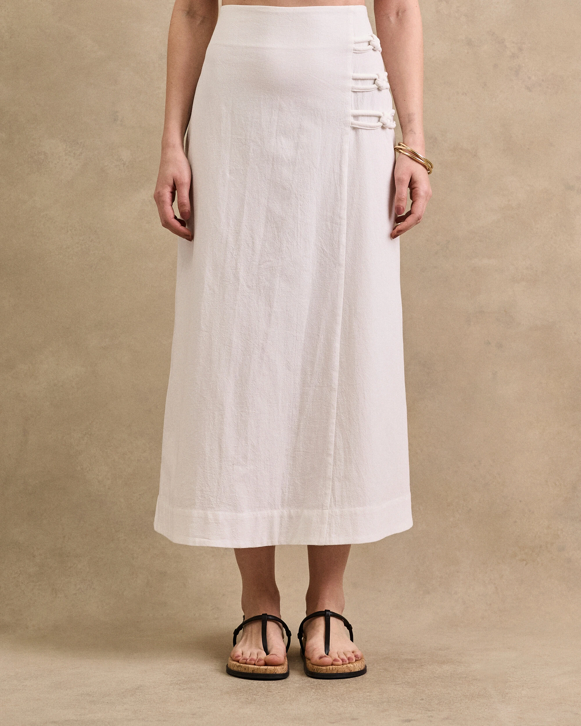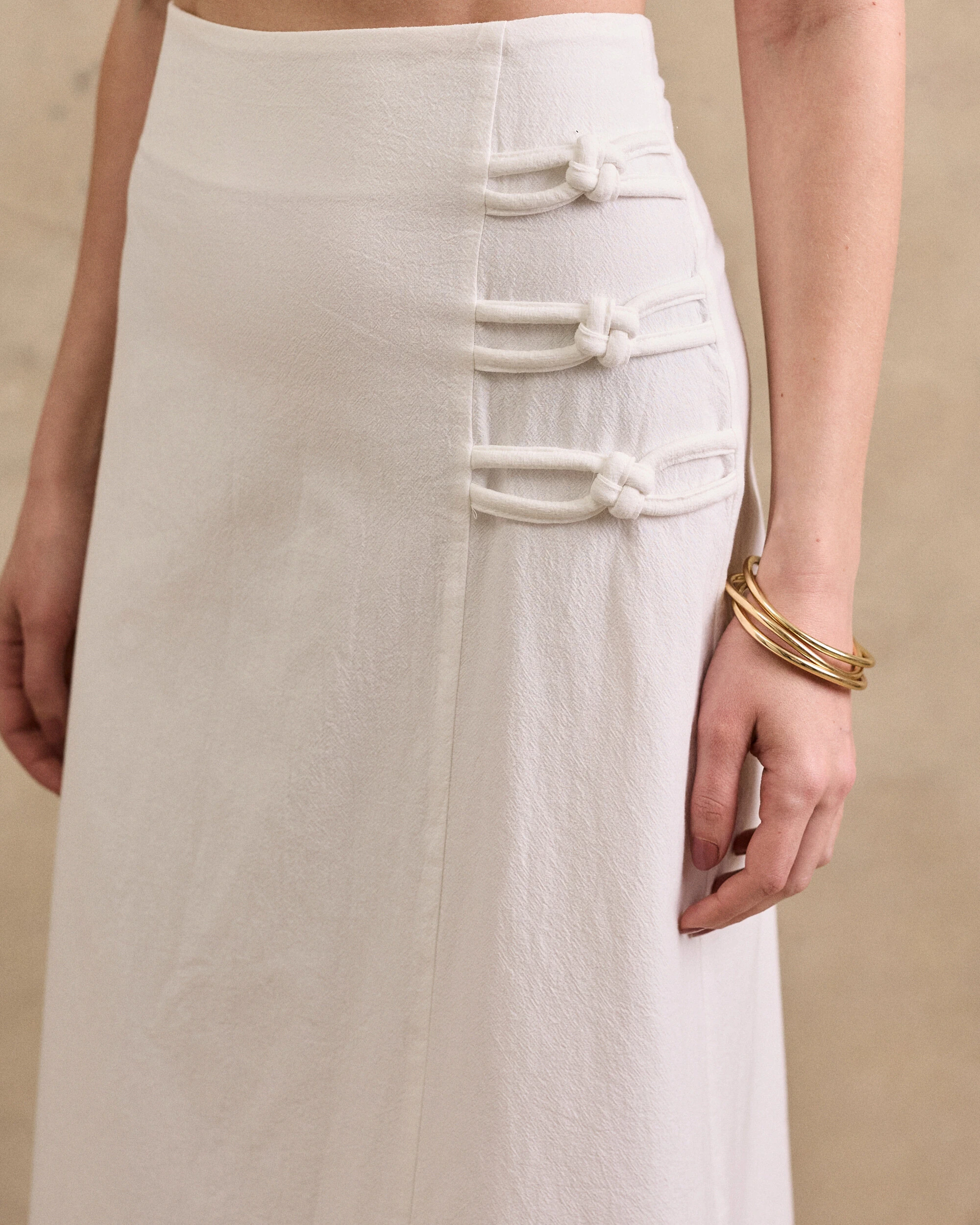 Saia midi confeccionada em algodão. Possui elástico franzido no posterior da pala, corda tripla detalhada lateral, pesponto, forro e fechamento pela parte posterior da peça por zíper.