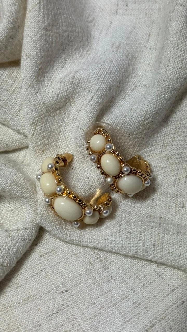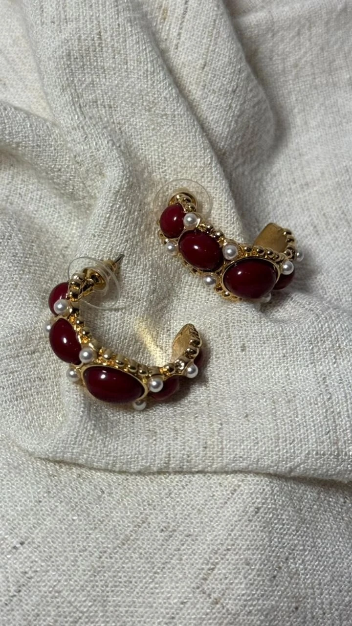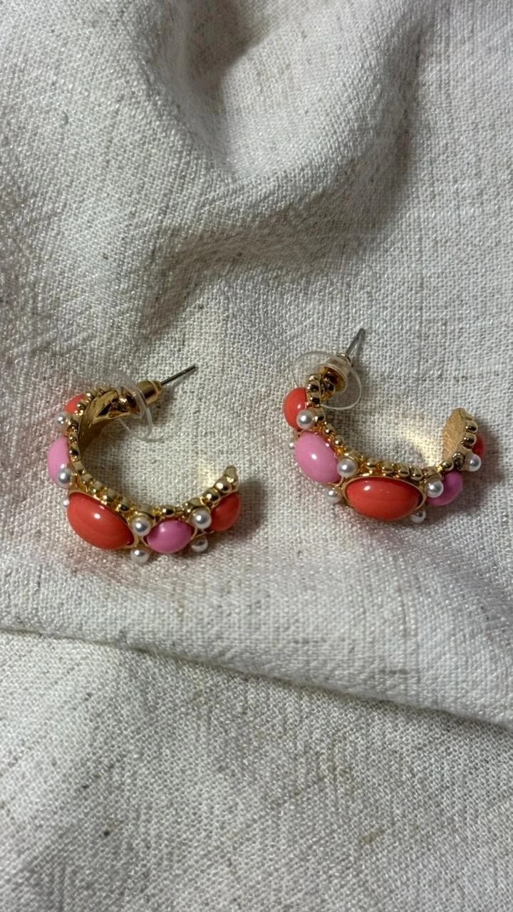 Brinco argola média com bolotas resinadas e mini pérolas com fecho de tarraxa.