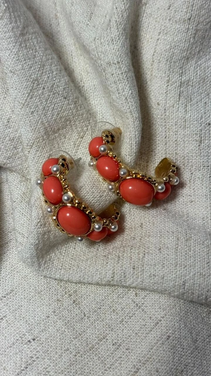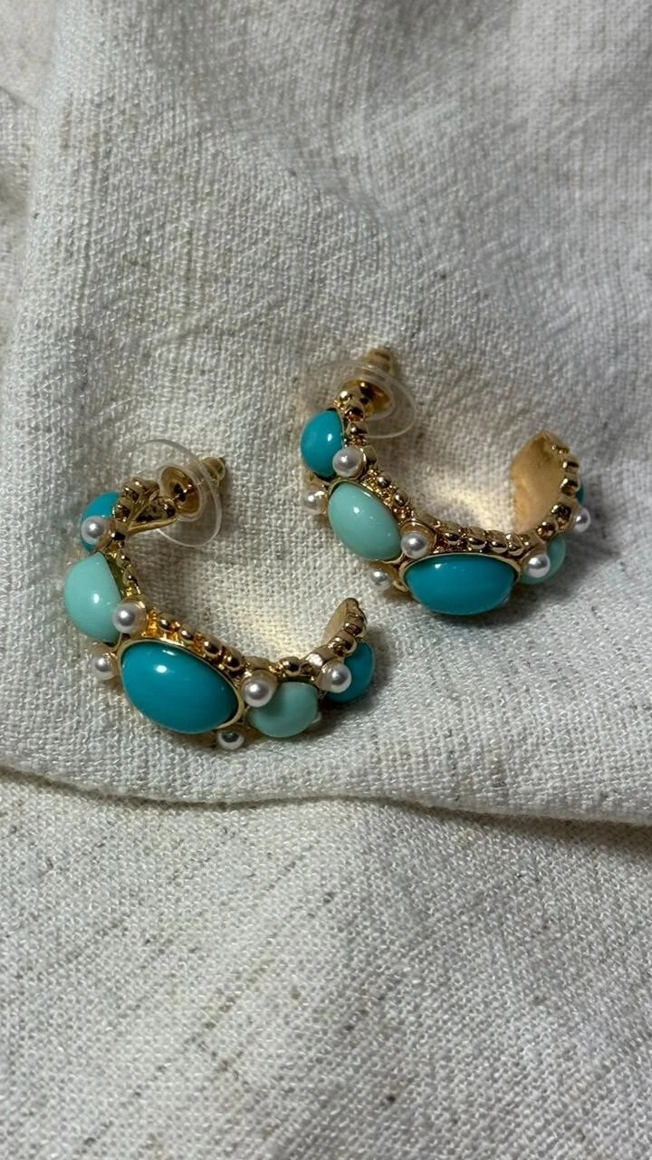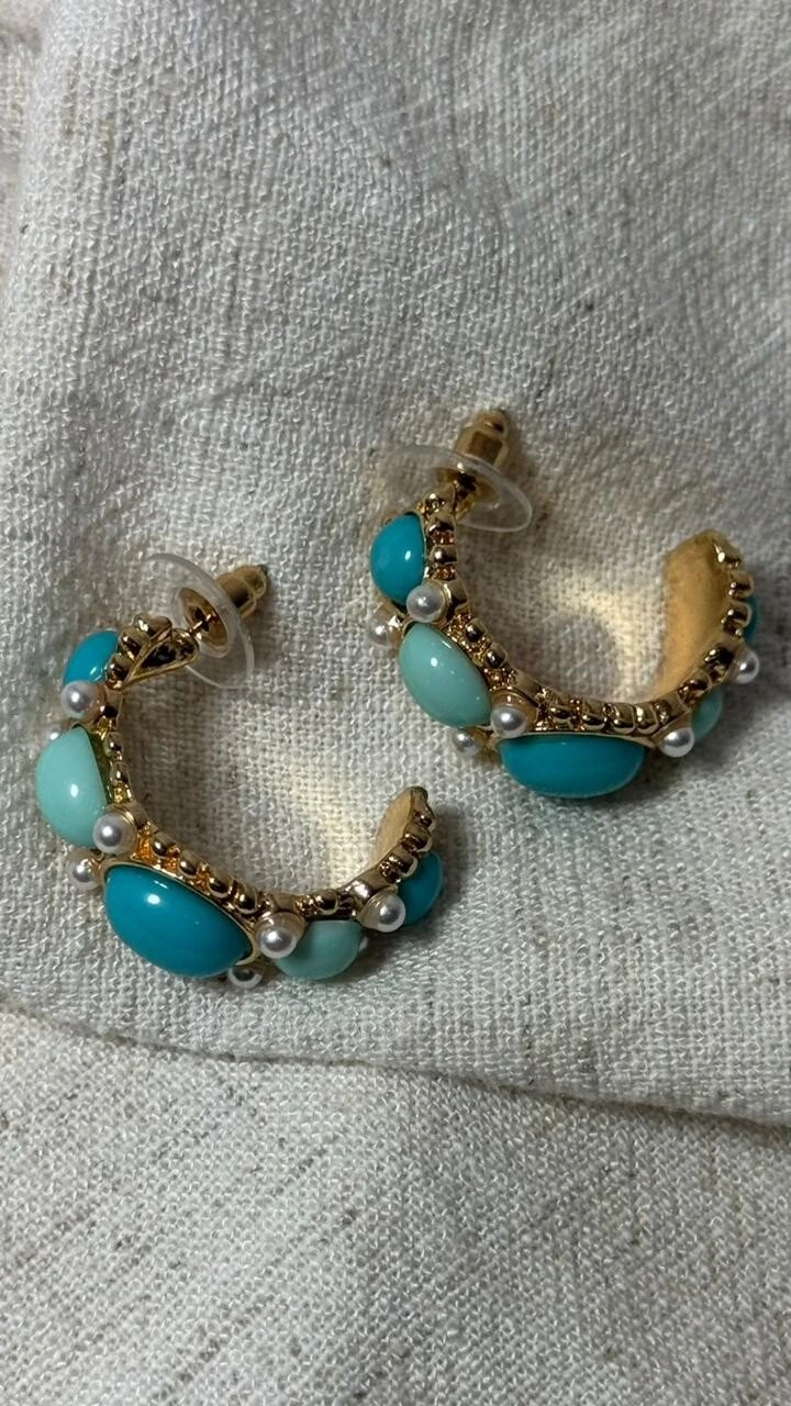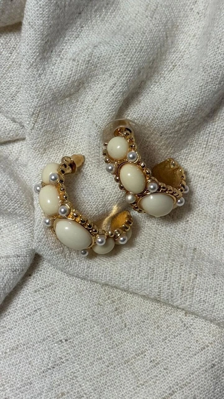 Brinco argola média com bolotas resinadas e mini pérolas com fecho de tarraxa.