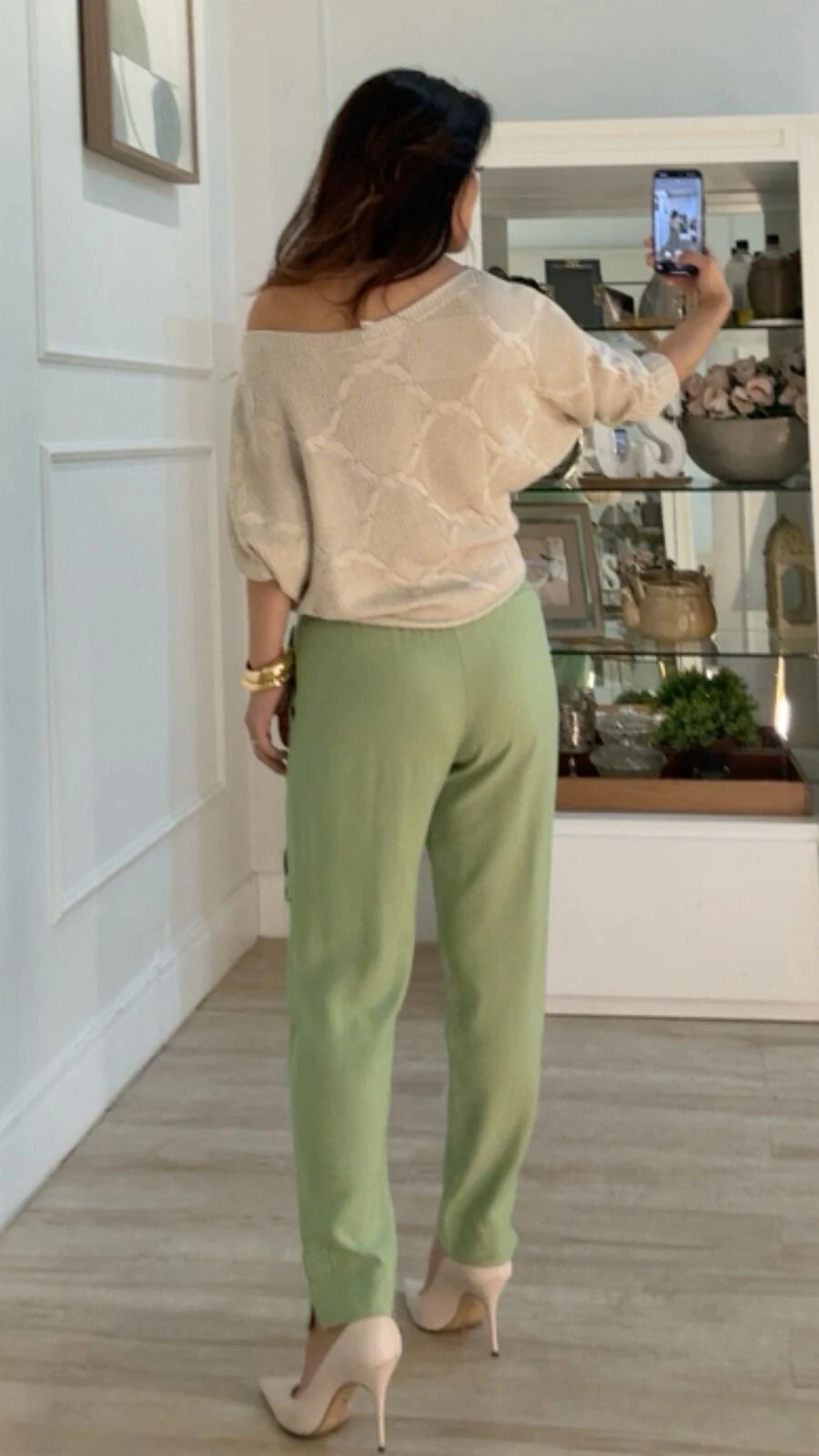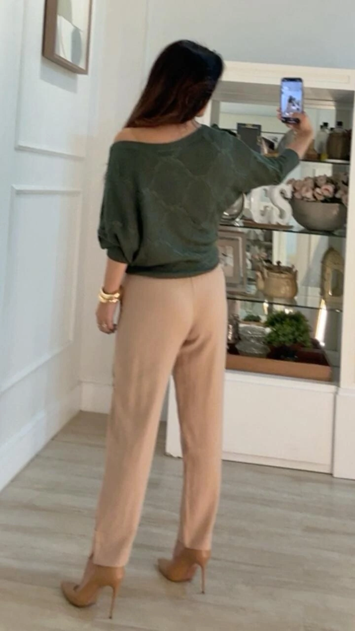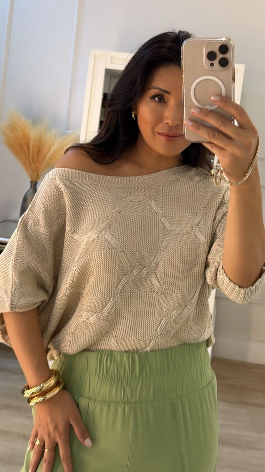 Blusa morcego confeccionada em tricot. Possui gola vazada, mangas 7/8, punhos largos canelados, com detalhe de texturas.