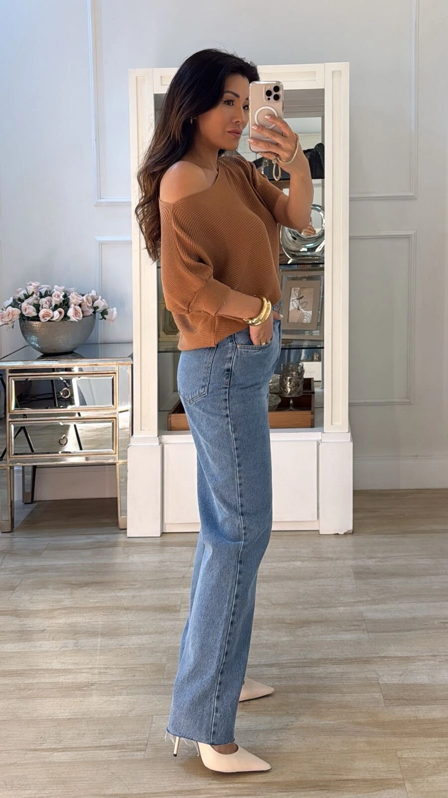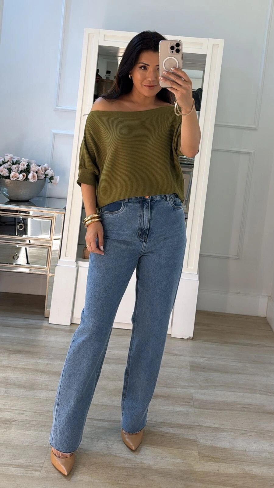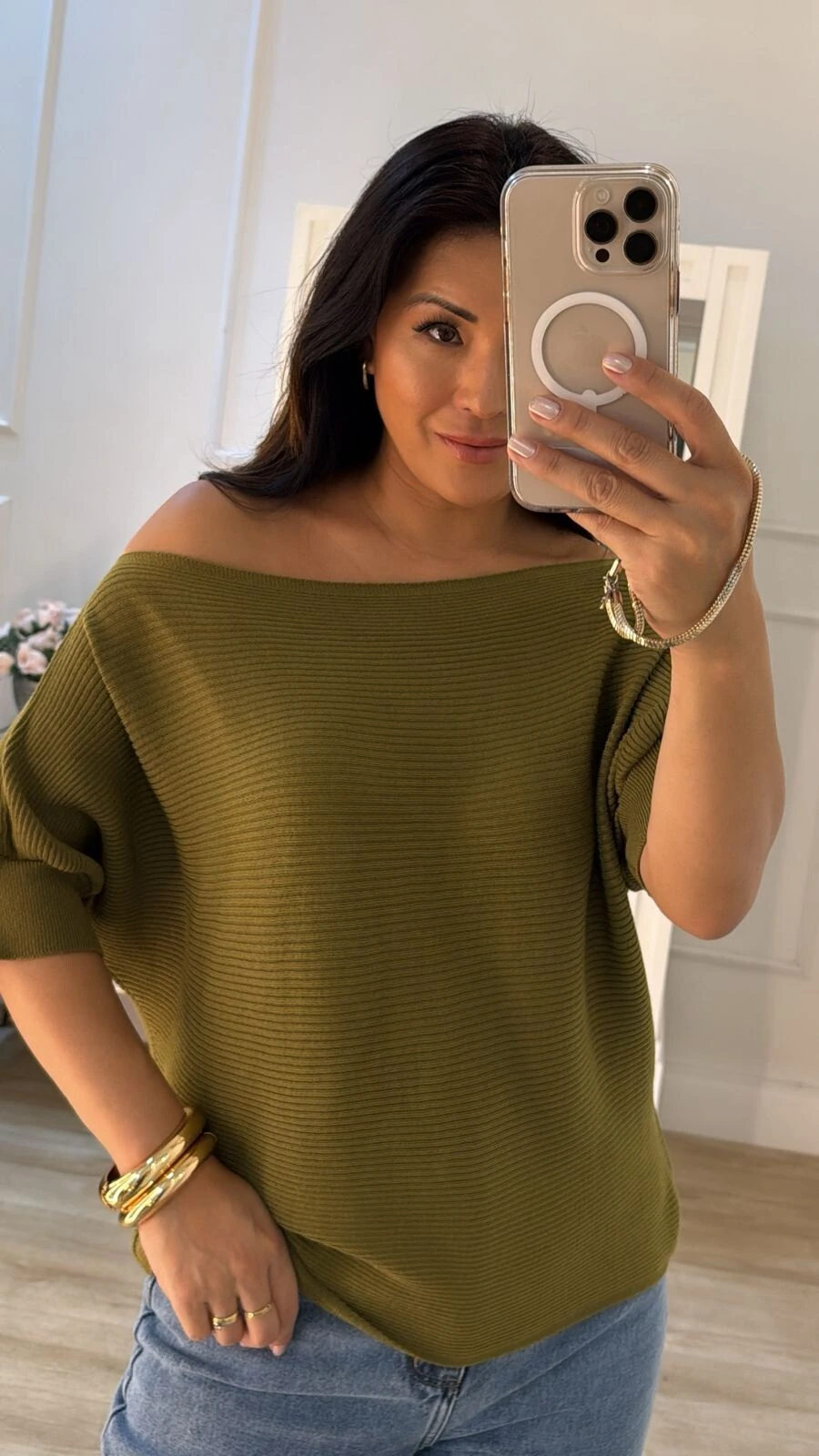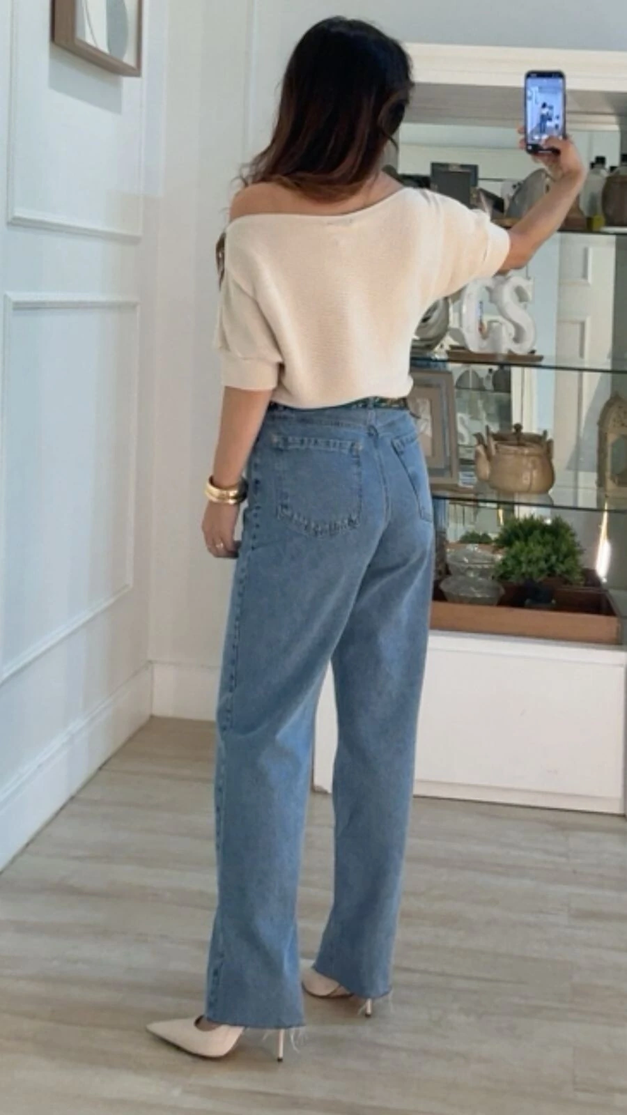 Blusa ampla confeccionada em tricot. Possui gola vazada, mangas ¾ com punhos largos, e canelados na horizontal.