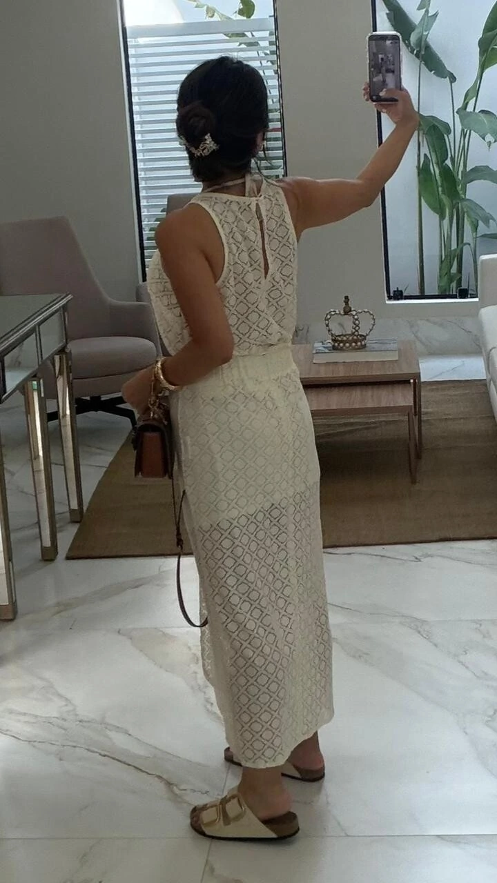Saia midi rendada confeccionada em algodão. Possui elástico franzido na parte posterior da pala, fenda frontal, fechamento pela parte posterior da peça por zíper, lenço com amarração lateral, forro saia com elástico na parte superior.