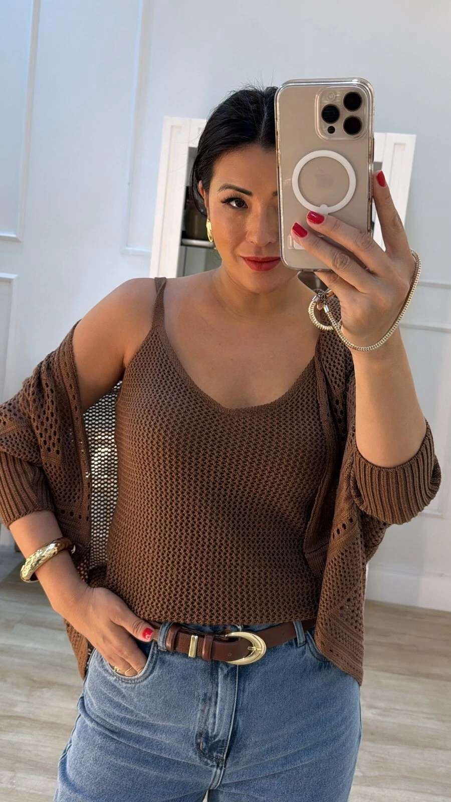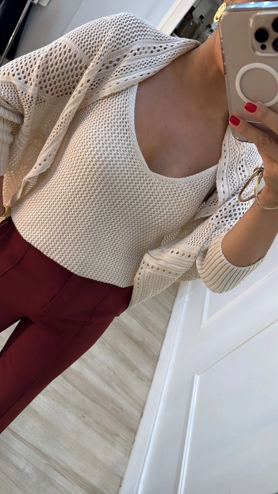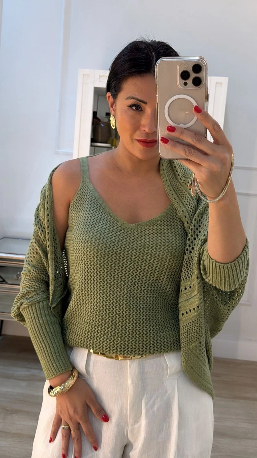 Twin set confeccionado em tricot. Blusa regata: possui alças finas, decote V, entremeios por toda a peça com a frontal forrada. Cardigan: possui mangas 7/8, punhos largos, entremeios por toda a peça e modelagem ampla.