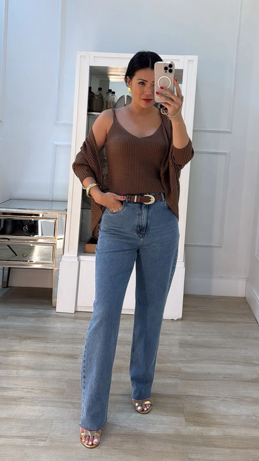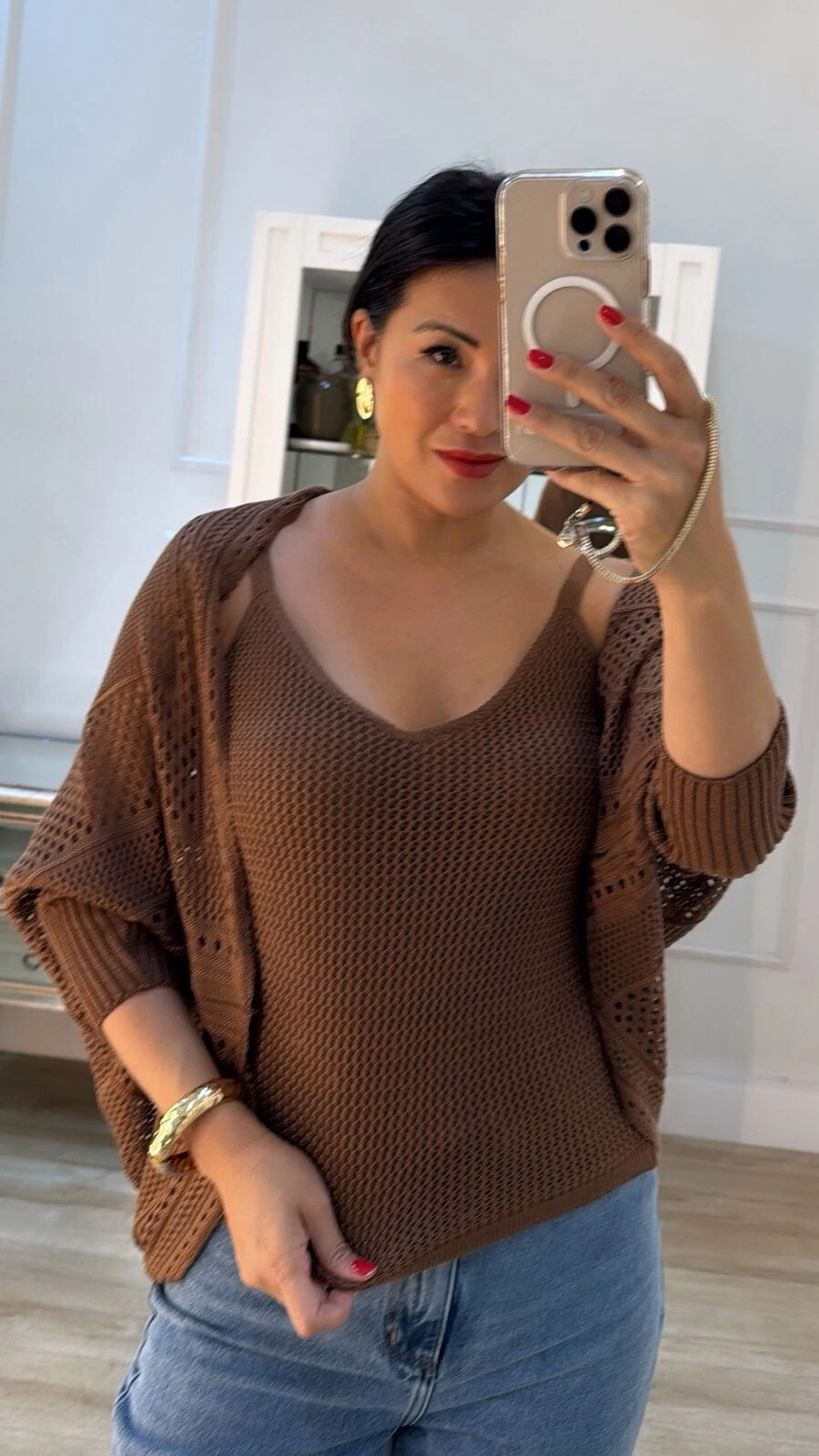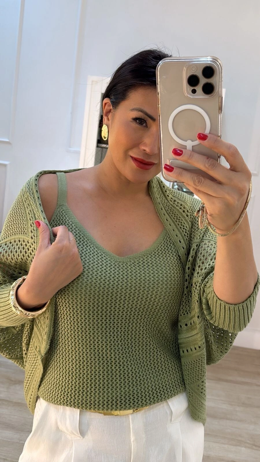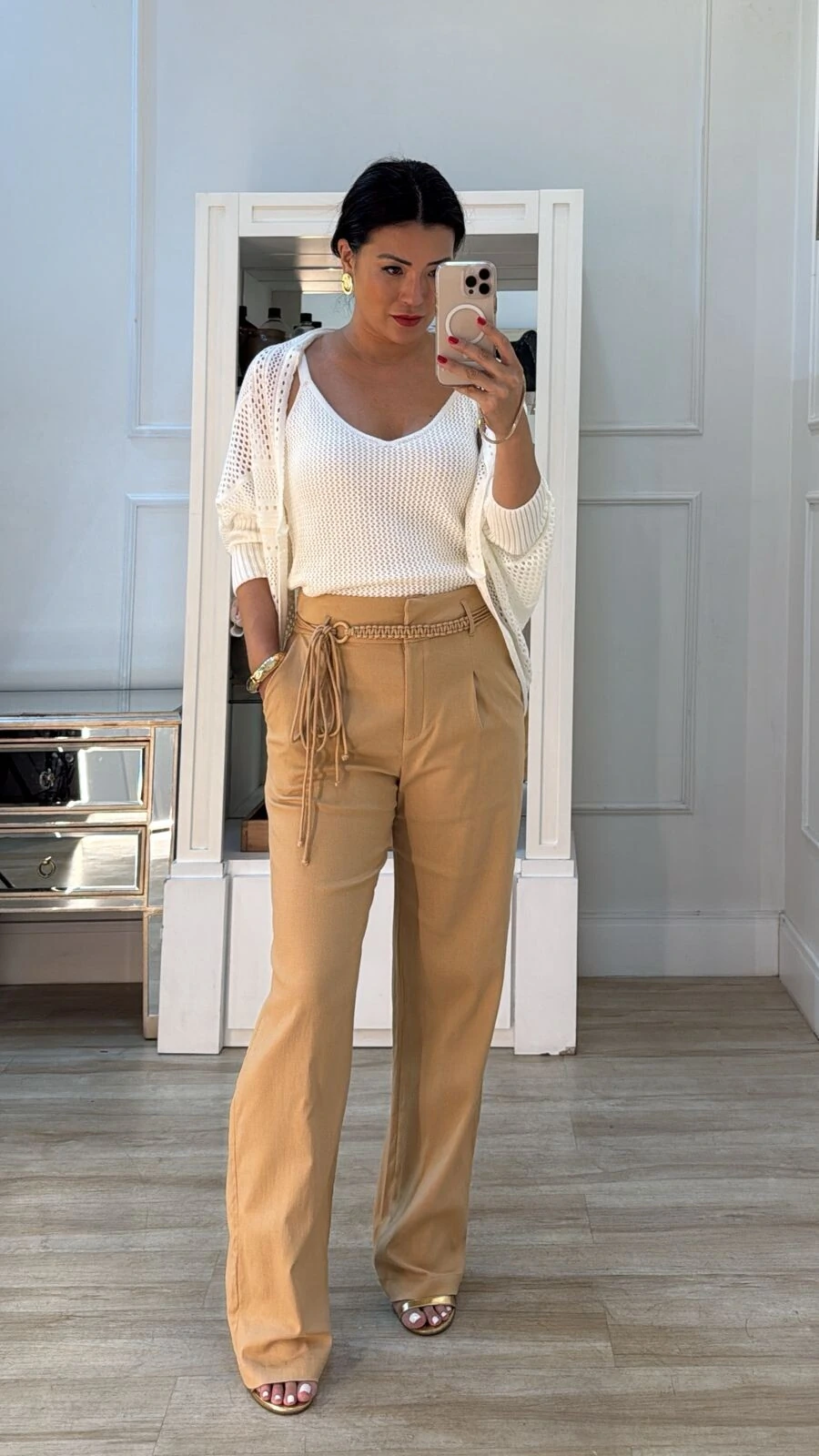 Twin set confeccionado em tricot. Blusa regata: possui alças finas, decote V, entremeios por toda a peça com a frontal forrada. Cardigan: possui mangas 7/8, punhos largos, entremeios por toda a peça e modelagem ampla.