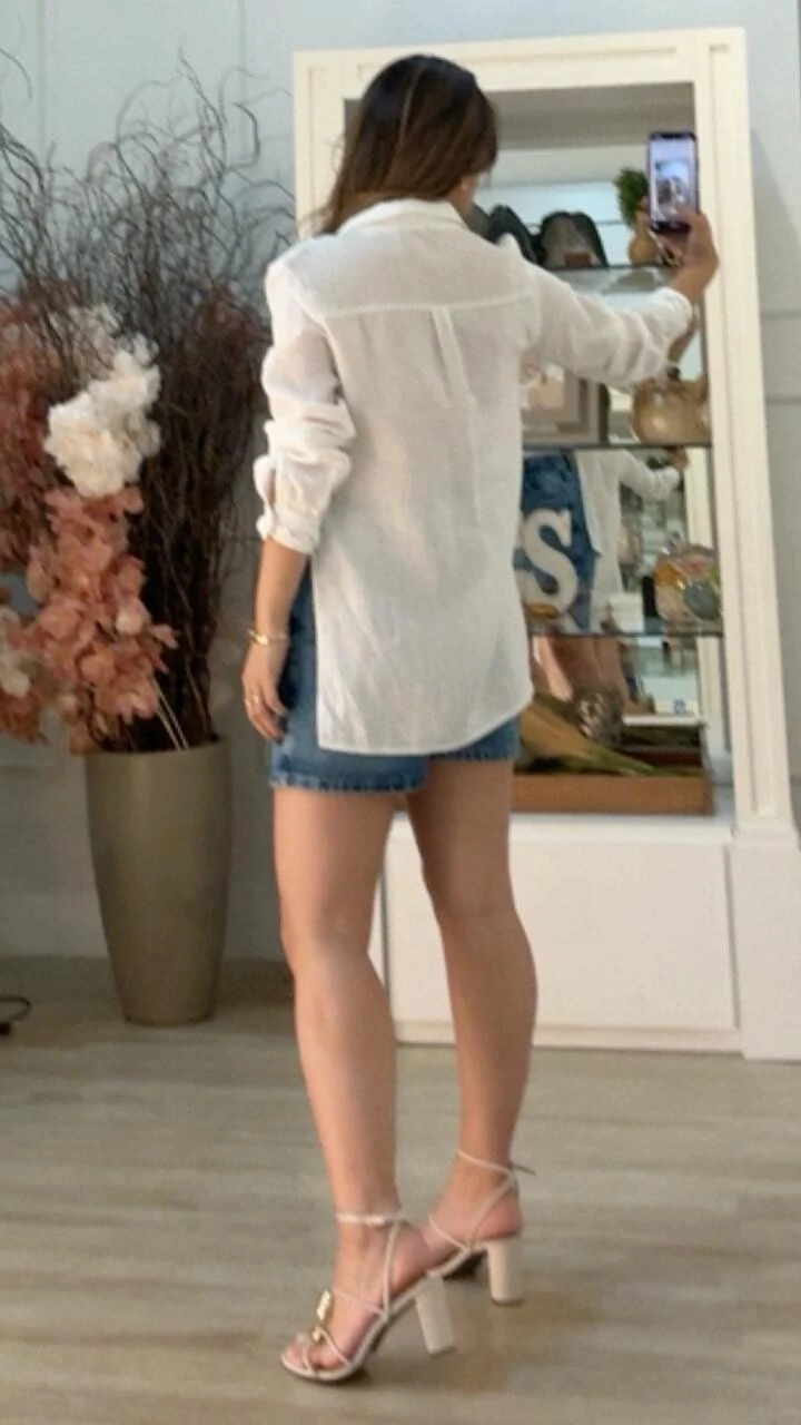 Camisa confeccionada em linho. Possui gola, mangas longas, punhos com detalhes trançados, fendas laterais e fechamento da peça por botões forrados frontais.