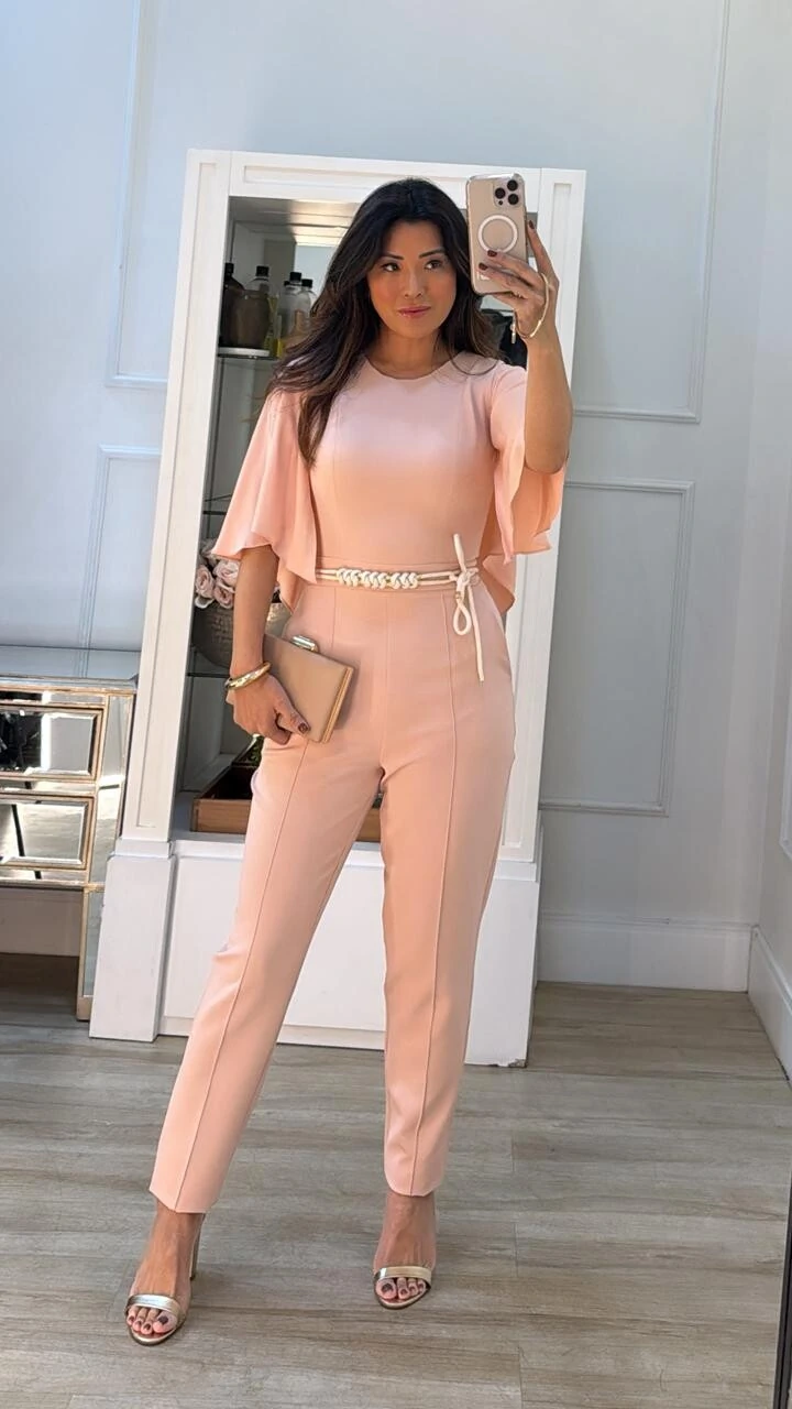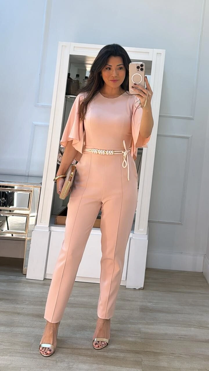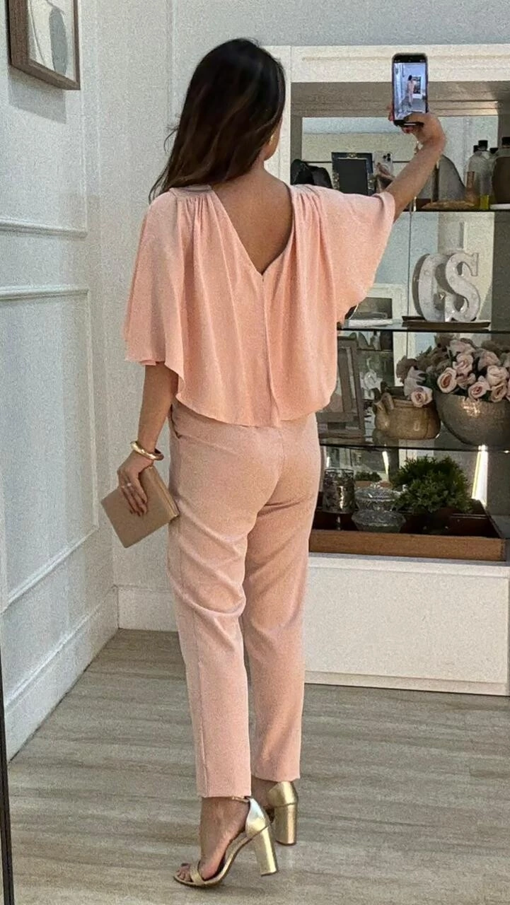 Macacão confeccionado em alfaiataria, manga em crepe. Possui gola canoa, mangas echarpe, decote v posterior, bolsos e nervuras frontais, pesponto, forro, fechamento pela parte posterior da peça por zíper e cinto corda trançado.