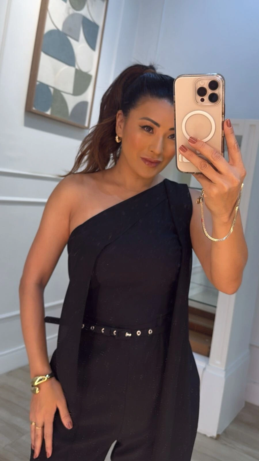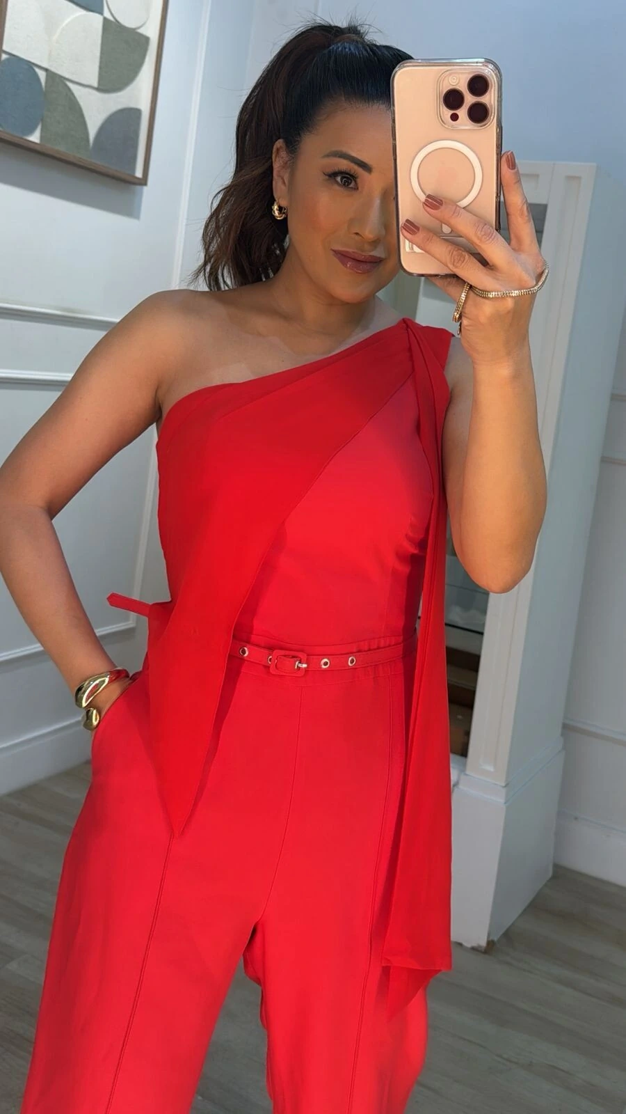 Macacão confeccionado em twill. Possui decote assimétrico, alça fina com detalhe em chiffon, bolsos e nervuras frontais, pesponto, forro, fechamento posterior da peça por zíper e cinto fino.
