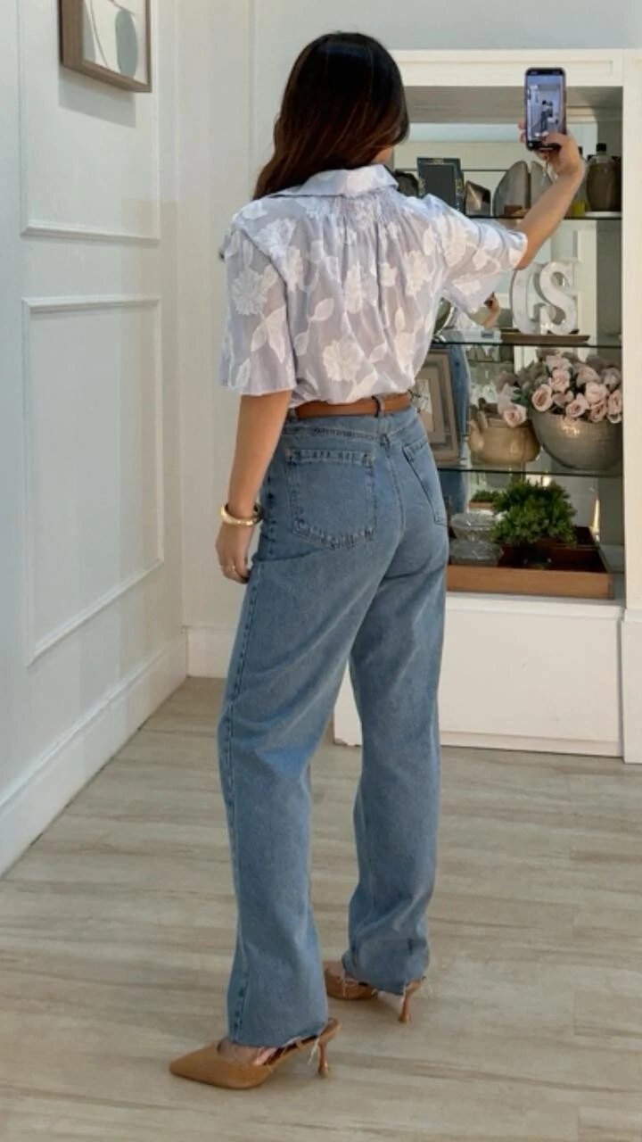 Camisa listrada bordada confeccionada em algodão. Possui gola, mangas ¾ evasê, lástex posterior, fechamento frontal da peça por botões e pesponto.