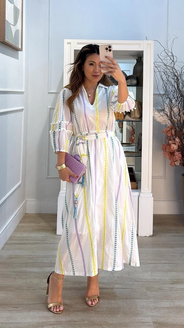 Vestido midi bordado confeccionado em algodão. Possui gola, decote v, mangas 7/8 detalhe de pompons, elástico nos punhos e cintura, pesponto, forro(saia), cinto faixa com ponteiras em tassel.