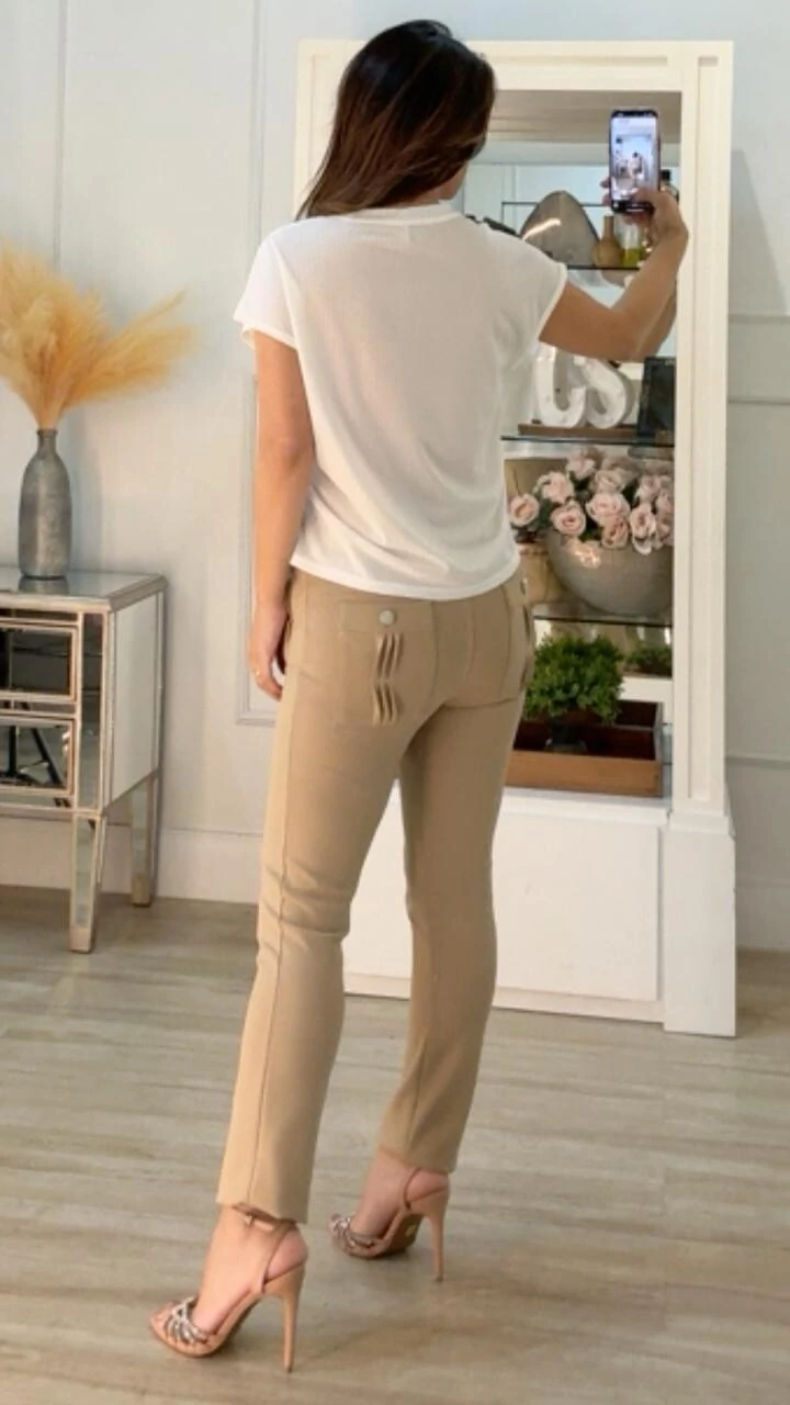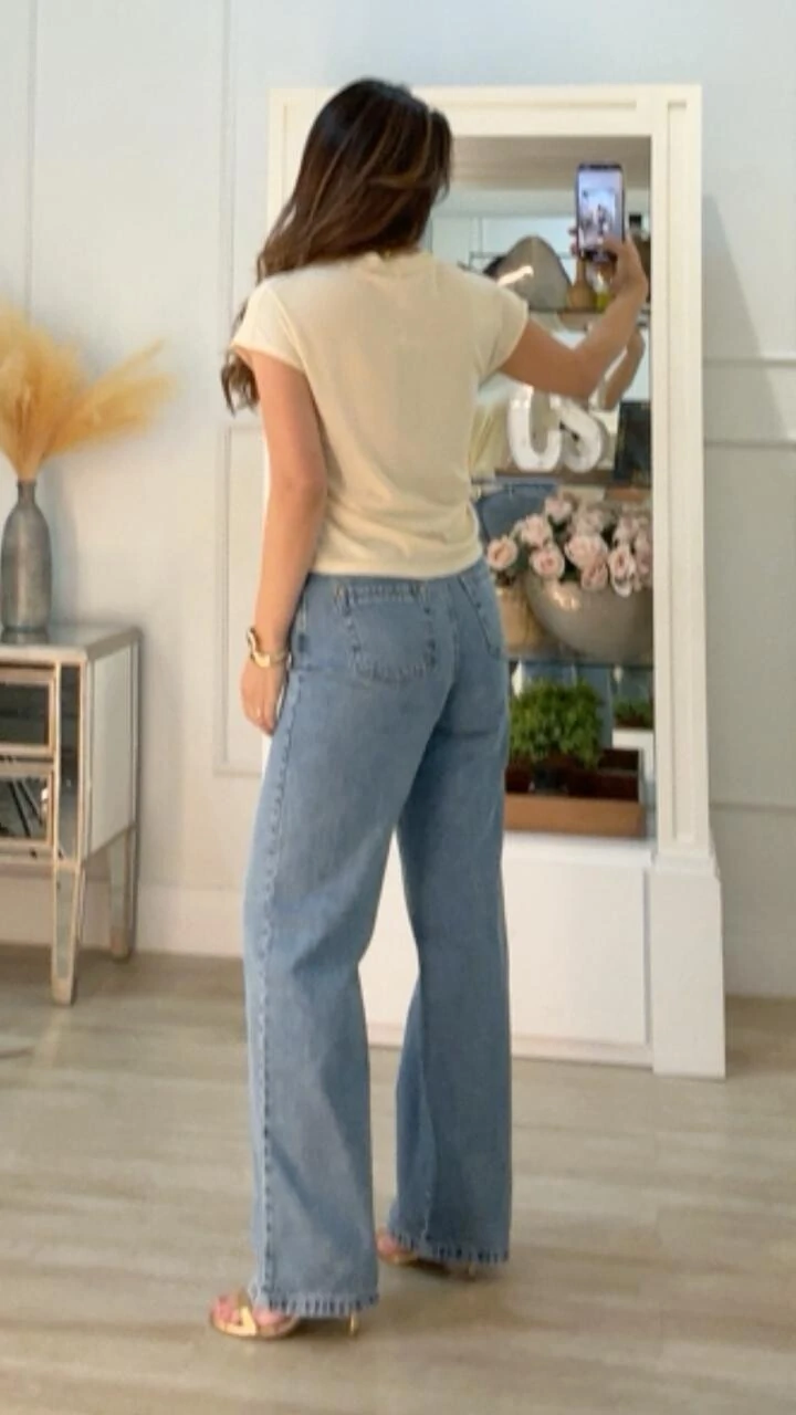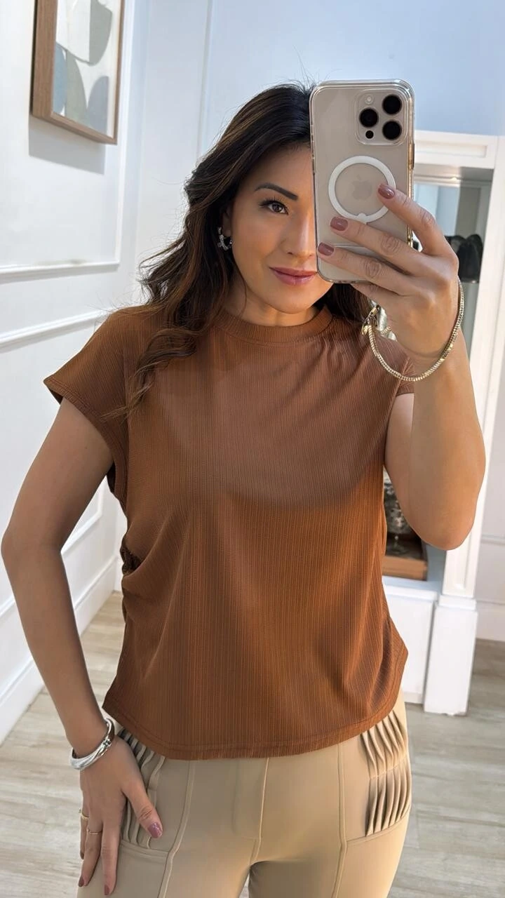 Blusa ampla canelada com detalhes texturizados. Possui gola careca, mangas curtas e laterais com drapeado.