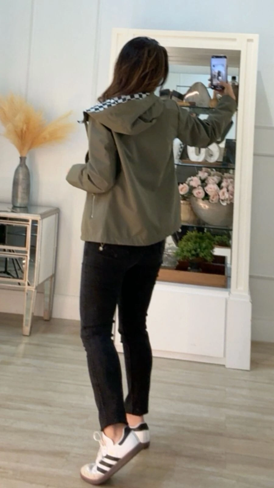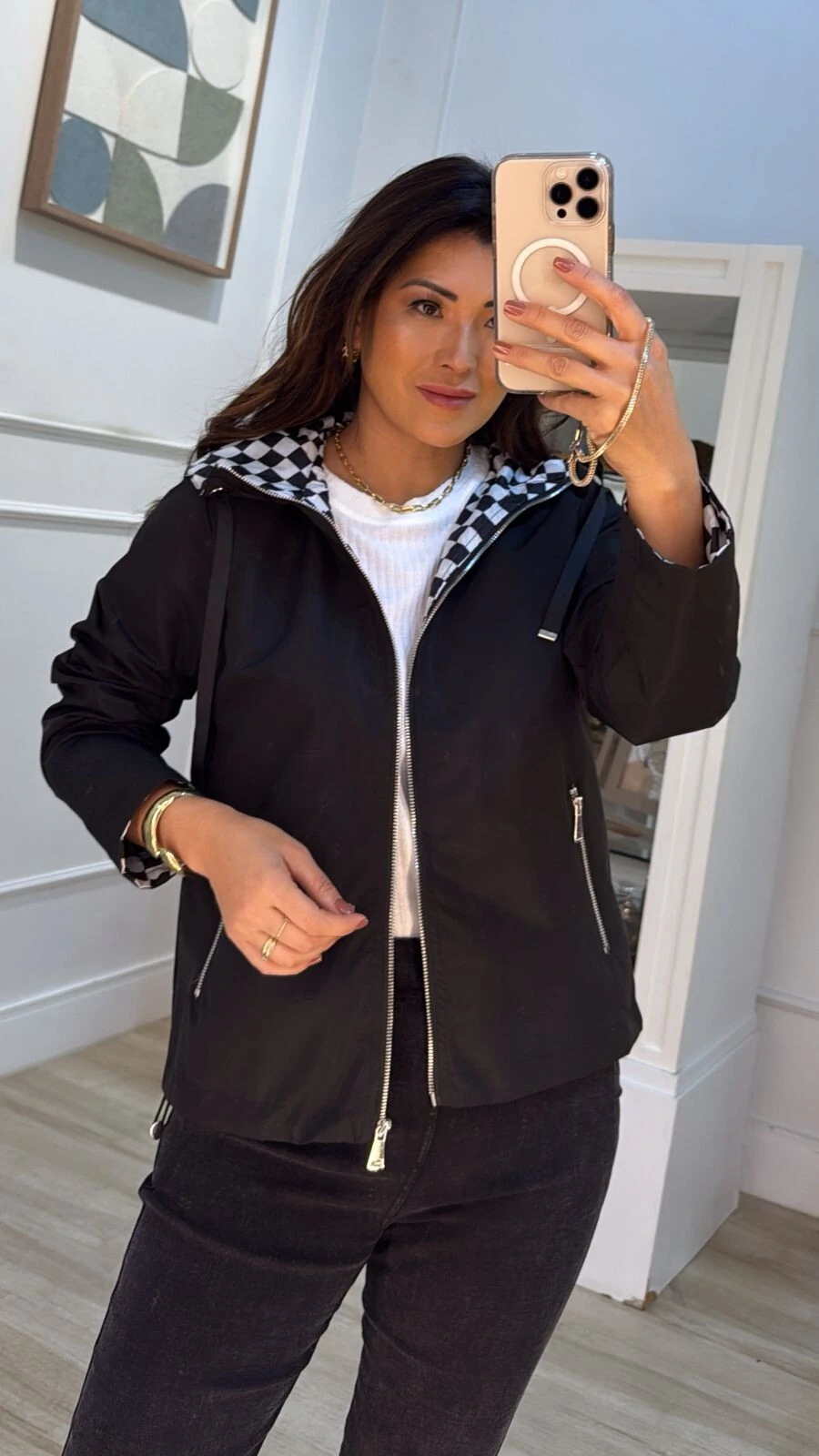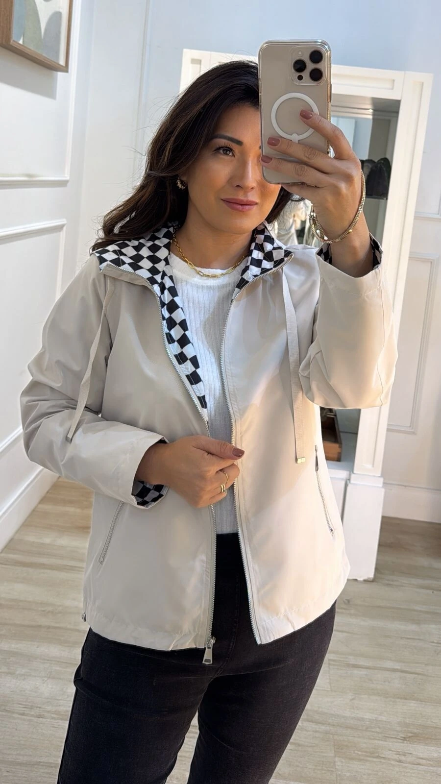 Jaqueta corta vento. Possui forro quadriculado, capuz com detalhes reguláveis, mangas longas, puxadores no barrado e zíperes prata nos bolsos e parte frontal.