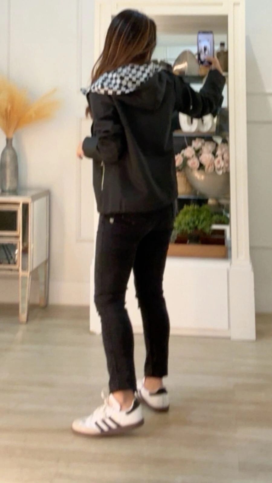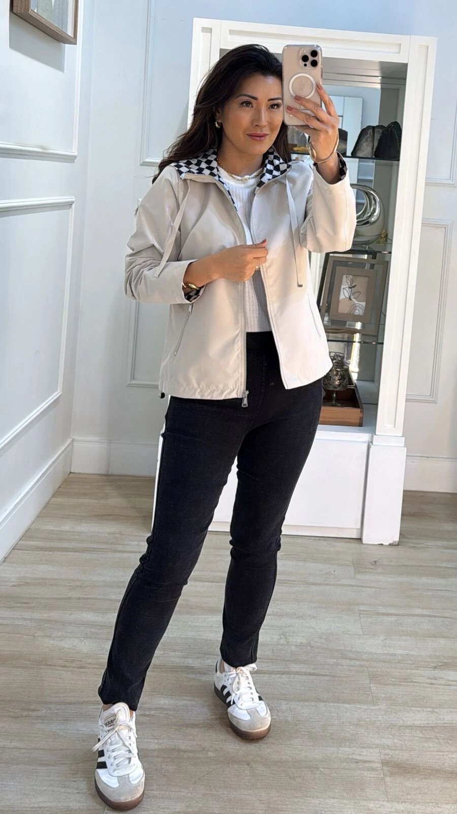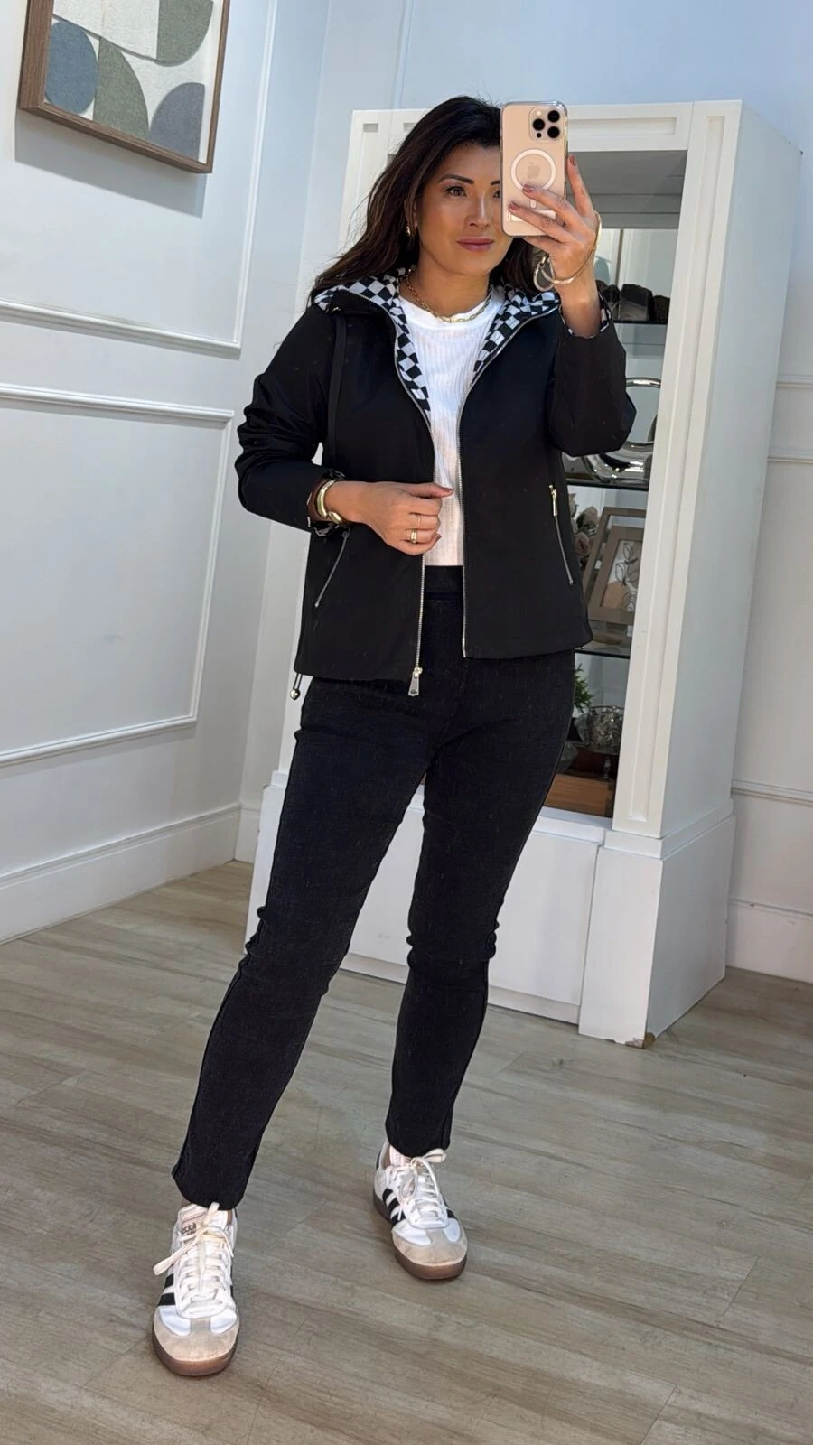 Jaqueta corta vento. Possui forro quadriculado, capuz com detalhes reguláveis, mangas longas, puxadores no barrado e zíperes prata nos bolsos e parte frontal.