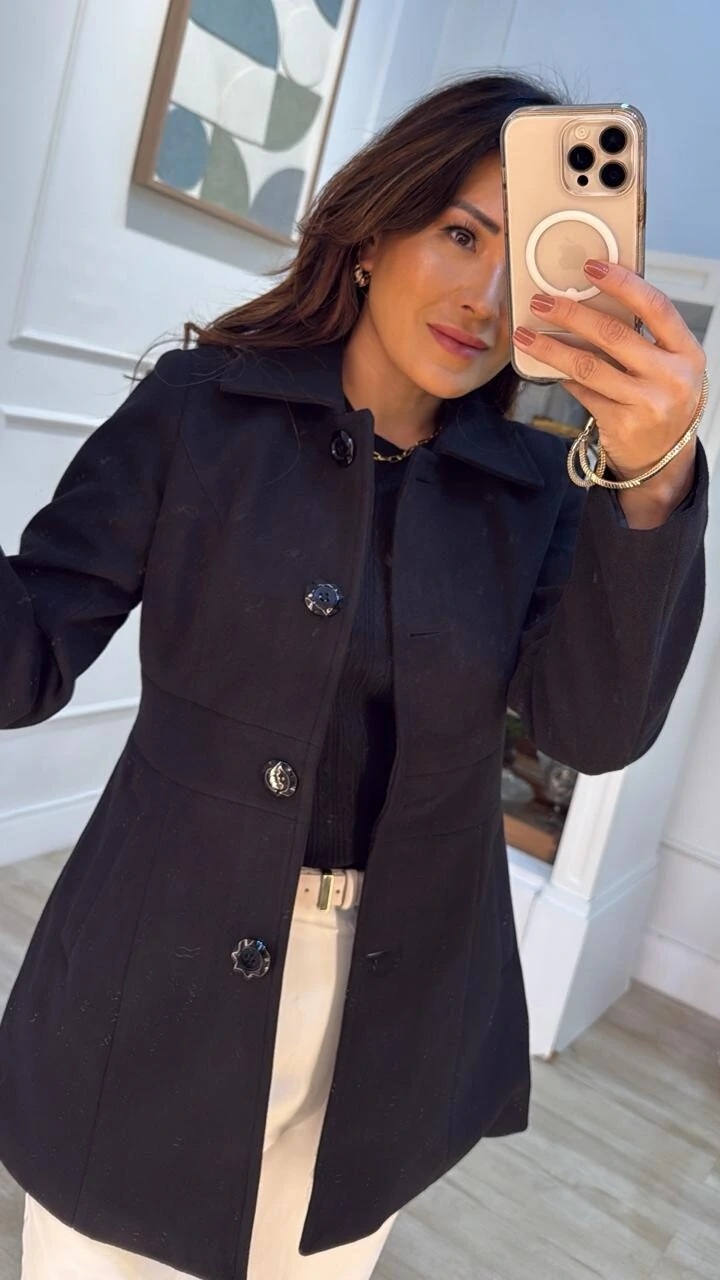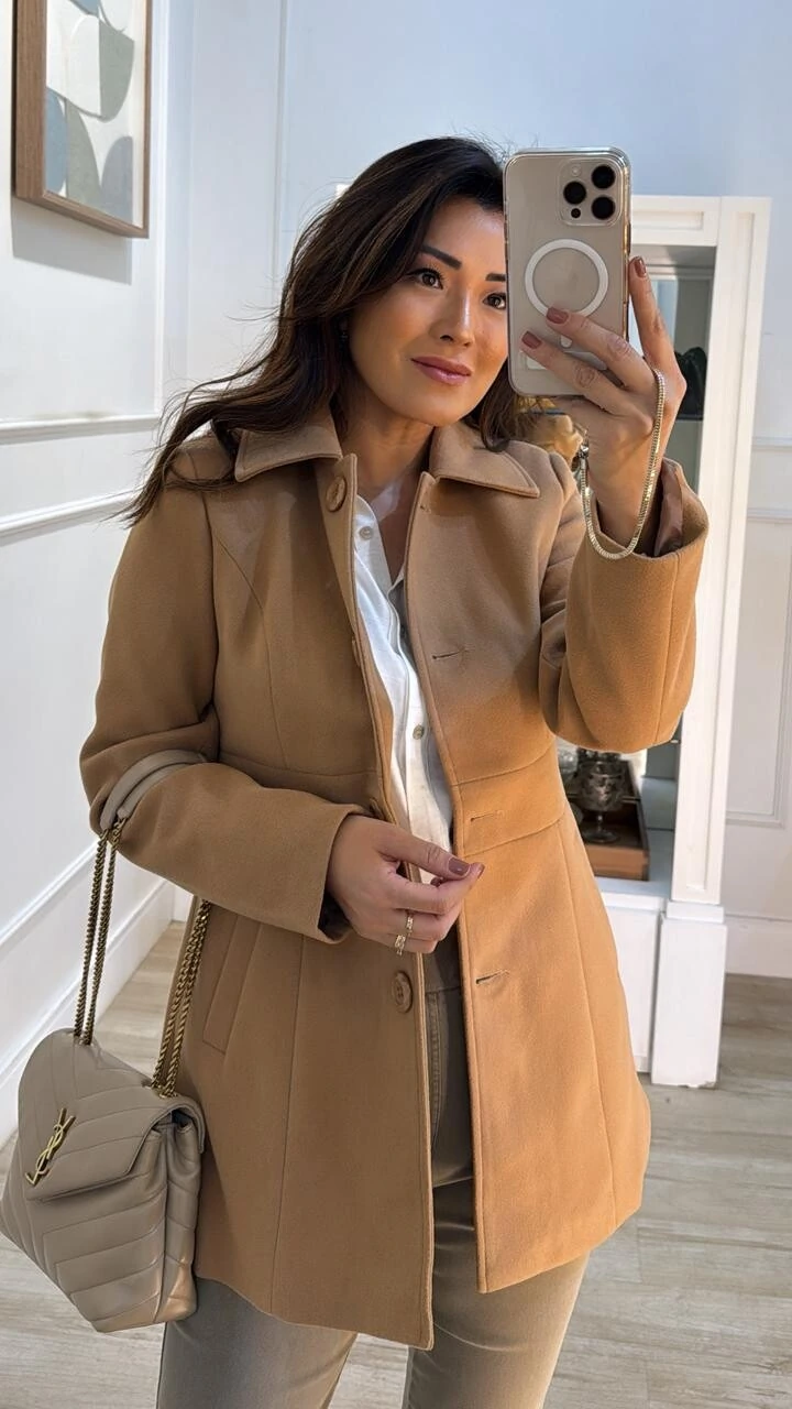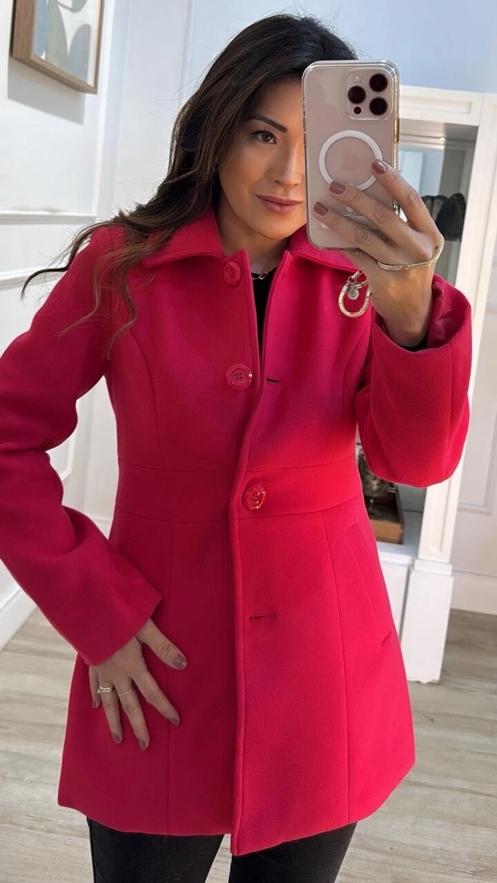 Casaco confeccionado em lã batida. Possui gola, mangas longas, recorte na cintura, bolsos frontais na diagonal com relevo, forro, e fechamento pela parte frontal da peça por boões resinados.