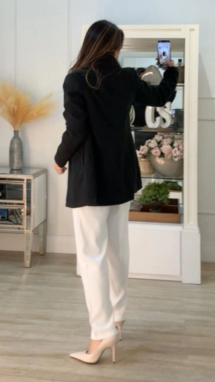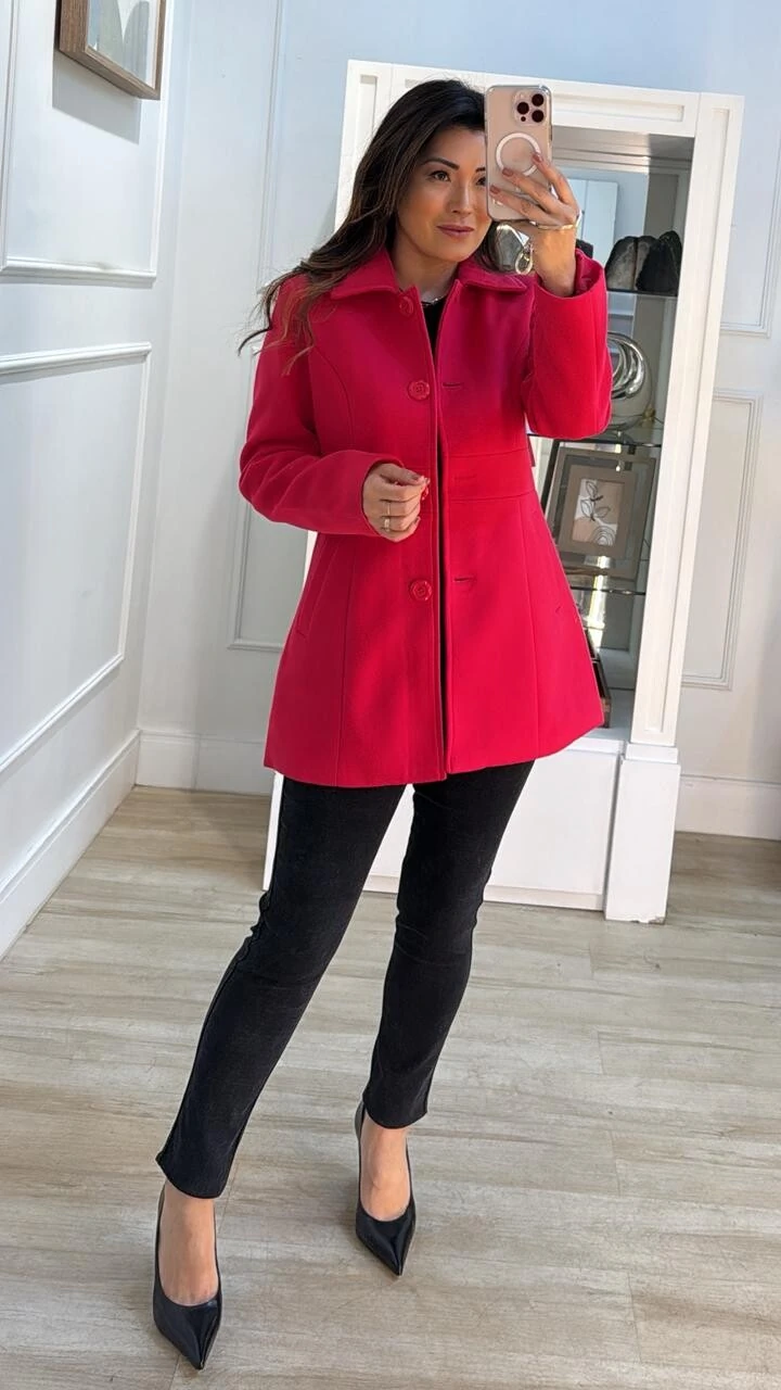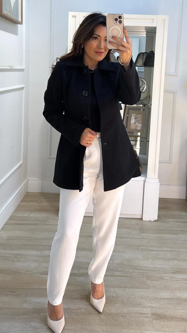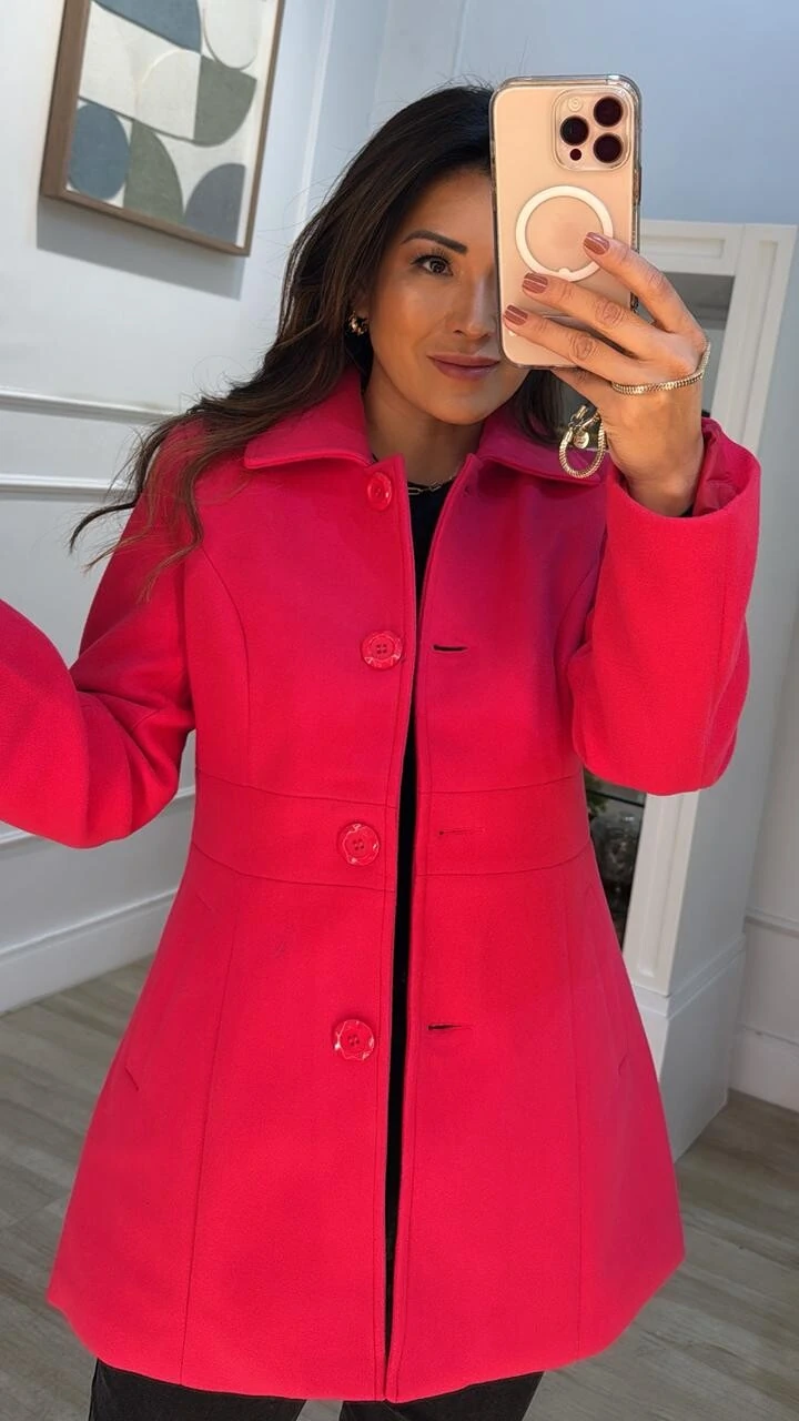 Casaco confeccionado em lã batida. Possui gola, mangas longas, recorte na cintura, bolsos frontais na diagonal com relevo, forro, e fechamento pela parte frontal da peça por boões resinados.