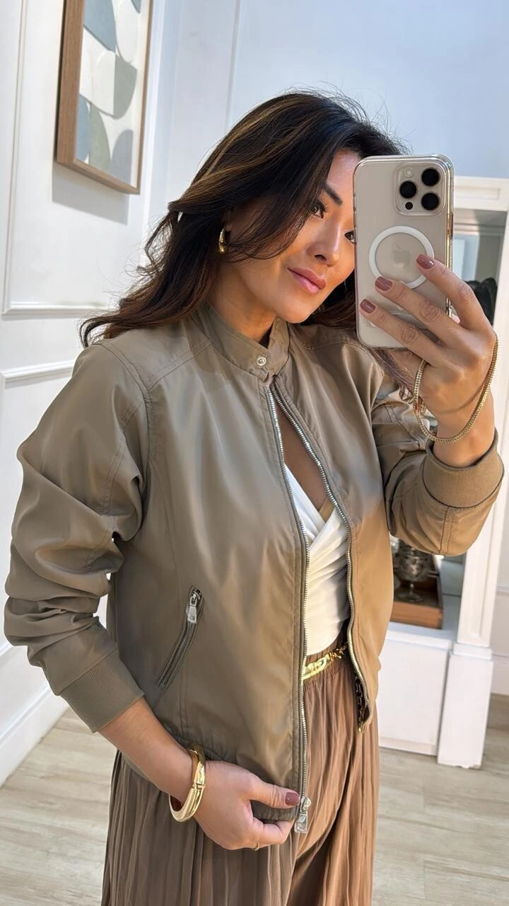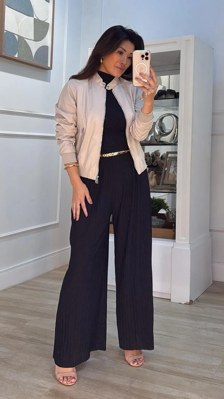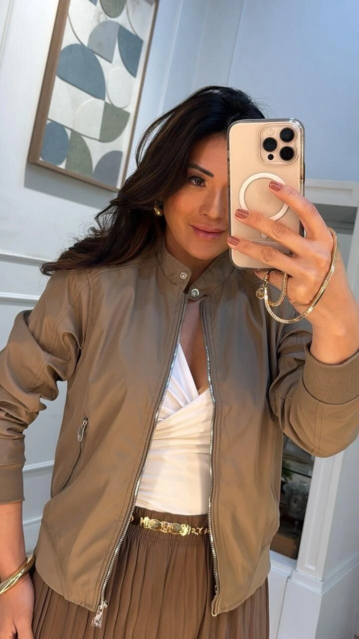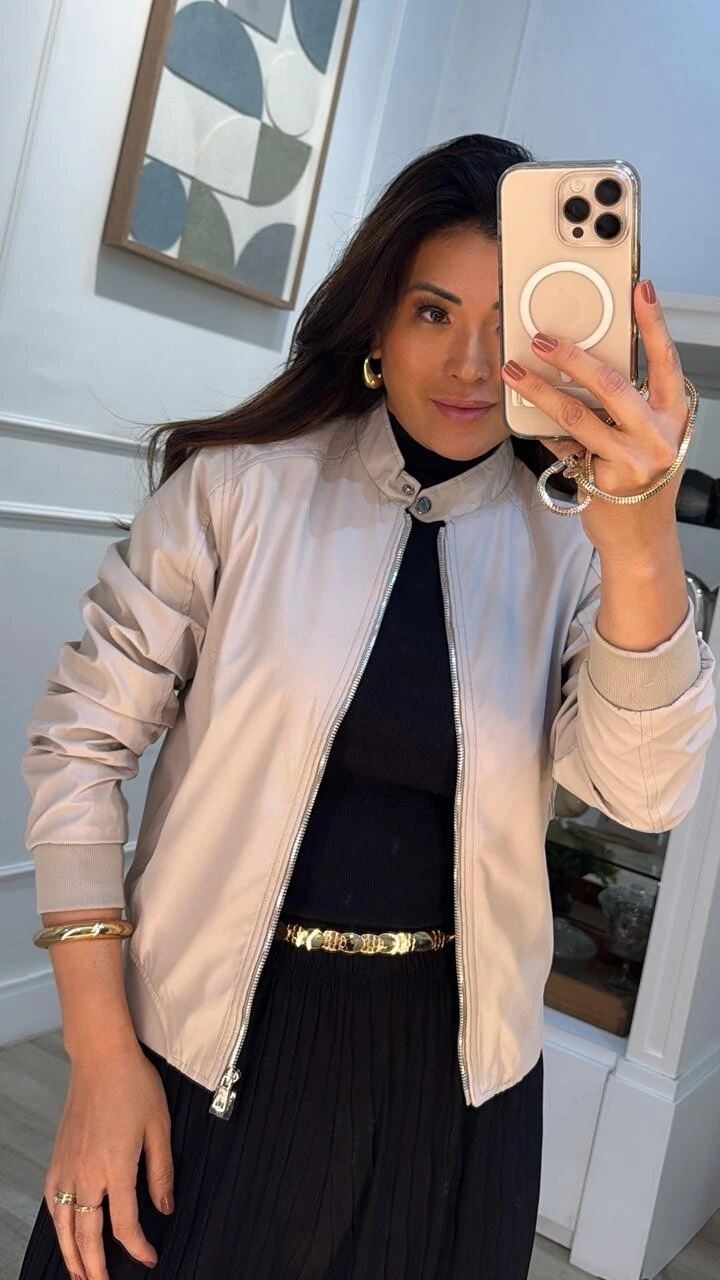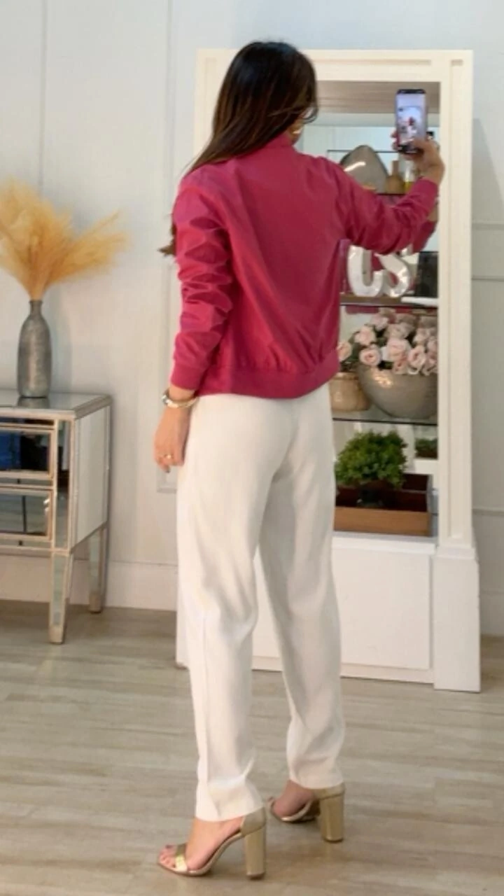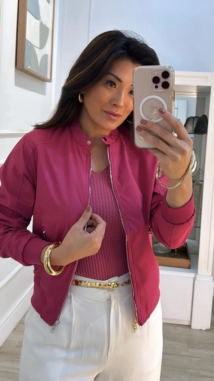 Jaqueta corta vento. Possui forro, gola alta, mangas longas, elástico nos punhos e barrado, pespontos pela peça, zíperes nos bolsos parte frontal.